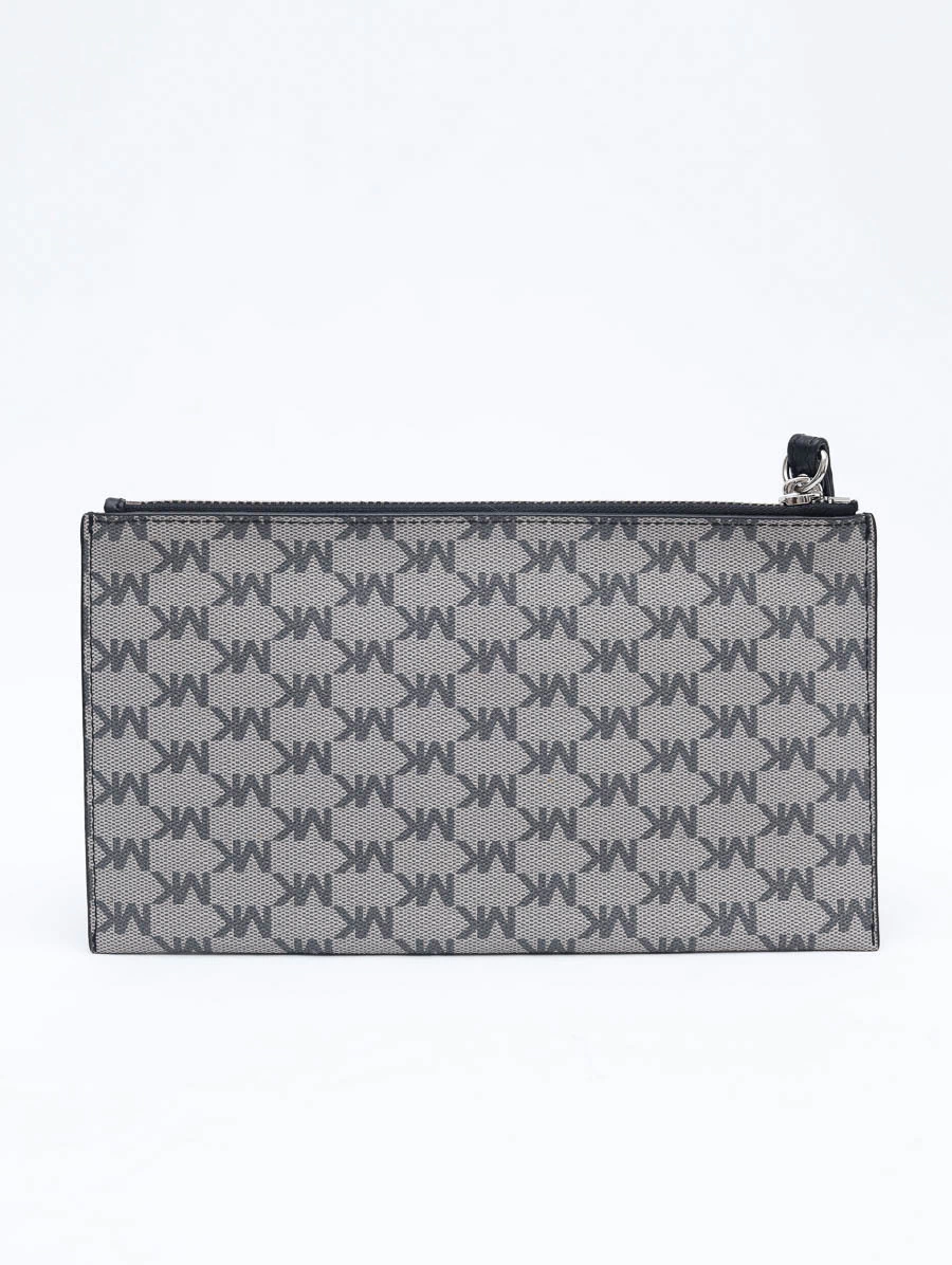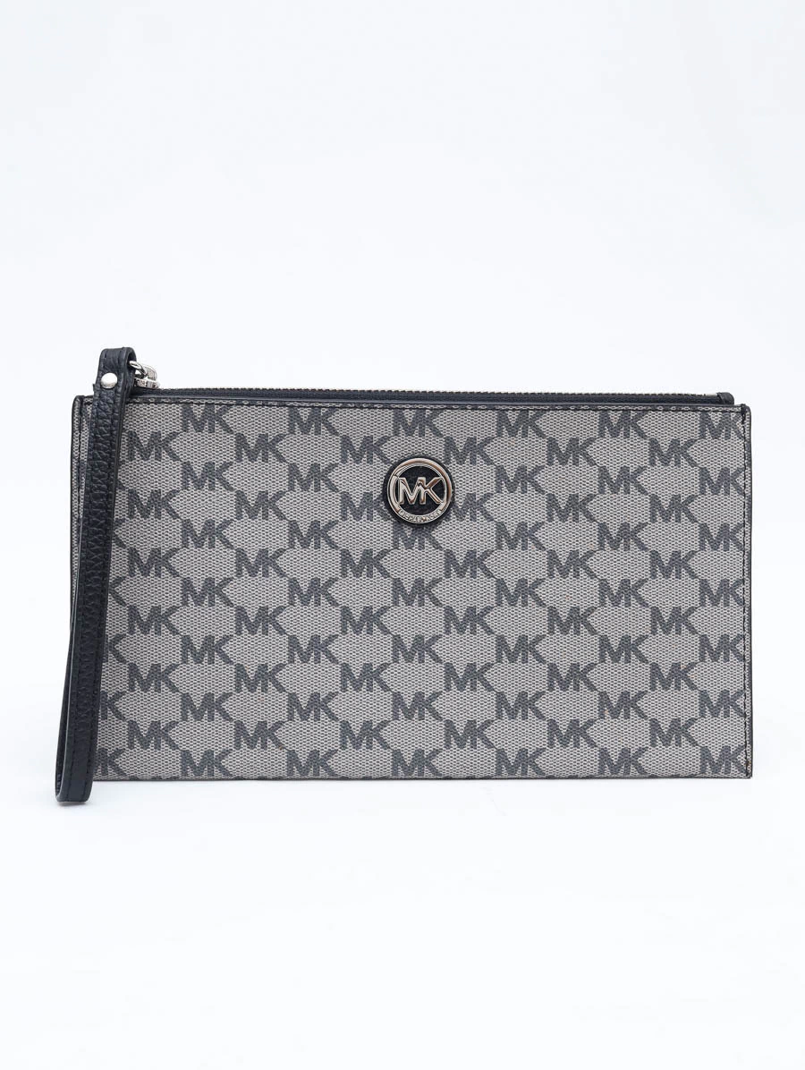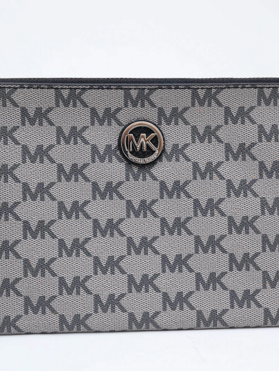 Clutch Michael Kors Monograma produzida em couro e canvas nas cores cinza e preto e ferragens prateadas. Apresenta uma alça de punhos, abertura com zíper e compartimento único com um bolso aberto e seis slots para cartões.