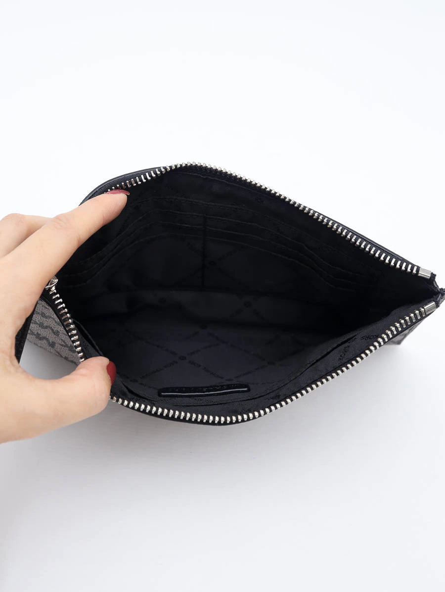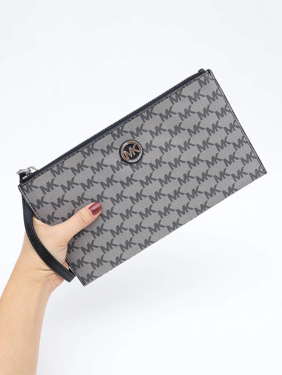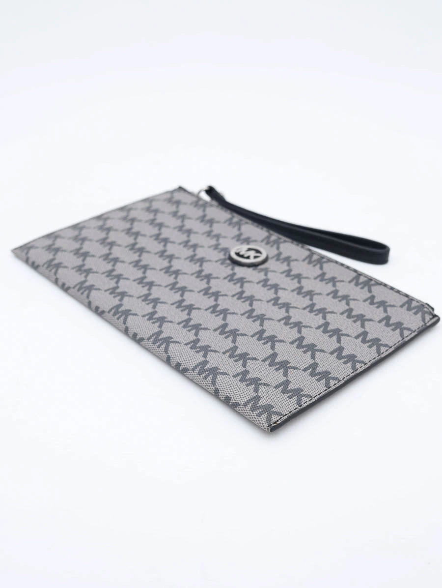 Clutch Michael Kors Monograma produzida em couro e canvas nas cores cinza e preto e ferragens prateadas. Apresenta uma alça de punhos, abertura com zíper e compartimento único com um bolso aberto e seis slots para cartões.