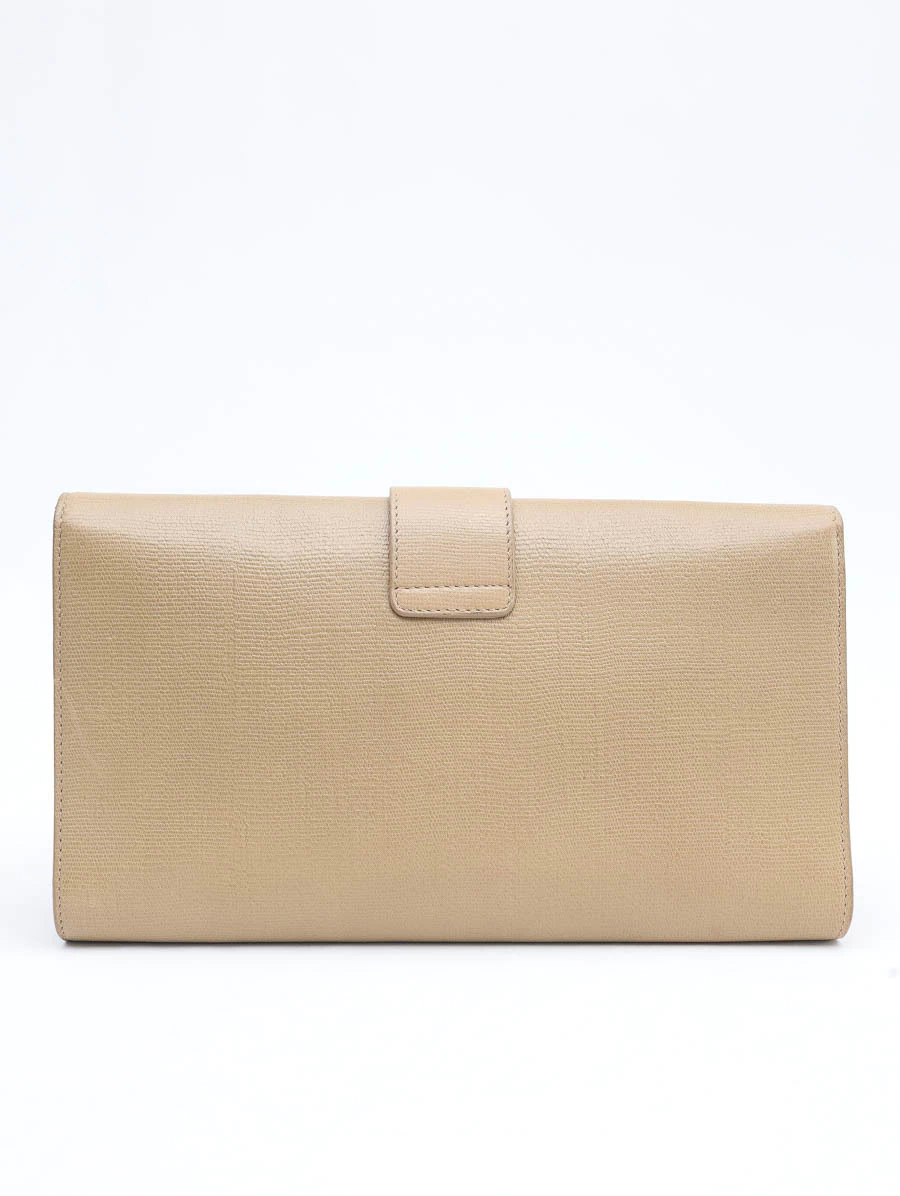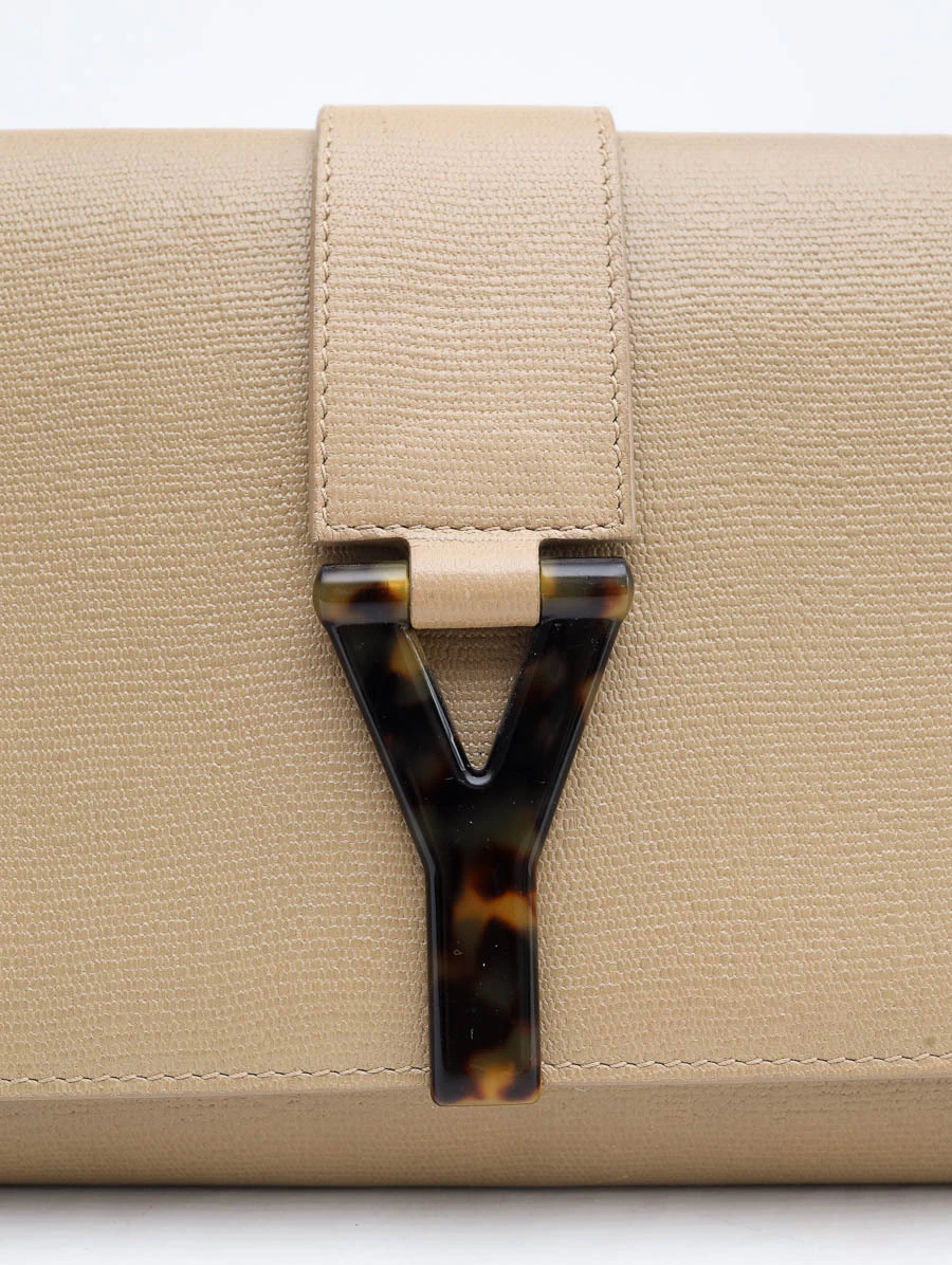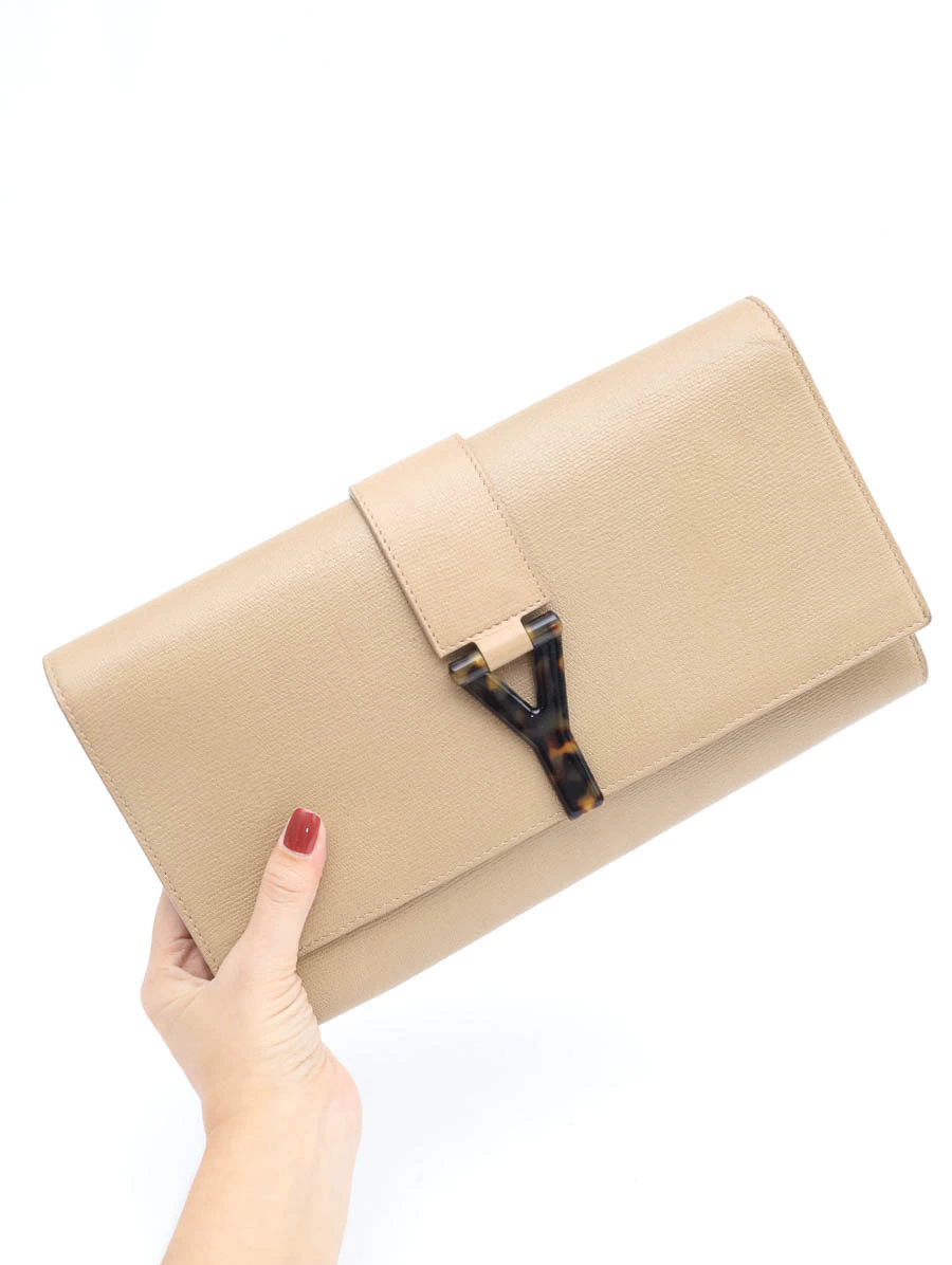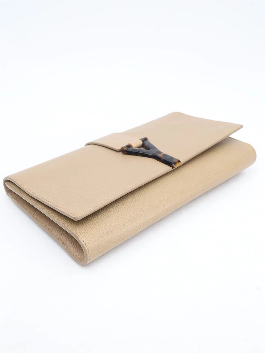 A Clutch Yves Saint Laurent Ligne Y é a definição de elegância versátil, ideal para eventos, jantares, festas ou para adicionar um toque de sofisticação ao seu look casual com jeans. Feita em couro bege envernizado, possui design estruturado e acabamento impecável, além de um espaço interno aveludado, perfeito para acomodar celular, chaves, maquiagem e documentos pessoais. Na parte frontal a logo Y aparece em animal print.