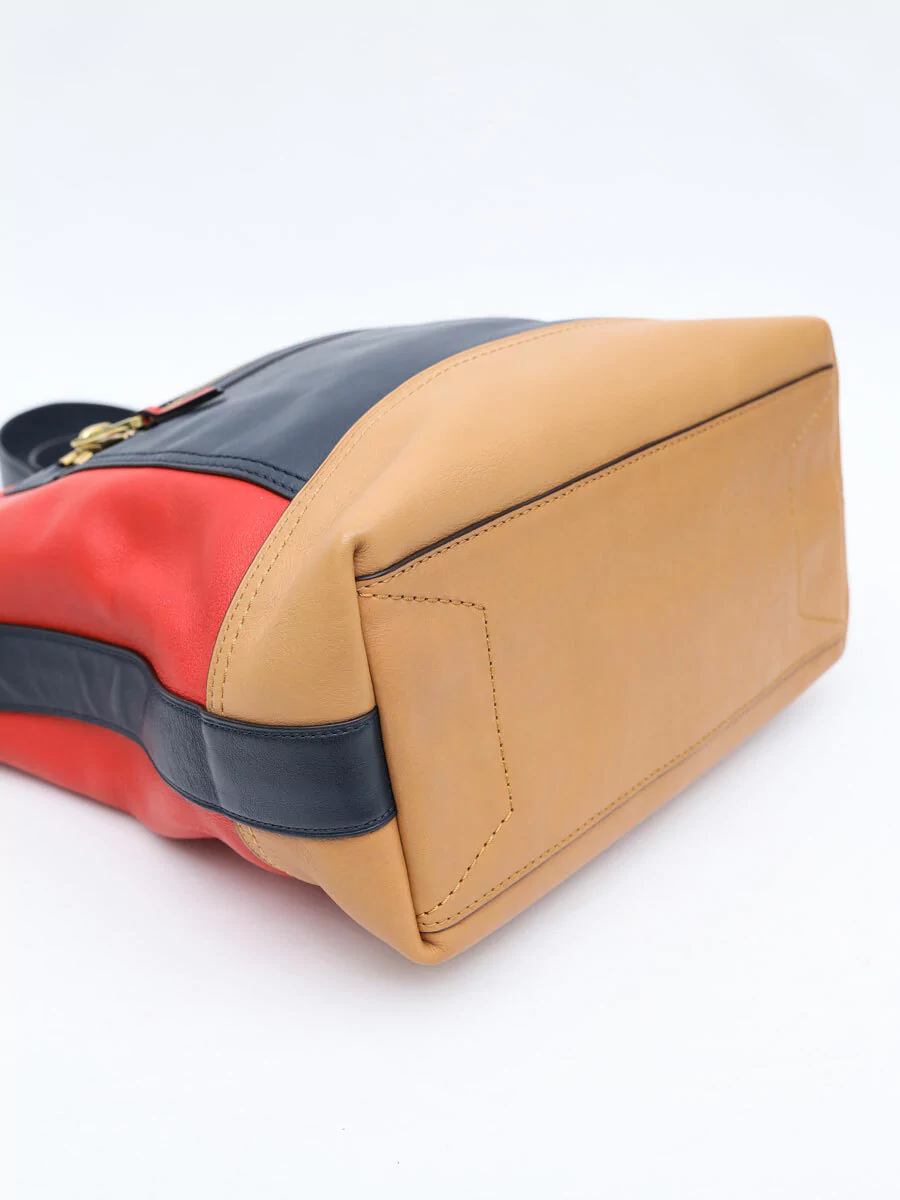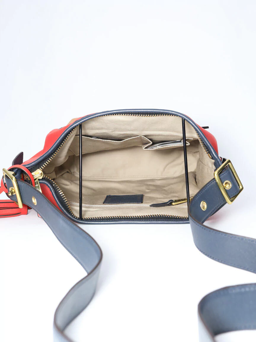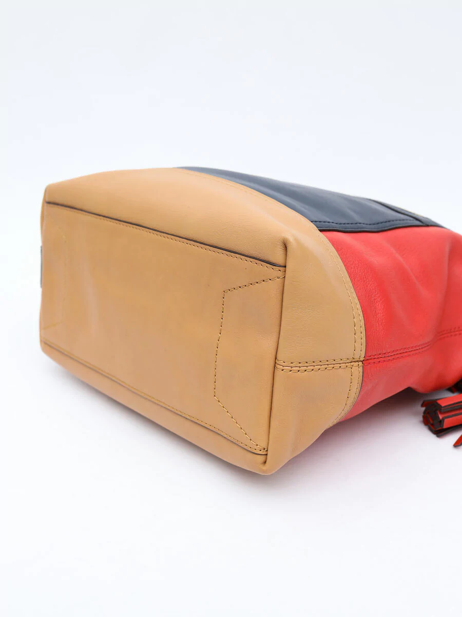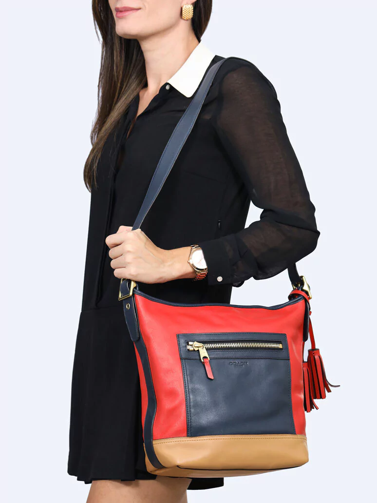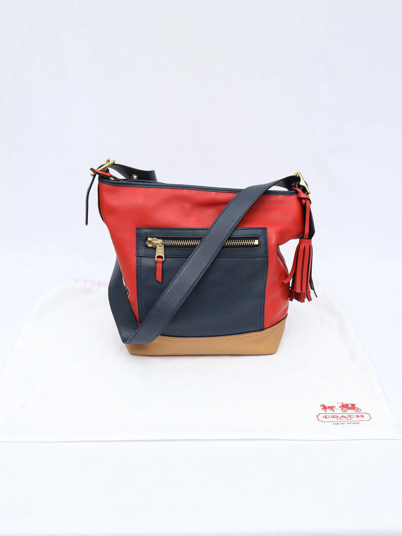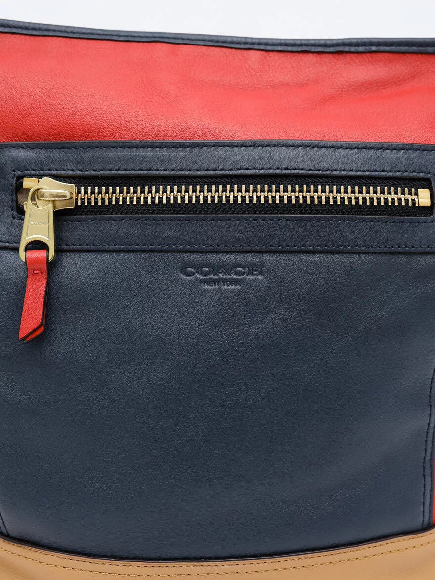 Bolsa Autêntica Coach Multicolor Hobo Crossbody produzida em couro nas cores azul, vermelha e caramelo com ferragens douradas. Apresenta um bolso frontal com zíper, alça longa com ajuste de comprimento e abertura superior com zíper. Seu interior em nylon muito espaçoso conta com um bolso com zíper e dois bolsos abertos.