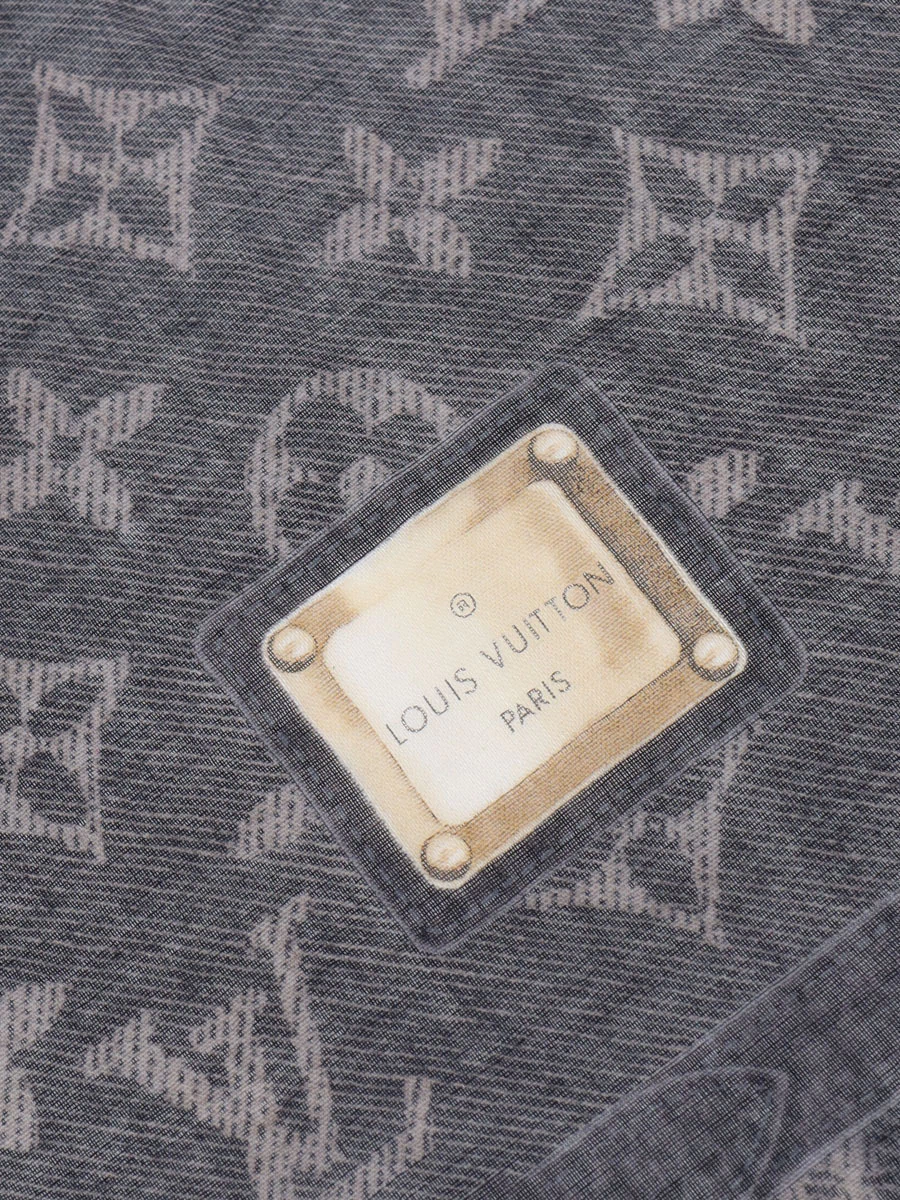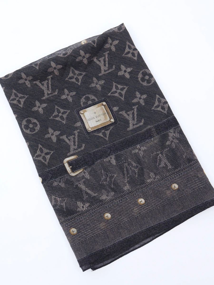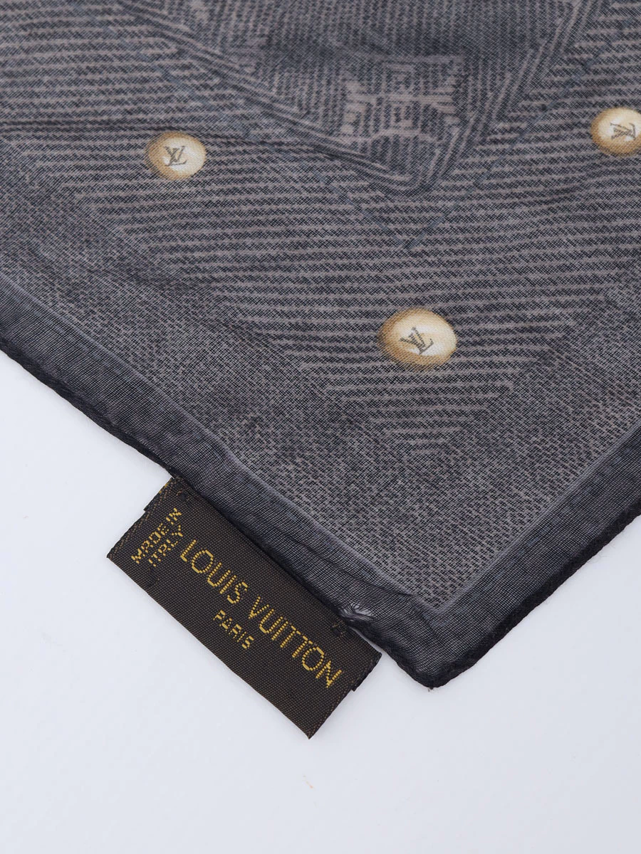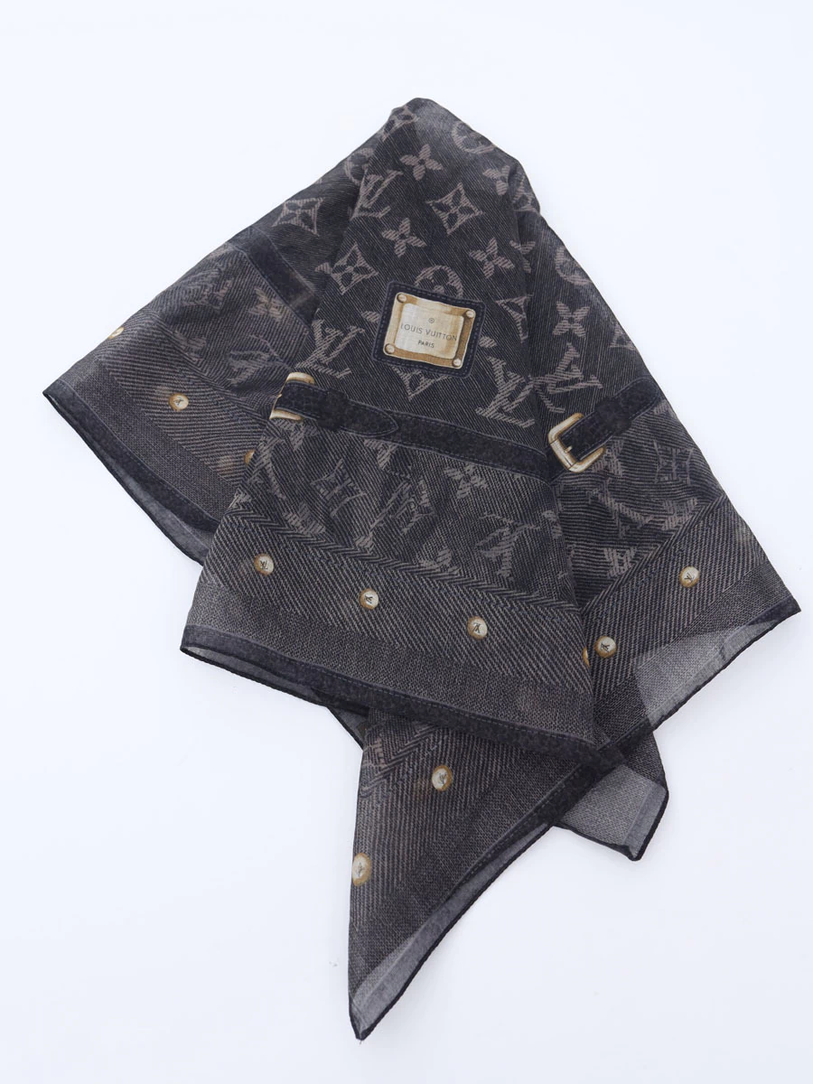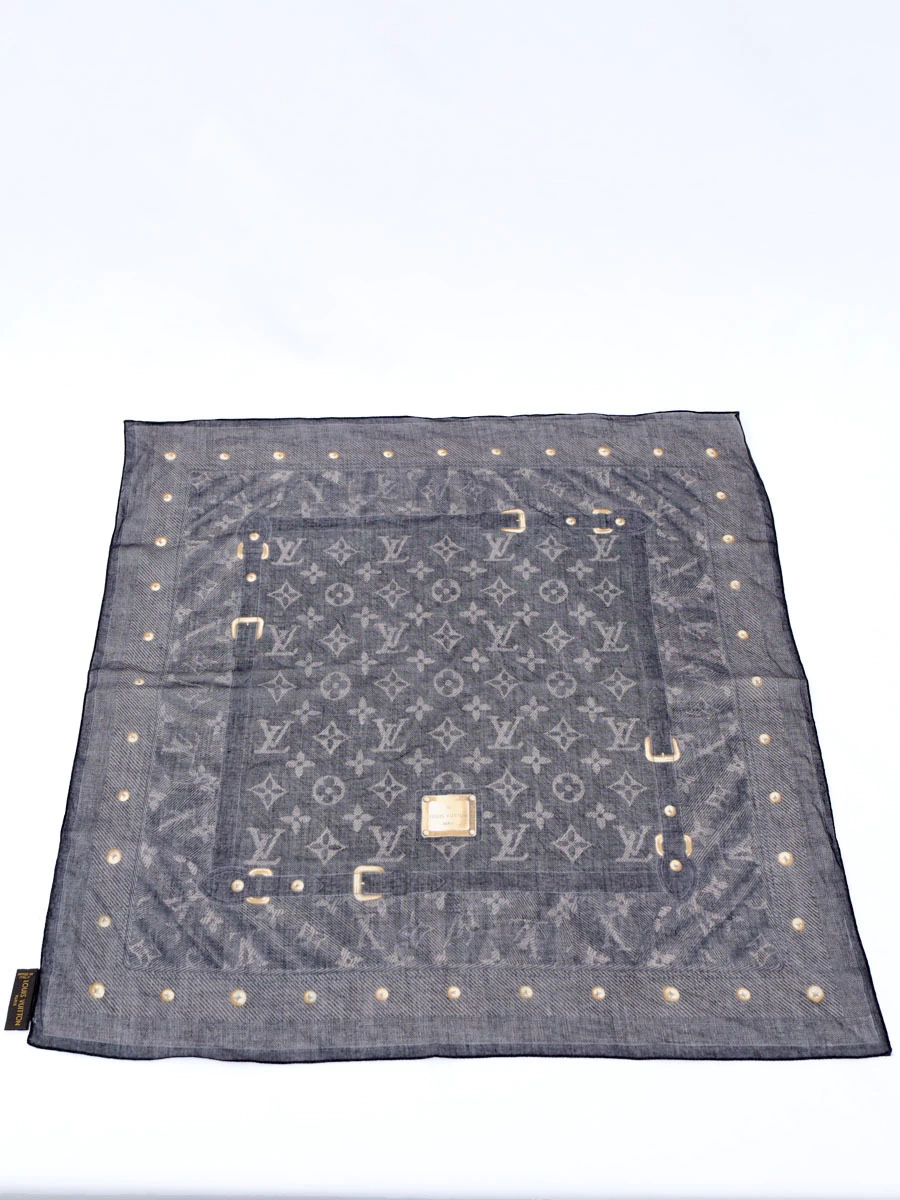 Lenço Original Louis Vuitton Monogram produzido na Itália com sua composição 100% em cotton com transparência, tamanho 54 cm x 54 cm, estampado com desenhos monogramas clássicos LV, canelado com tons preto e cinza, adornado com desenho de cintas com fivelas e placa clássica da Louis Vuitton.