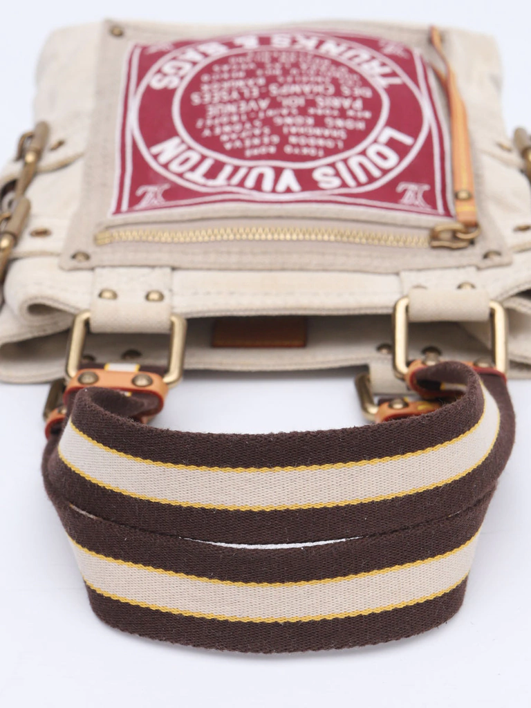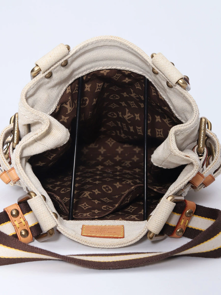O material em lona foi totalmente higienizado e se encontra limpo, bonito e sem desgastes, com uma sútil manchinha na parte de trás e pequenas marquinhas de uso. Os detalhes em couro estão em excelente estado de conservação. O interior está limpo e bonito. Os metais estão muito conservados.