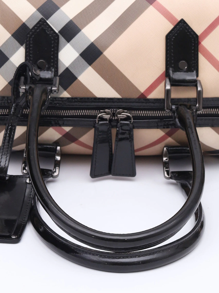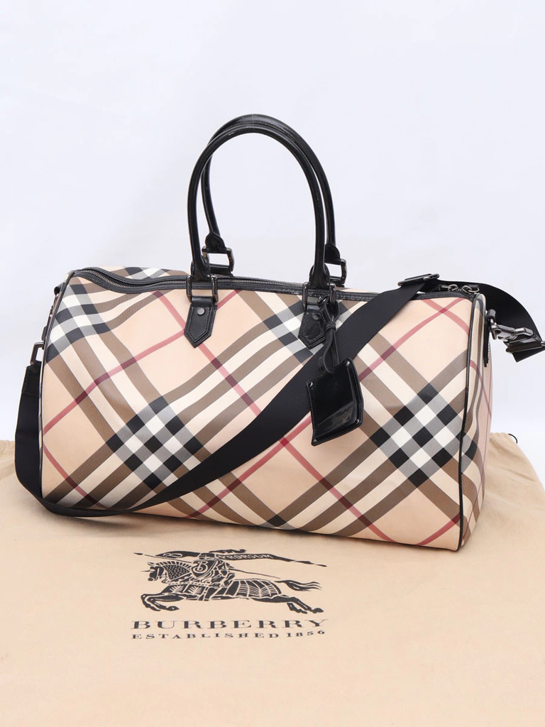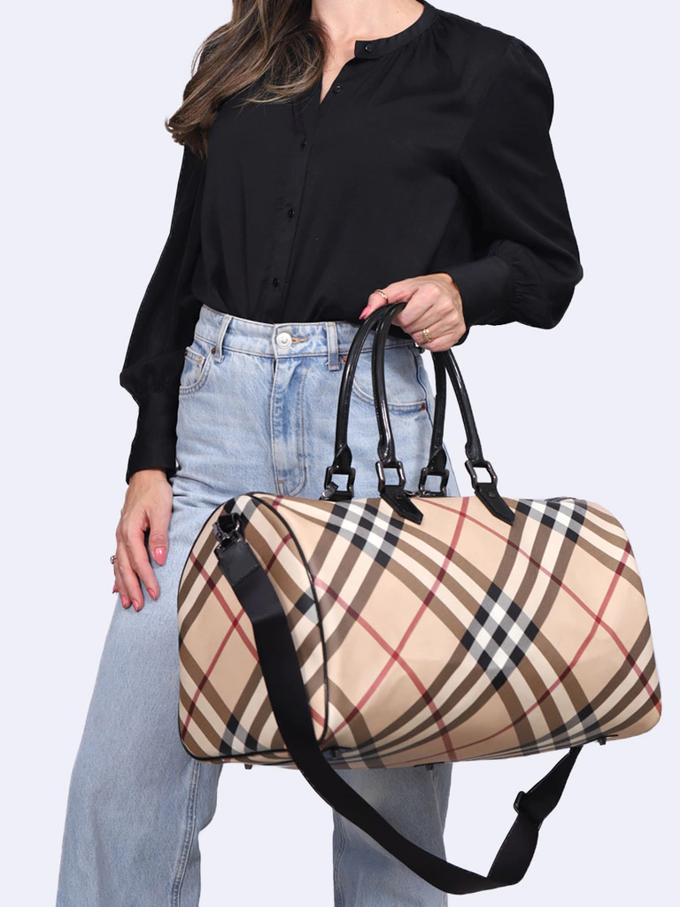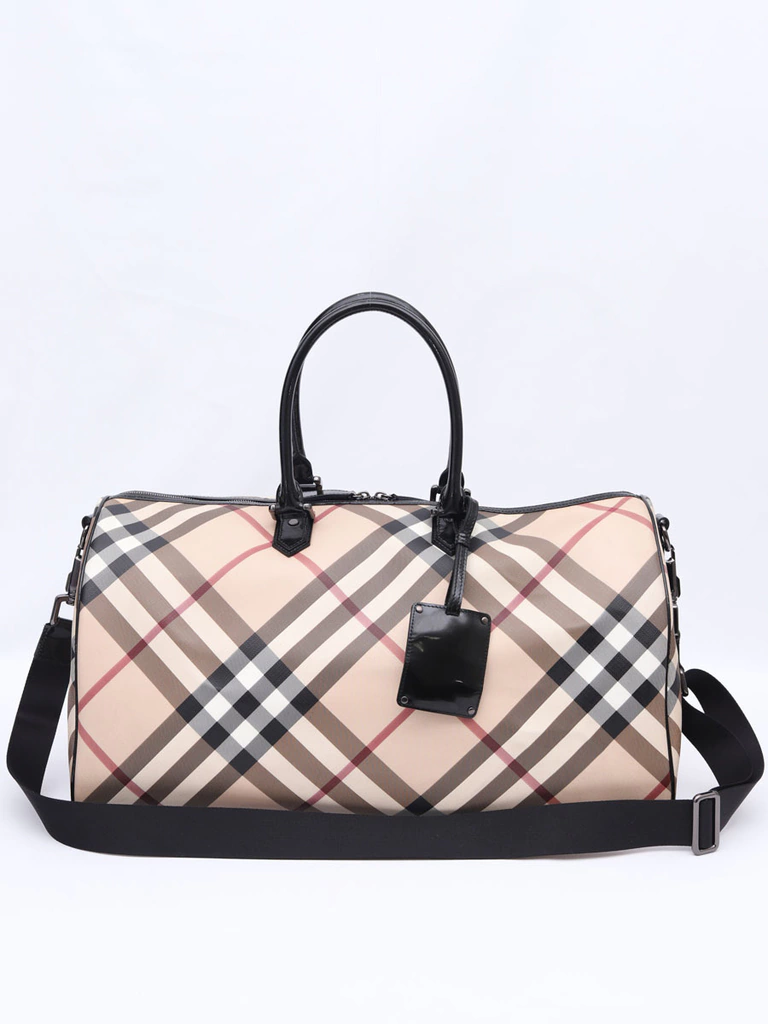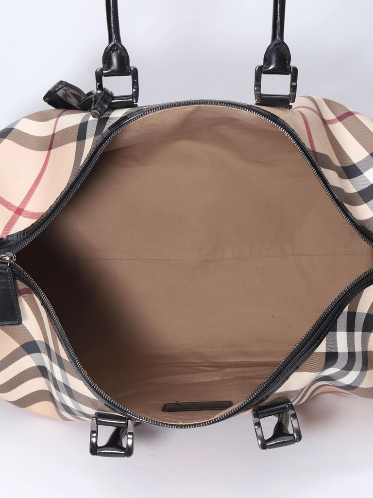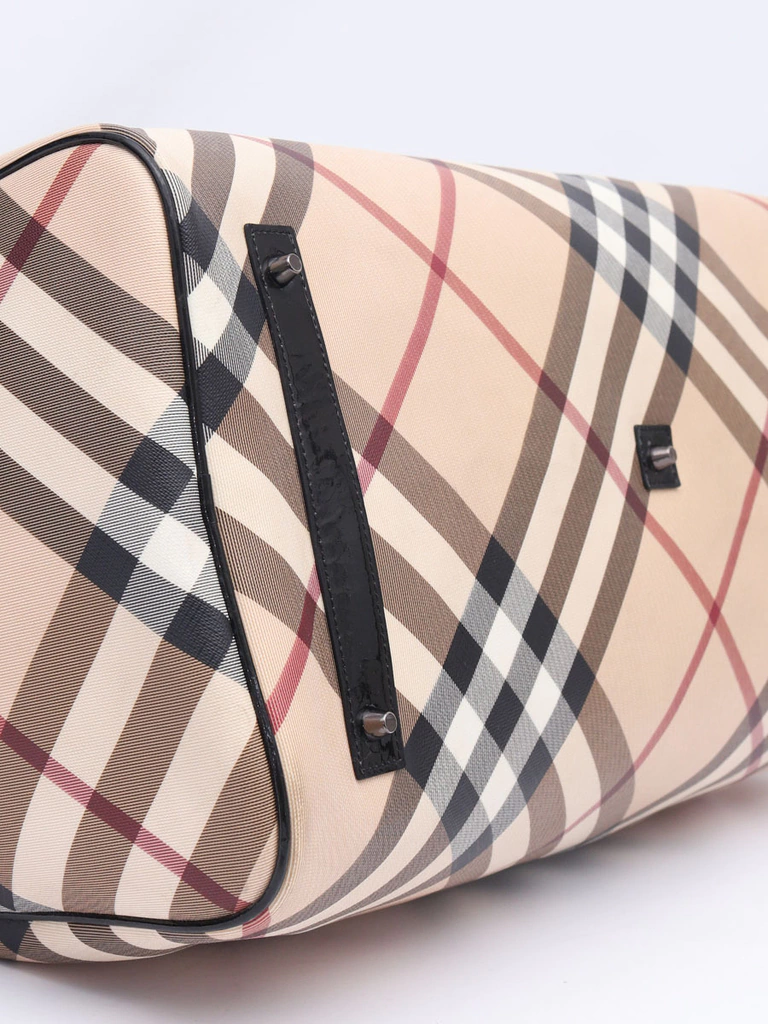 Mala Original Burberry Super Nova Check é uma mala perfeita para viajar em grande estilo. Elegante e muito espaçosa, apresenta uma alça longa removível, muito confortável e com ajuste de comprimento, duas alças de mão e detalhes em couro envernizado preto. Com uma prática abertura superior através de dois zíperes com puxadores em couro, apresenta interior com forro jacquard e um espaçoso bolso interno com zíper.