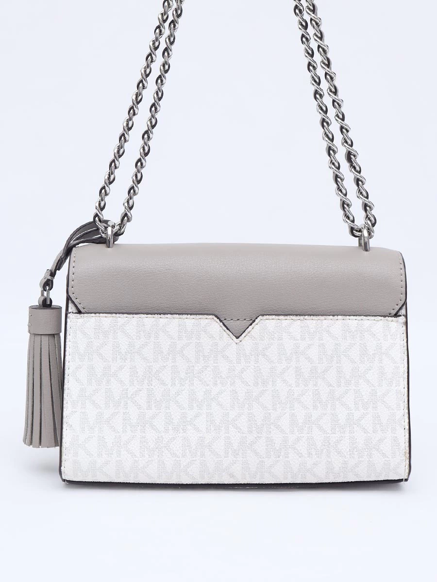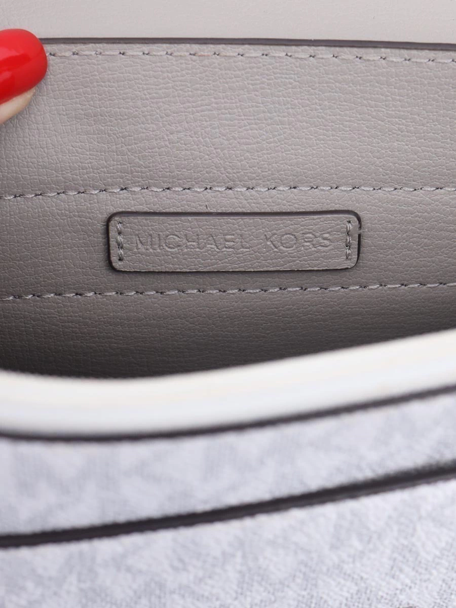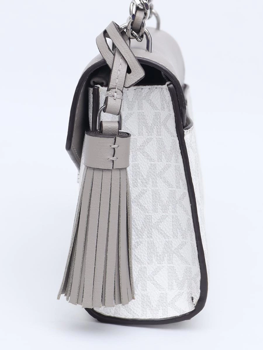 Charmosa e super sofisticada, essa autêntica bolsa Michael Kors Signature Small Flap é produzida com em lona sintética canvas estampada com logos MK e uma aba estilo flap em couro cinza, alças em correntes e um belíssimo pingente em franjas.