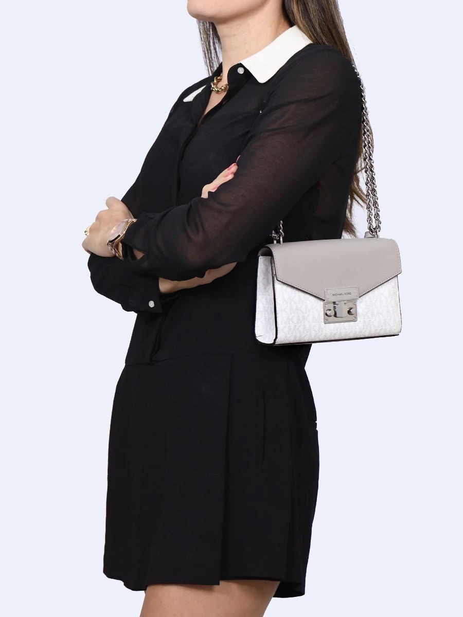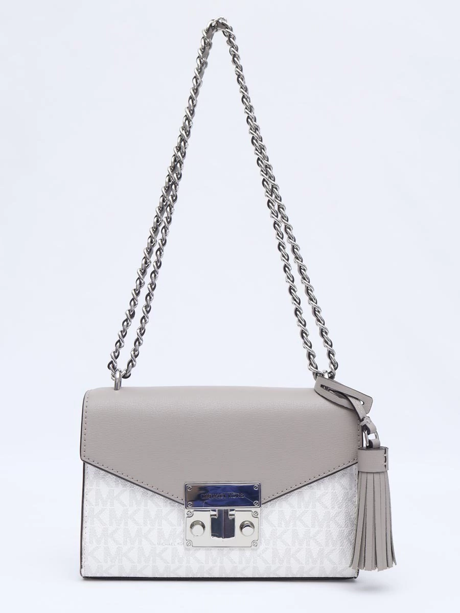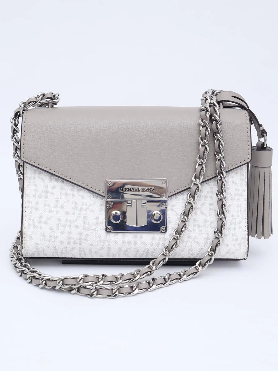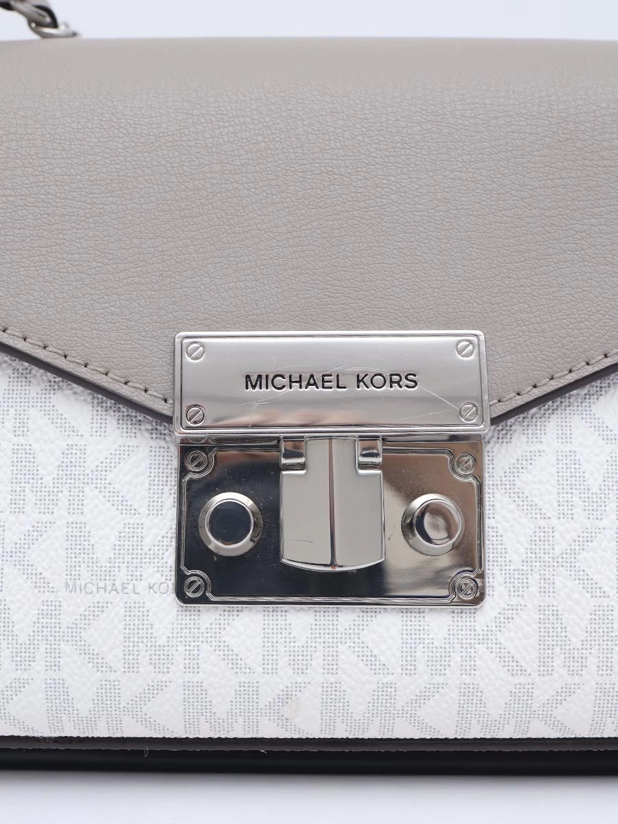Charmosa e super sofisticada, essa autêntica bolsa Michael Kors Signature Small Flap é produzida com em lona sintética canvas estampada com logos MK e uma aba estilo flap em couro cinza, alças em correntes e um belíssimo pingente em franjas.