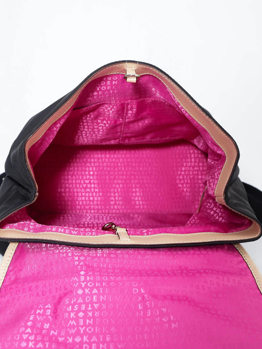 Mochila Original Kate Spade Nylon Preta produzida em Nylon preto e detalhes em couro bege. O modelo apresenta alças com regulagem, abertura com fecho magnético e maravilhoso interior rosa estampado com o nome da marca com um bolso grande com zíper e dois bolsos pequenos.