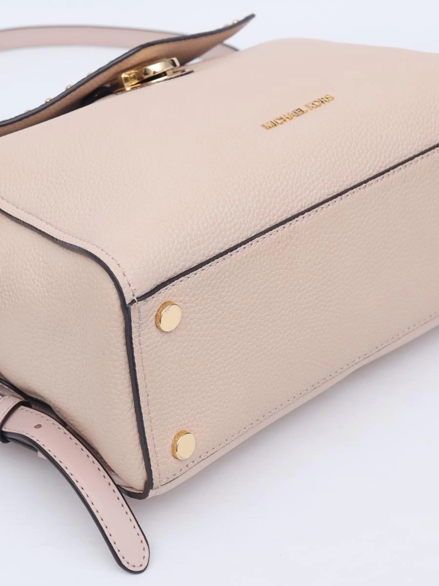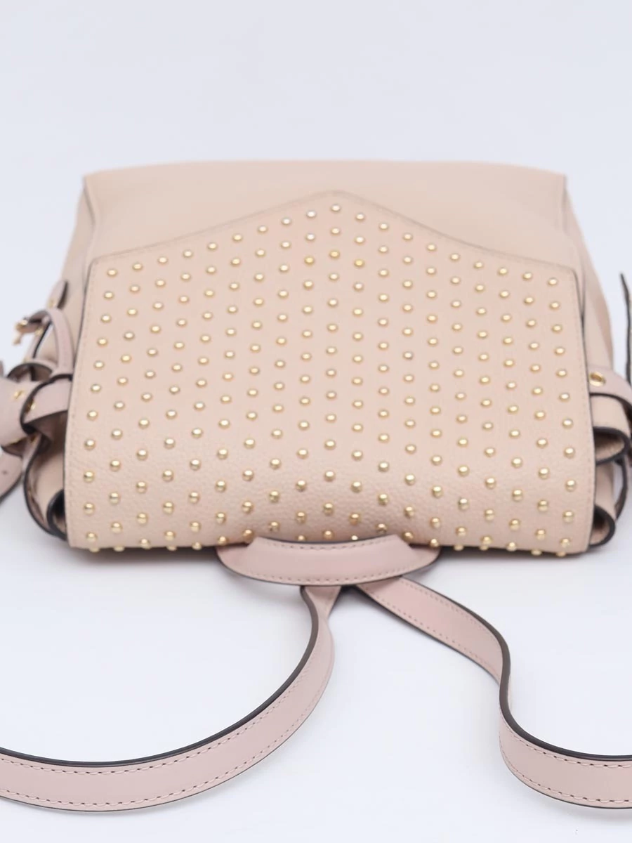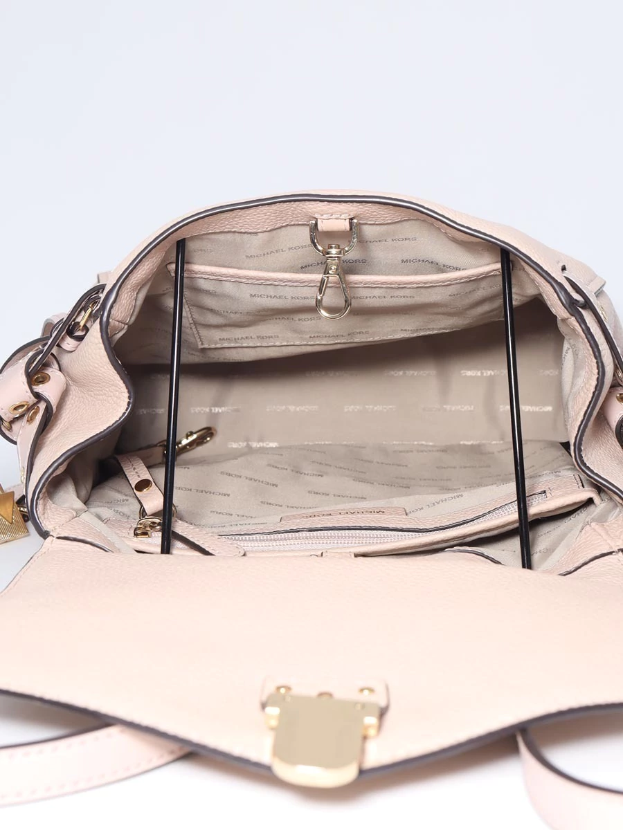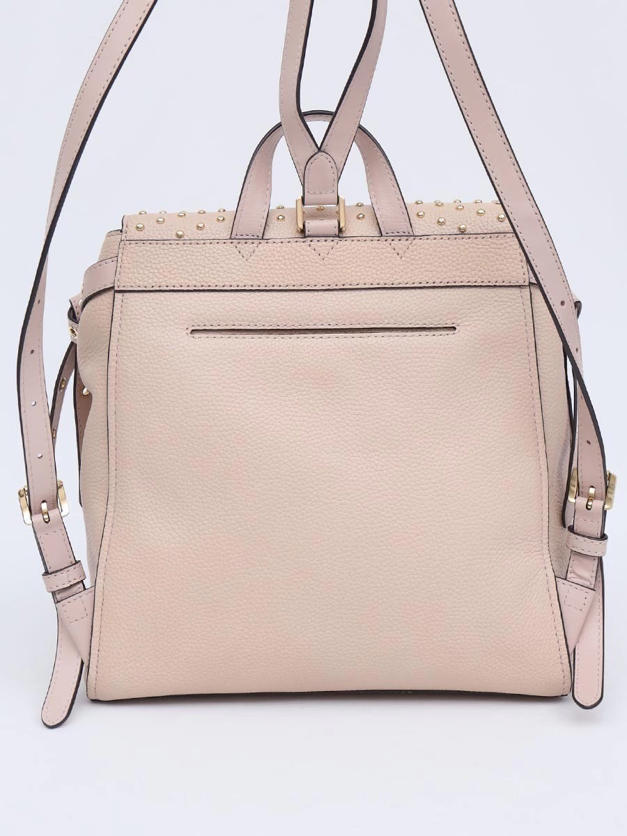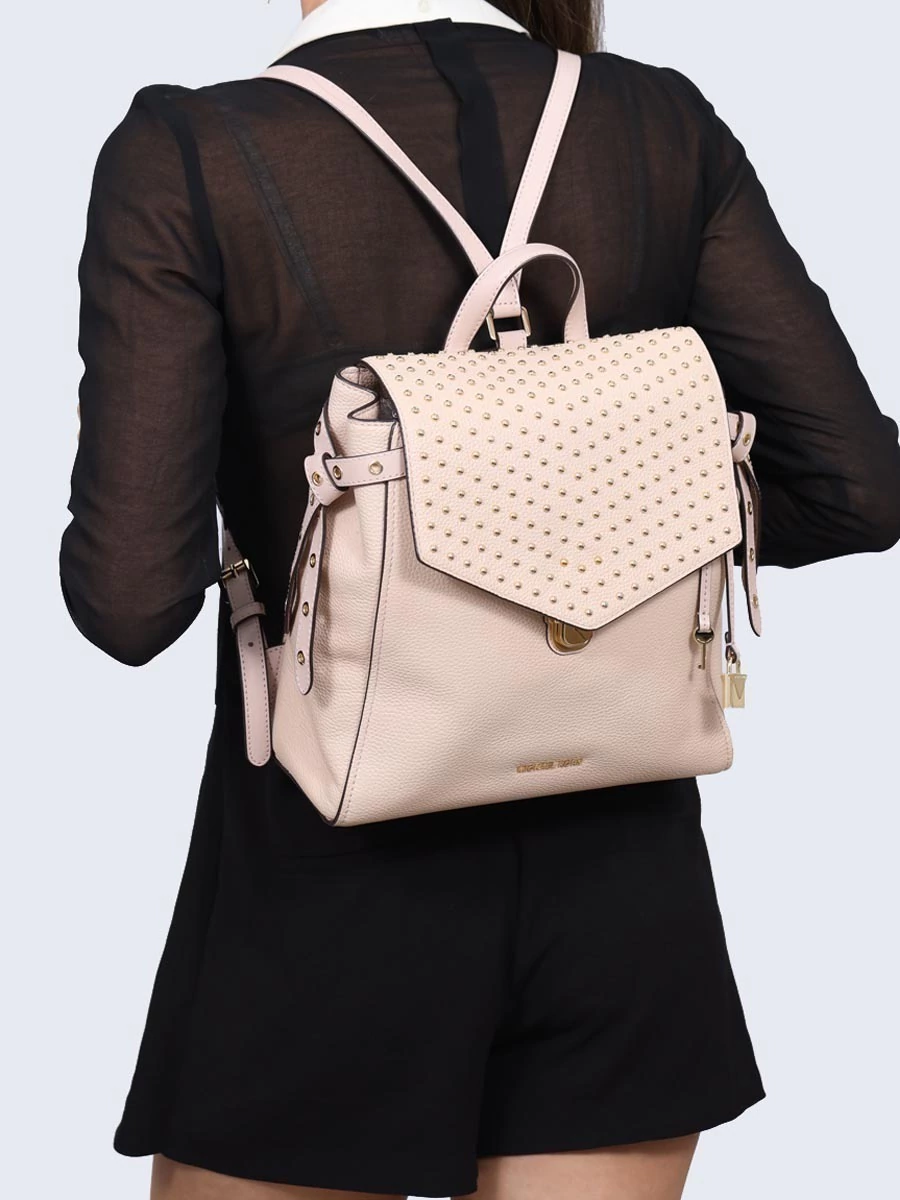 Mochila Autêntica MK Pink Leather Spikes no tamanho médio, produzida em couro com textura granulada e ferragens douradas. Apresenta abertura com aba flap, fecho de abertura oculto com botão de encaixe, um bolso na parte de trás, detalhes decorativos como cintas laterais e pingente com cadeado e chave. Seu interior produzido em nylon é amplo e apresenta um bolso com zíper, um bolso maior com capacidade para ipad e um bolso menor para documentos e cartões.