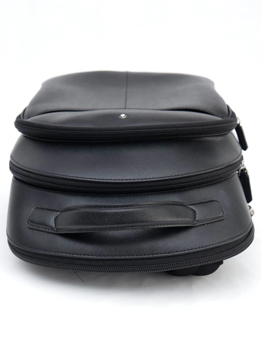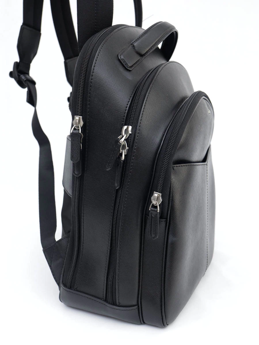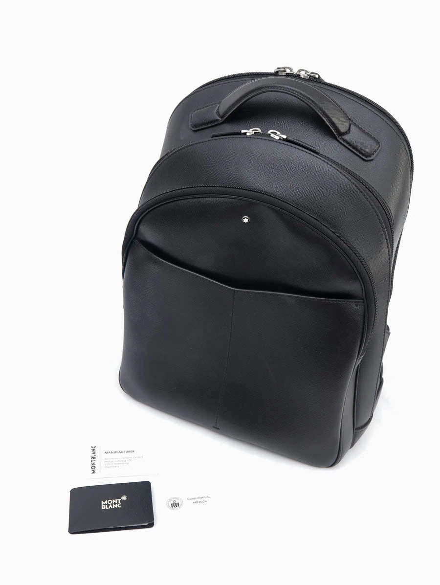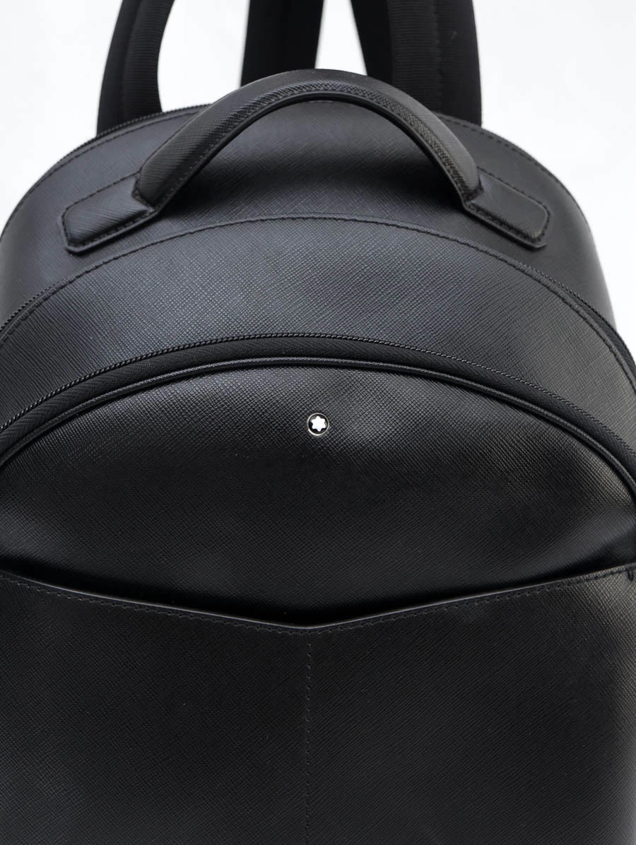 Mochila Original MontBlanc Média Sartorial produzida em couro na cor preta com metais pratas. Apresenta dois bolsos frontais, uma pequena alça de mão, duas alças de ombro com ajuste de comprimento, compartimento para notebook, compartimento principal com três bolsos internos e um compartimento frontal menor.