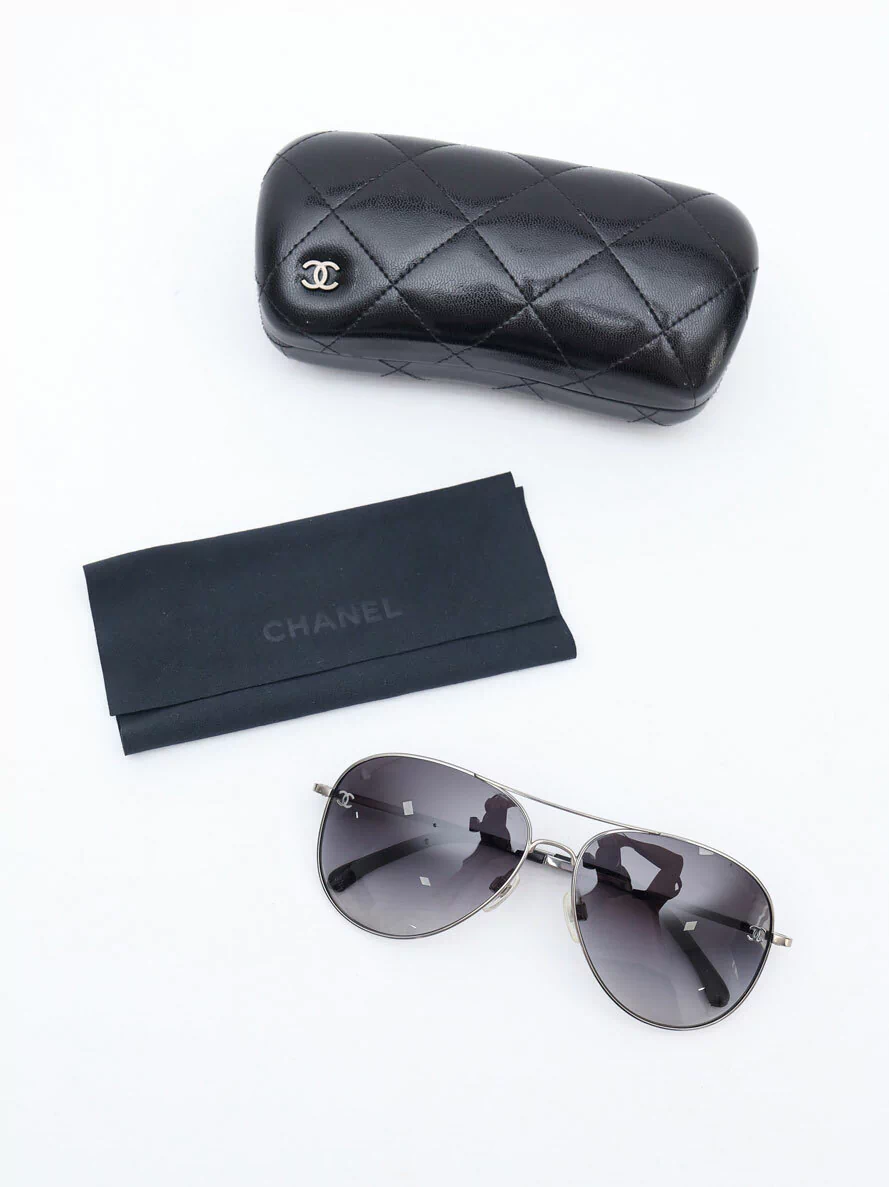 Óculos de Sol Original Chanel 4189-T-Qcom armação em metal na cor prata, lentes em degradê na cor preta, detalhe na ponta das hastes e logo Chanel nas laterais.