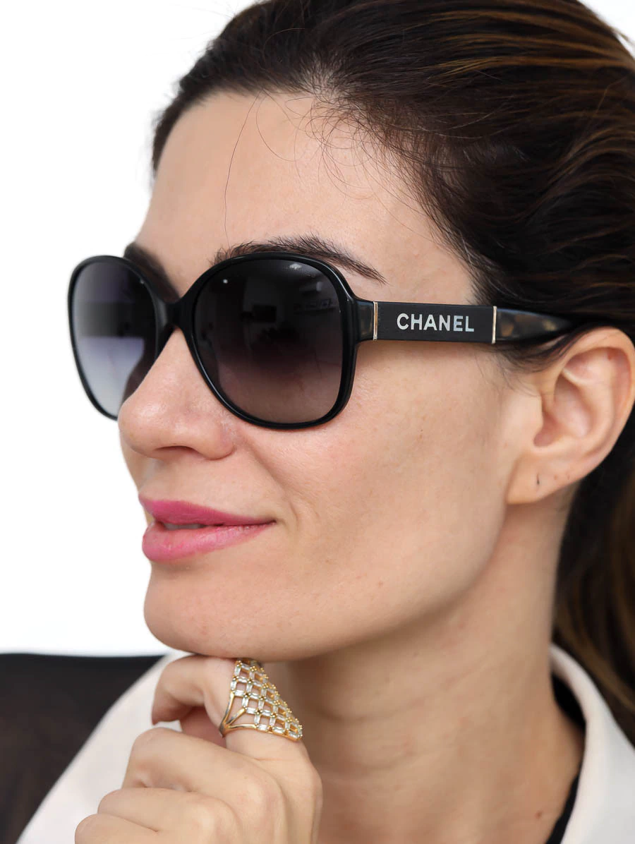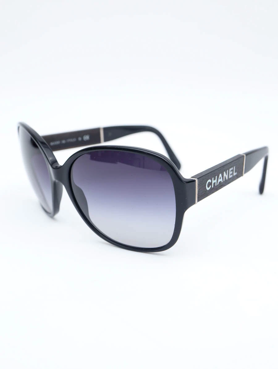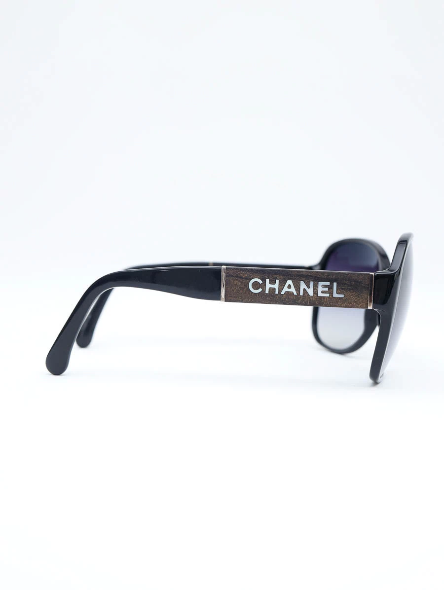 Óculos de Sol Chanel 5198-H com armação em acetato na cor preta e metais pratas. Apresenta lentes em degradê com um tom preto azulado e detalhes nas hastes em madeira com inscrição Chanel.
