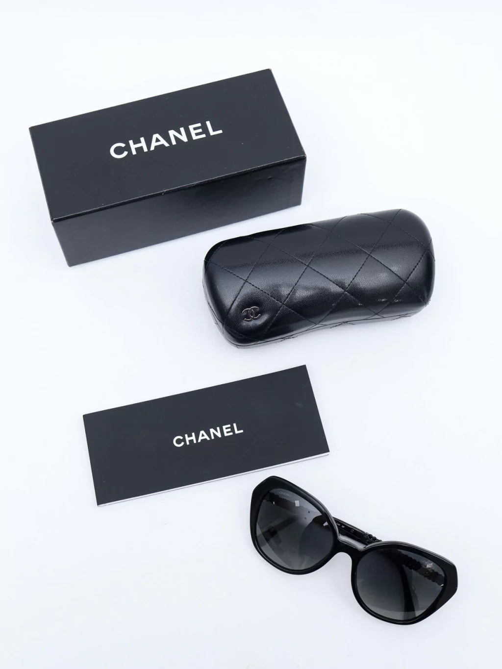 Óculos de Sol Original Chanel 5375-B com armação em acetato e lentes na cor preta, detalhes nas hastes com pedras brilhantes e logo Chanel. Em excelente estado de conservação, sem marcas de uso.