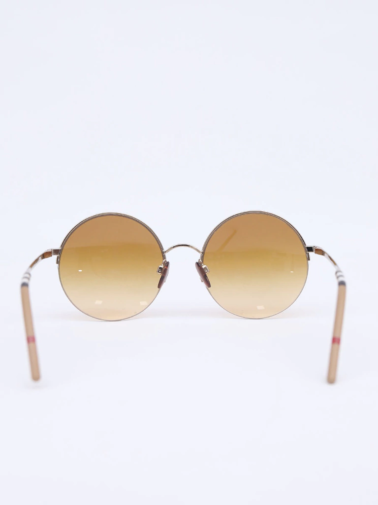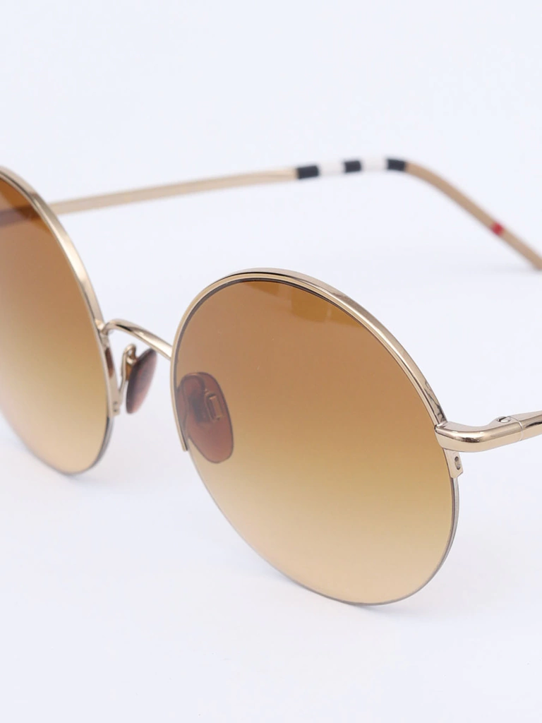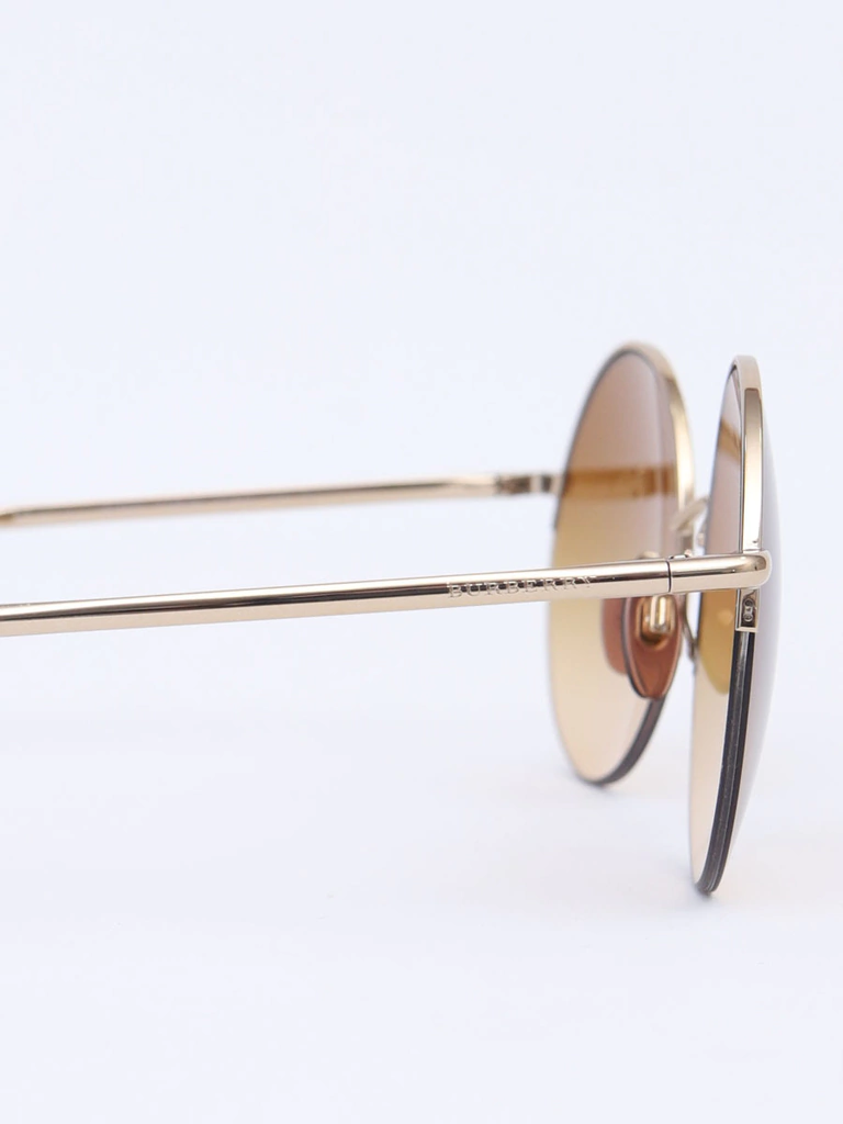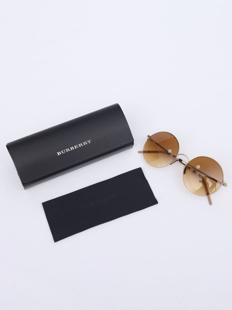 Óculos de Sol Autêntico Burberry B3101com armação em metal e lentes degradês arredondadas na cor marrom, apresenta metais dourados e hastes com estampa Burberry. Óculos sem sinais de uso e sem riscos na lente.