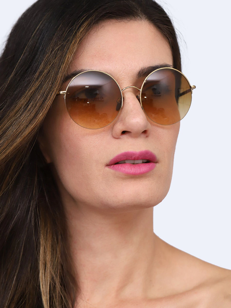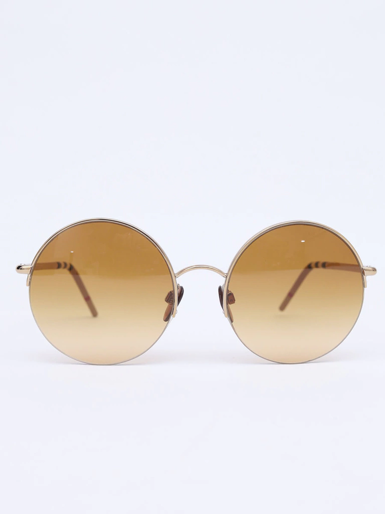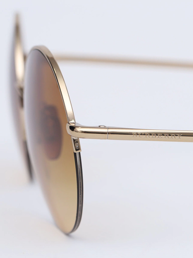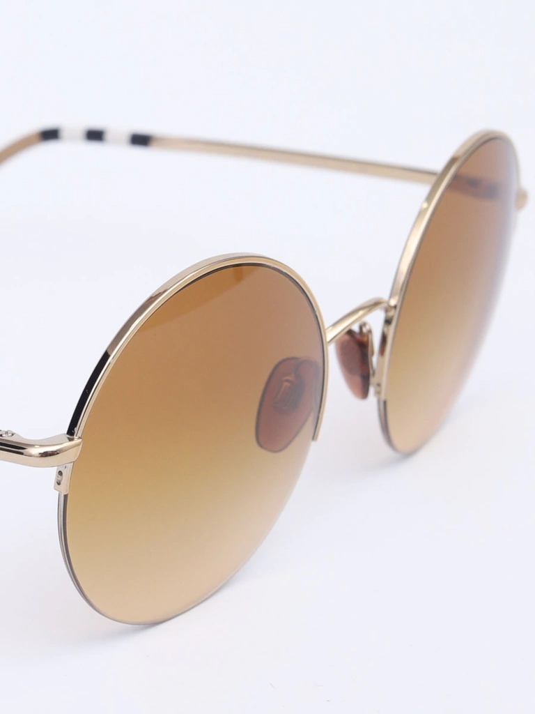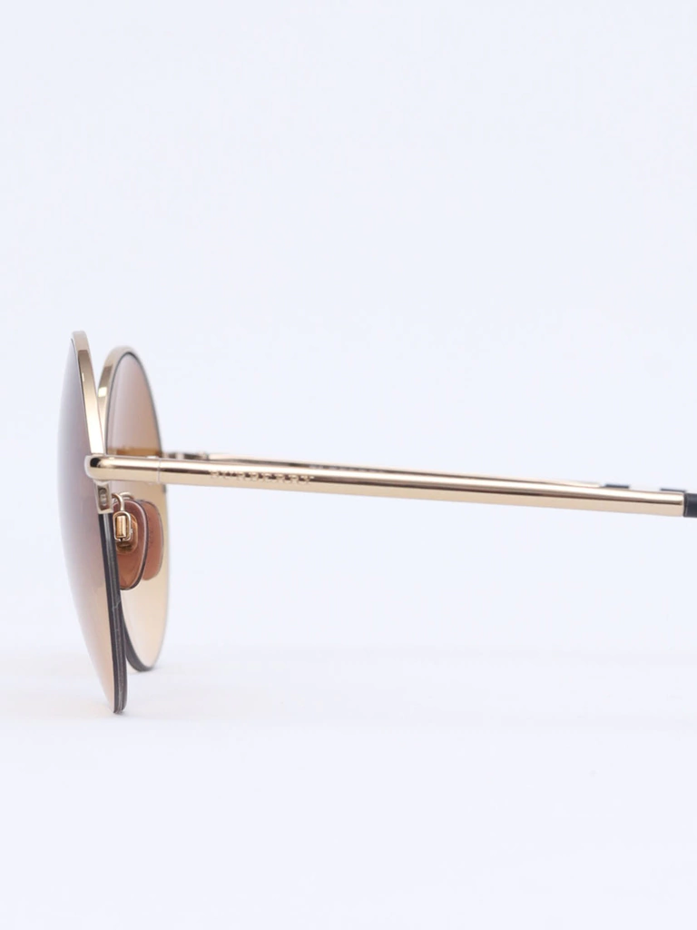 Óculos de Sol Autêntico Burberry B3101com armação em metal e lentes degradês arredondadas na cor marrom, apresenta metais dourados e hastes com estampa Burberry. Óculos sem sinais de uso e sem riscos na lente.
