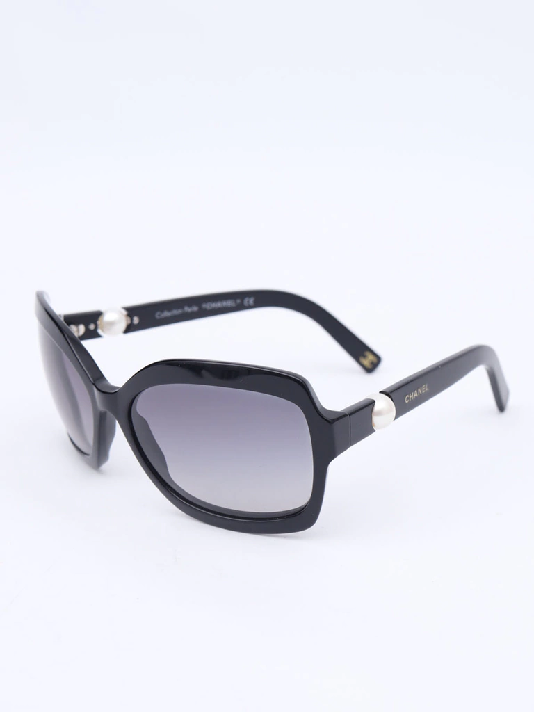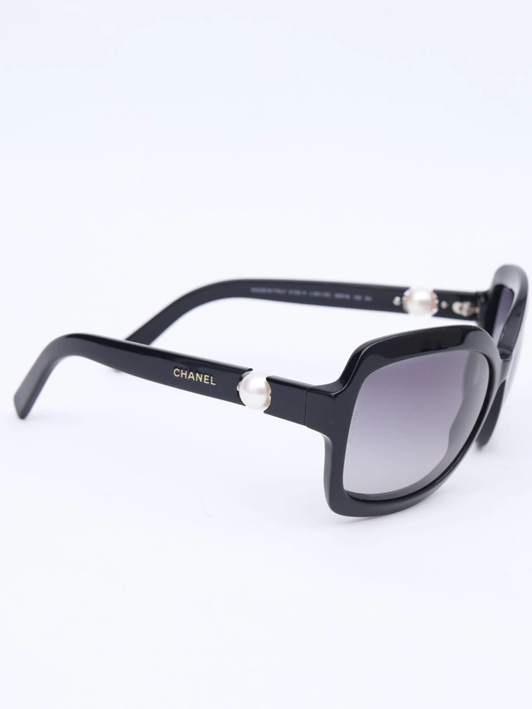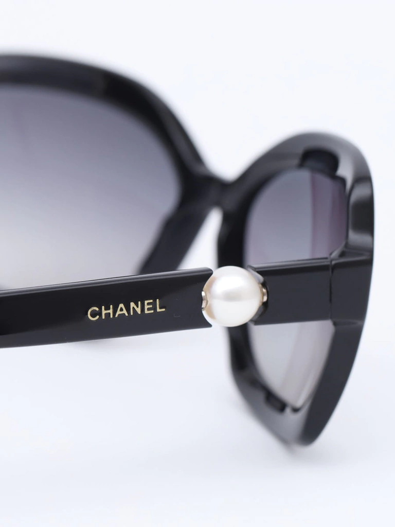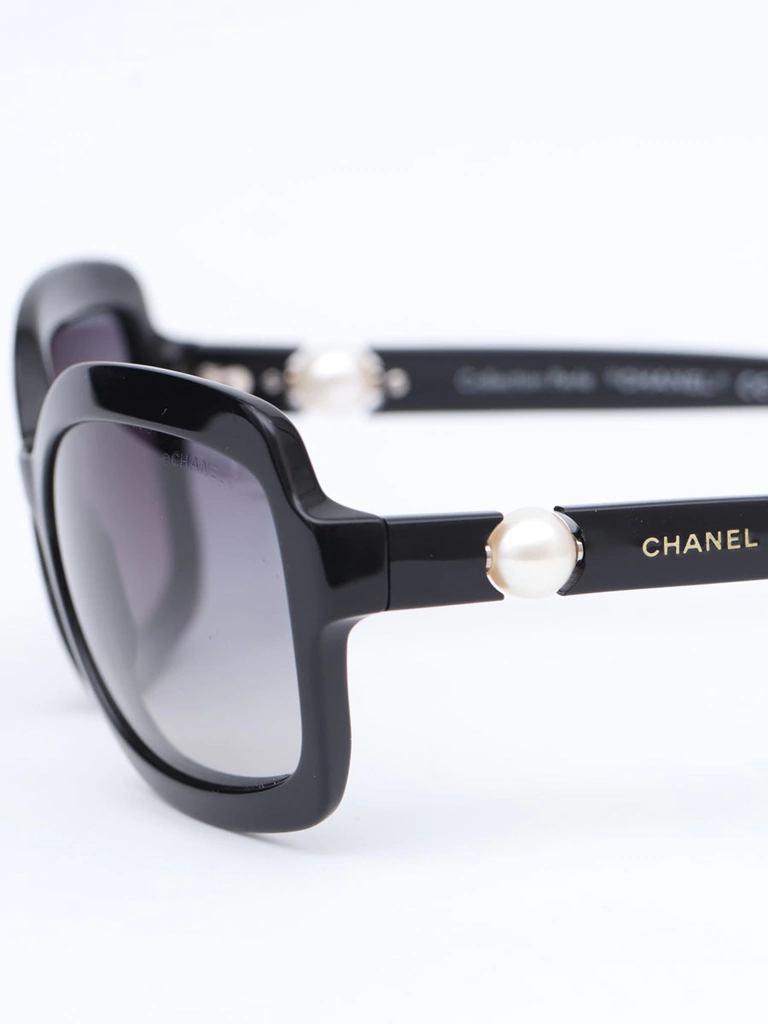 Autêntico Óculos de Sol Chanel 5132-Hcom armação em acetato preto, lentes pretas degrades, hastes com detalhe decorativo de perolas e logo da Chanel. Seminovo em excelente estado de conservação, sem riscos na lente e com leves marquinhas de uso nas hastes.