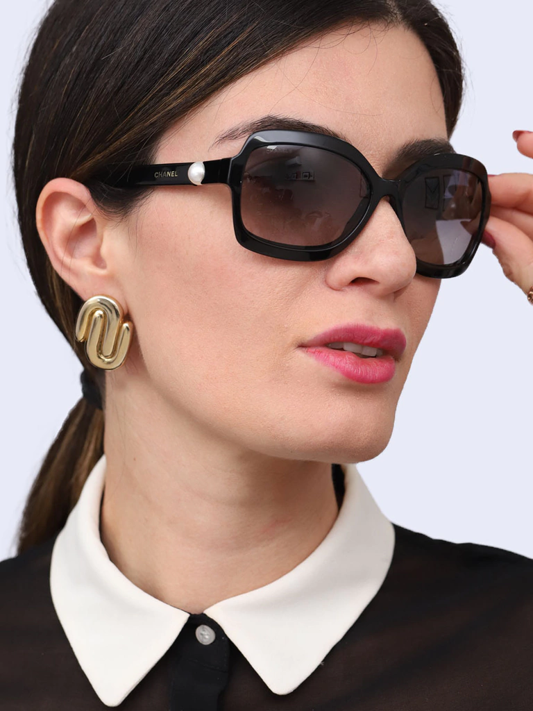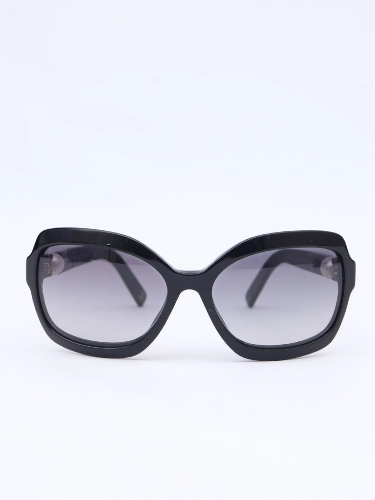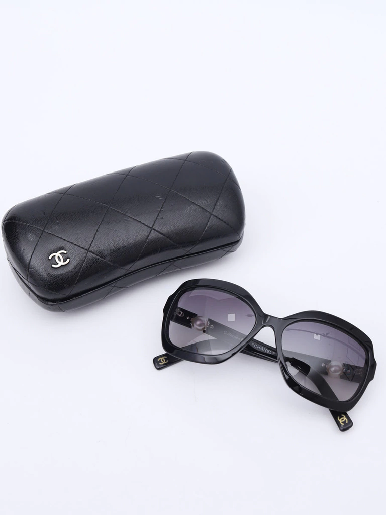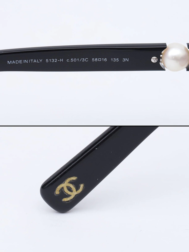Autêntico Óculos de Sol Chanel 5132-Hcom armação em acetato preto, lentes pretas degrades, hastes com detalhe decorativo de perolas e logo da Chanel. Seminovo em excelente estado de conservação, sem riscos na lente e com leves marquinhas de uso nas hastes.