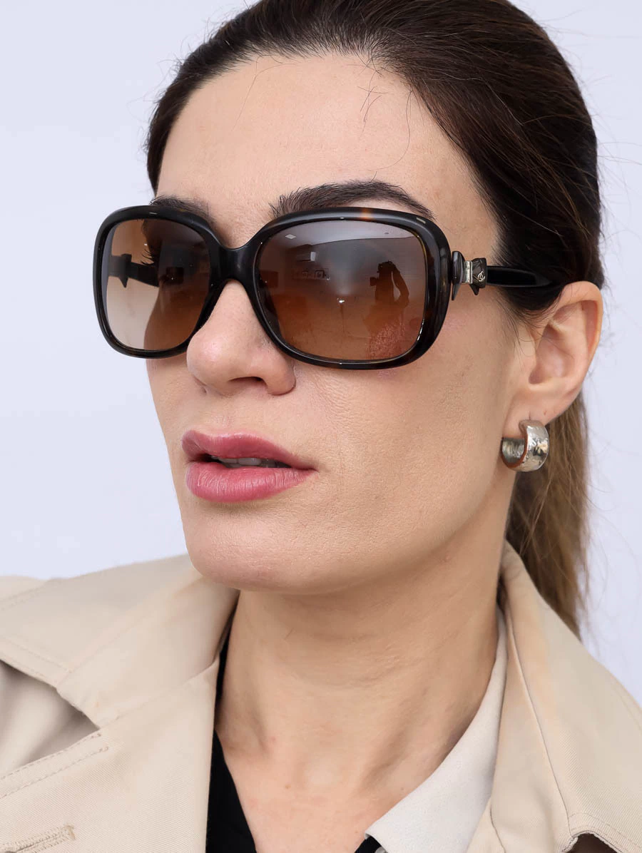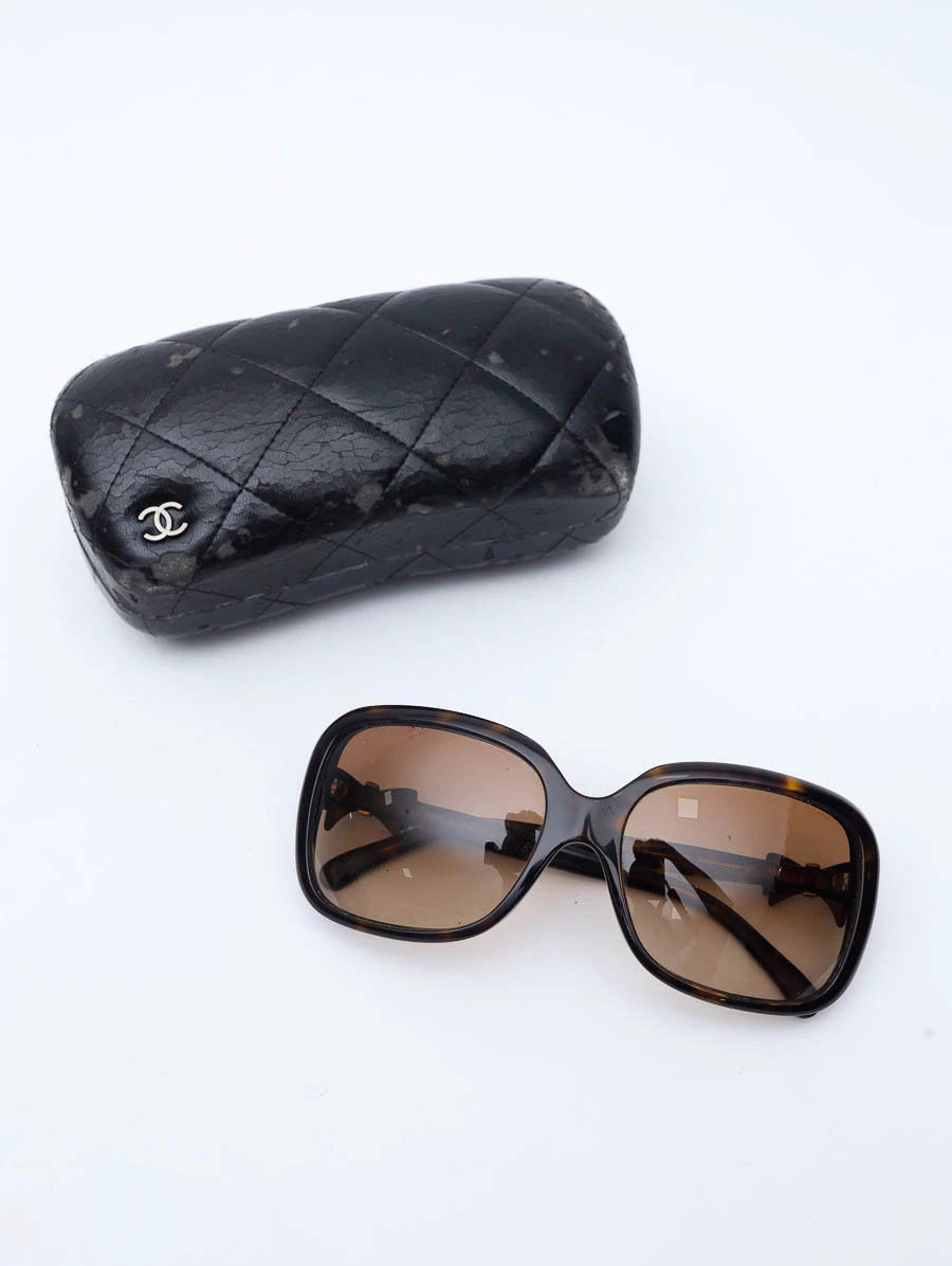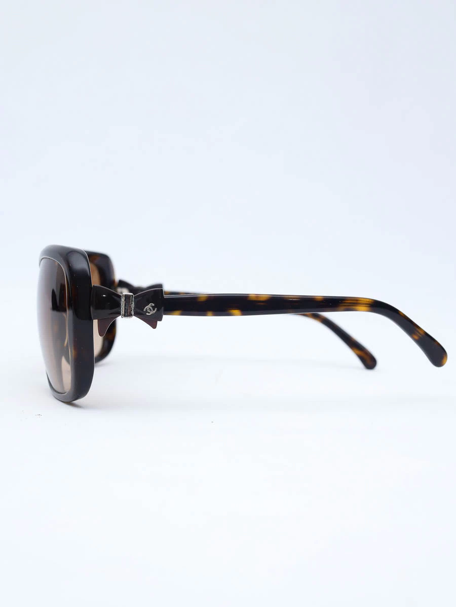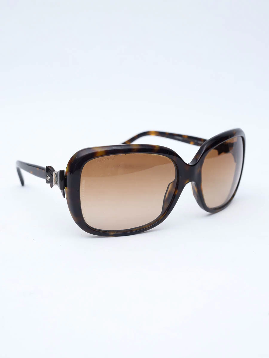 Óculos de Sol Seminovo Original Chanel 5171 com lentes marrom degrade e armação levemente tortuga na cor marrom escuro, apresenta um lindo detalhe de laços nas laterais com o logo CC da marca Chanel.