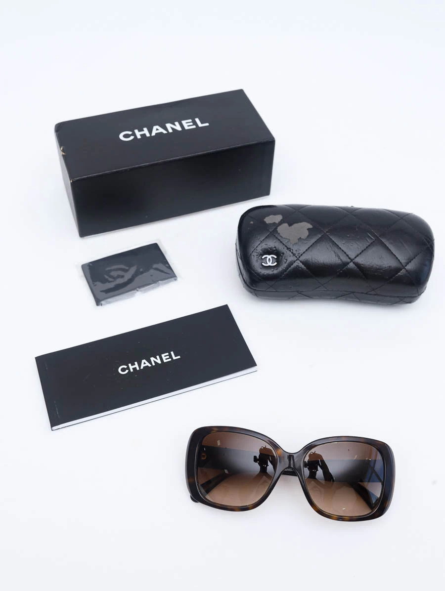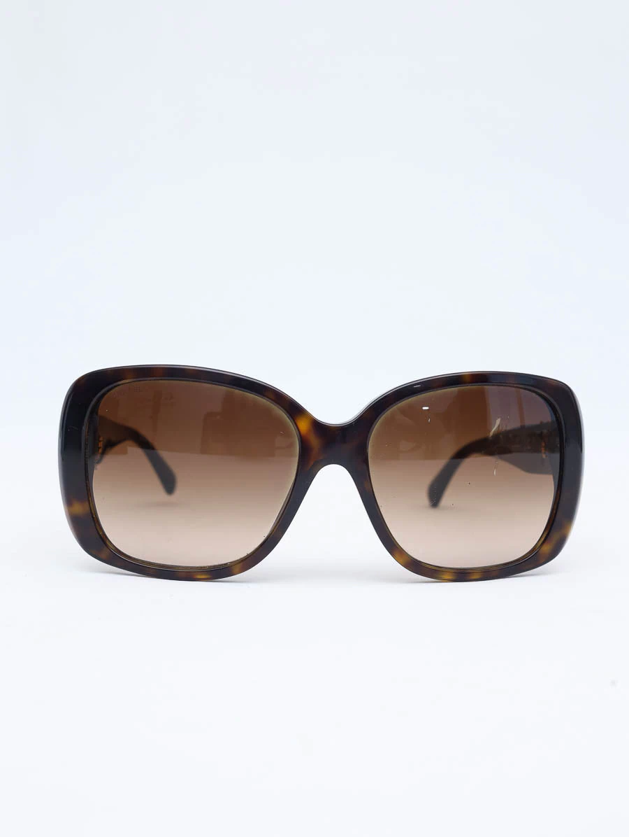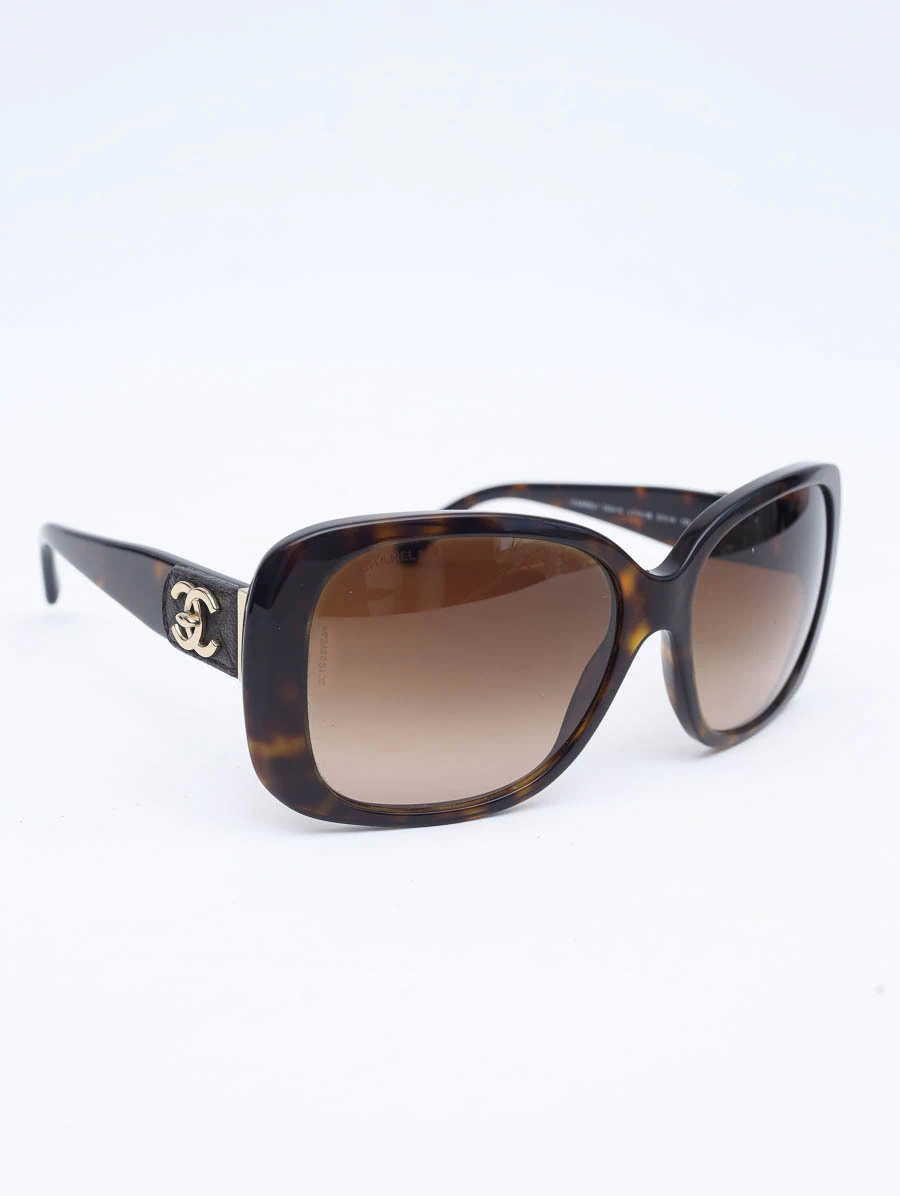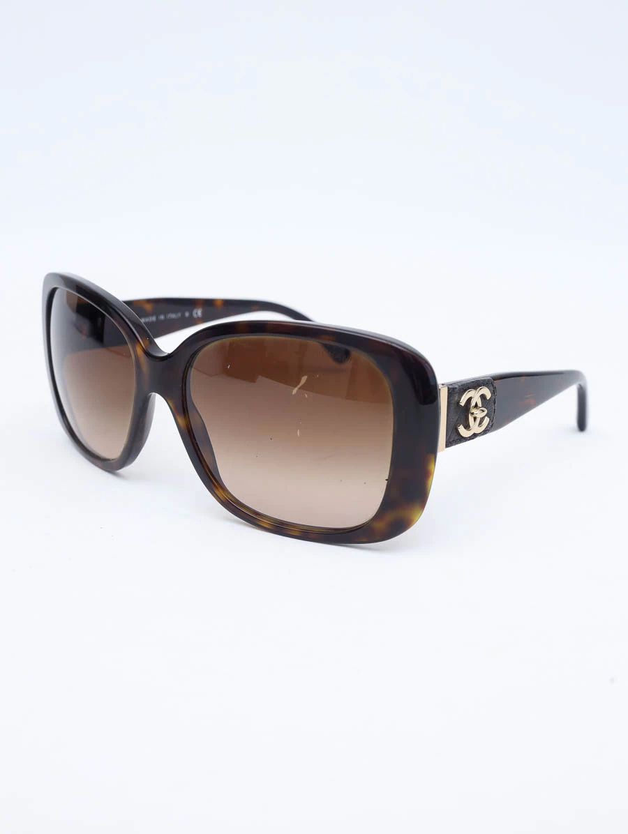 Óculos de Sol Chanel 5234Q com lente degrade marrom e armação tortuga. Com a logo CC da Chanel em alto relevo nas duas laterais em metal dourado e acabamento em couro marrom.