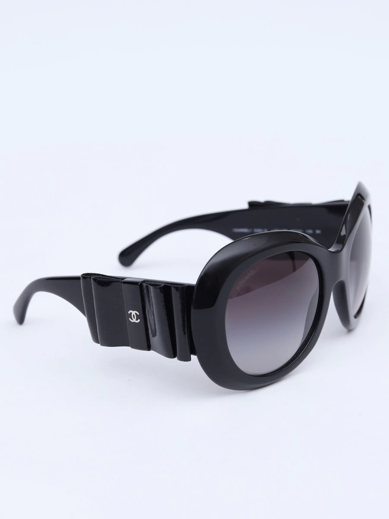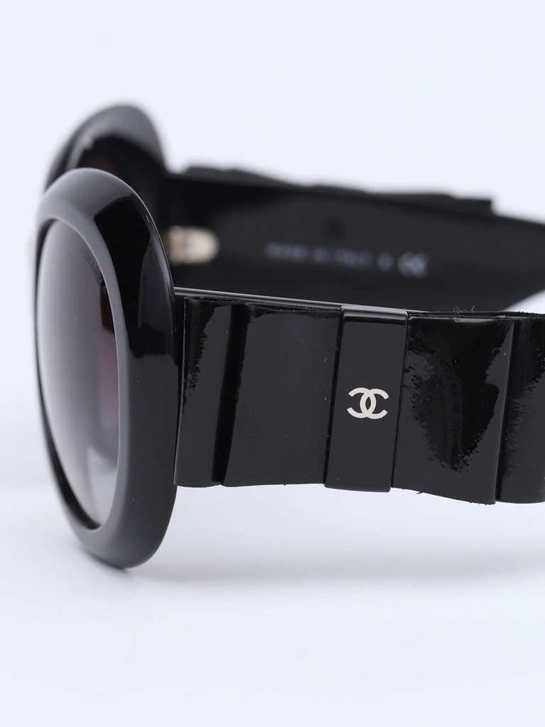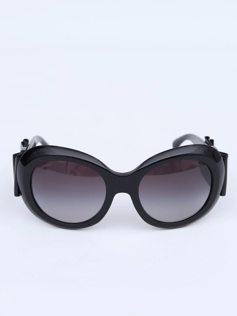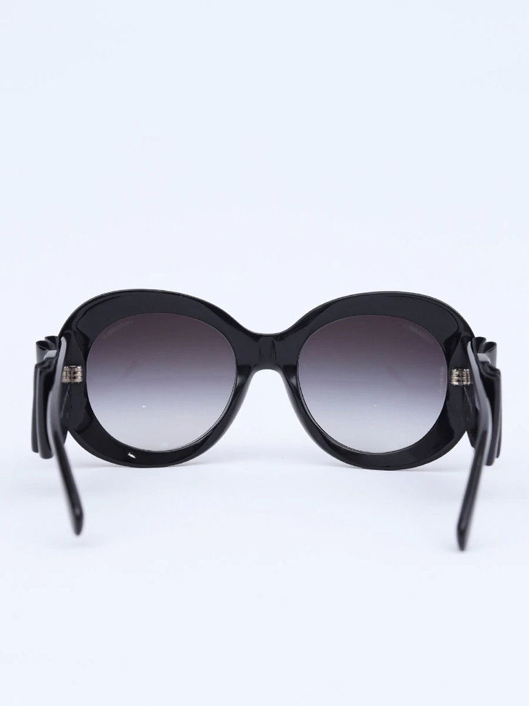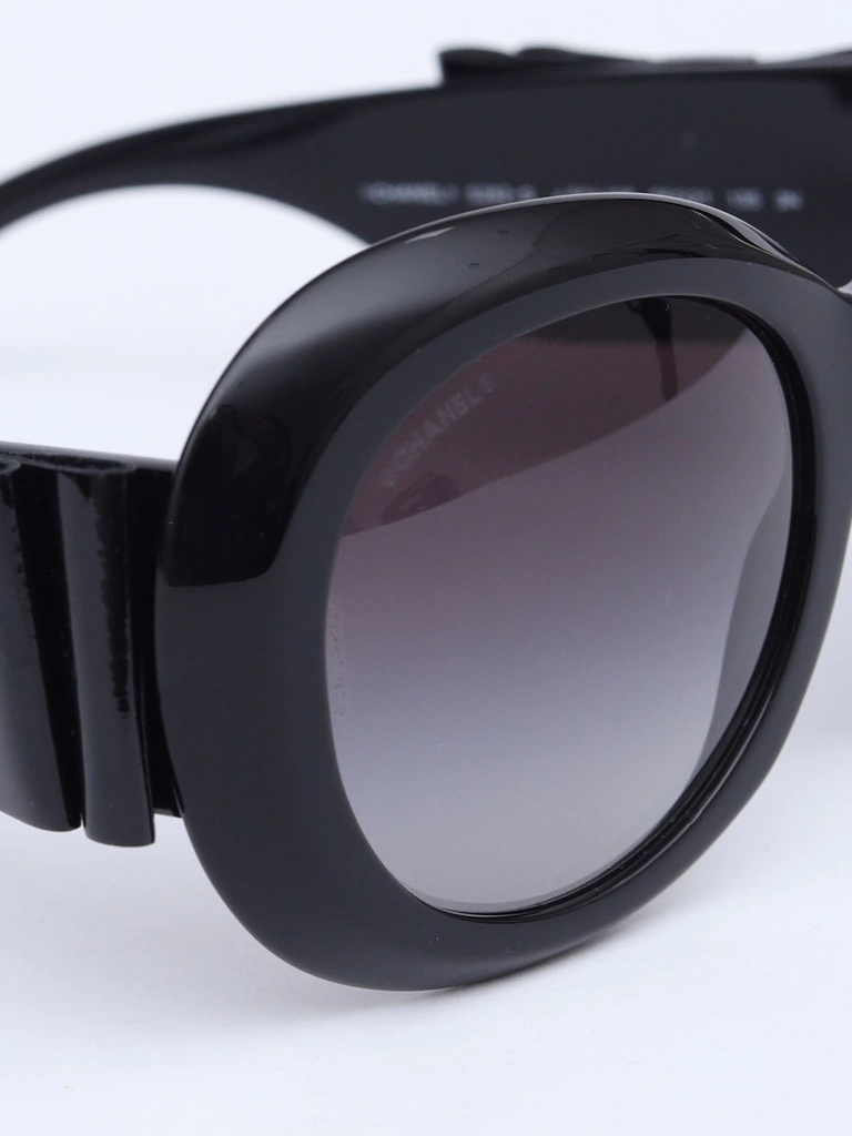 Óculos de Sol Autêntico Chanel 5282-Qcom armação preta em acetato, lentes redondas em degradê, hastes com detalhe decorativo de laços em couro com brilho e logo CC Chanel. Seminovo em excelente estado de conservação, sem riscos na lente.
