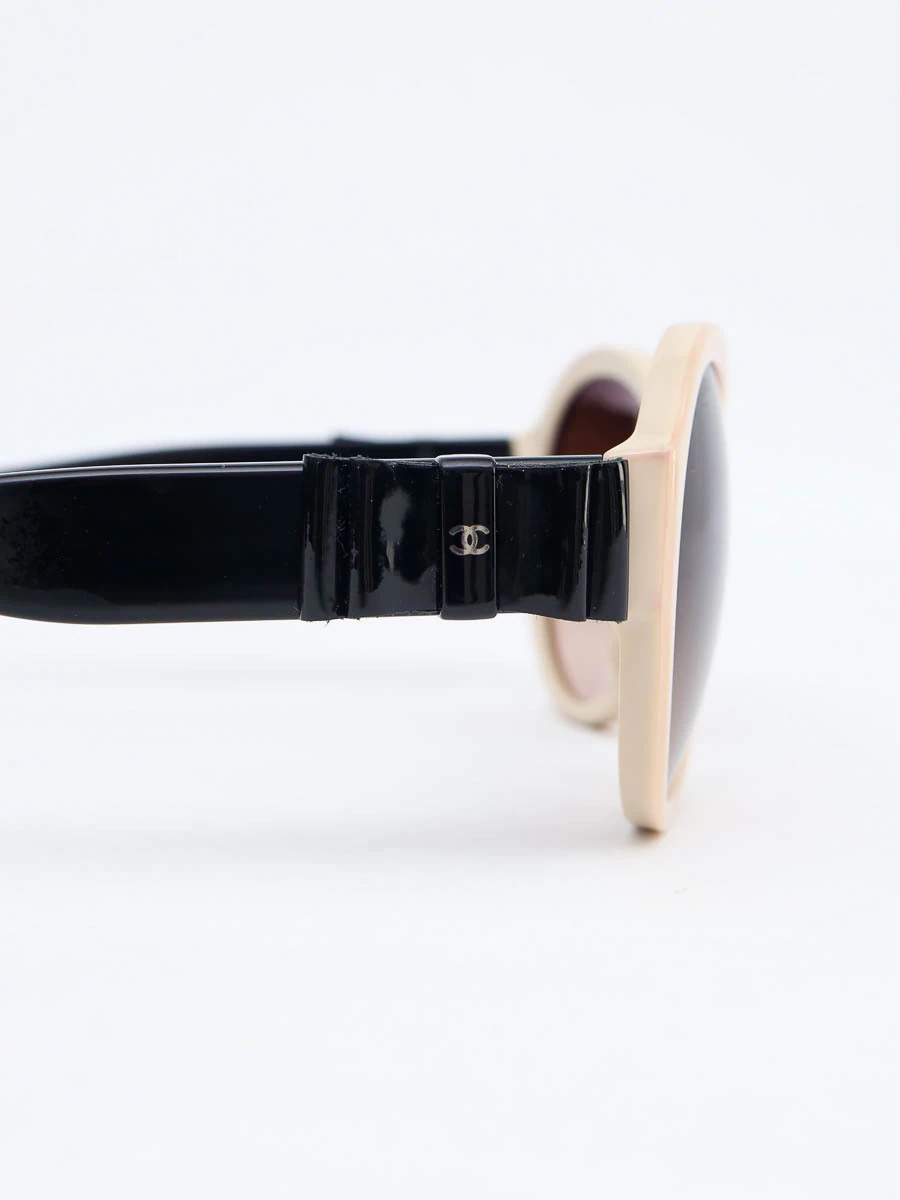 Óculos de Sol Original Chanel 5283-Q com armação em acetato nas cores preto e bege claro. Apresenta detalhes de laços nas hastes com logo Chanel. Lentes em degradê marrom e ferragens na cor prata.
