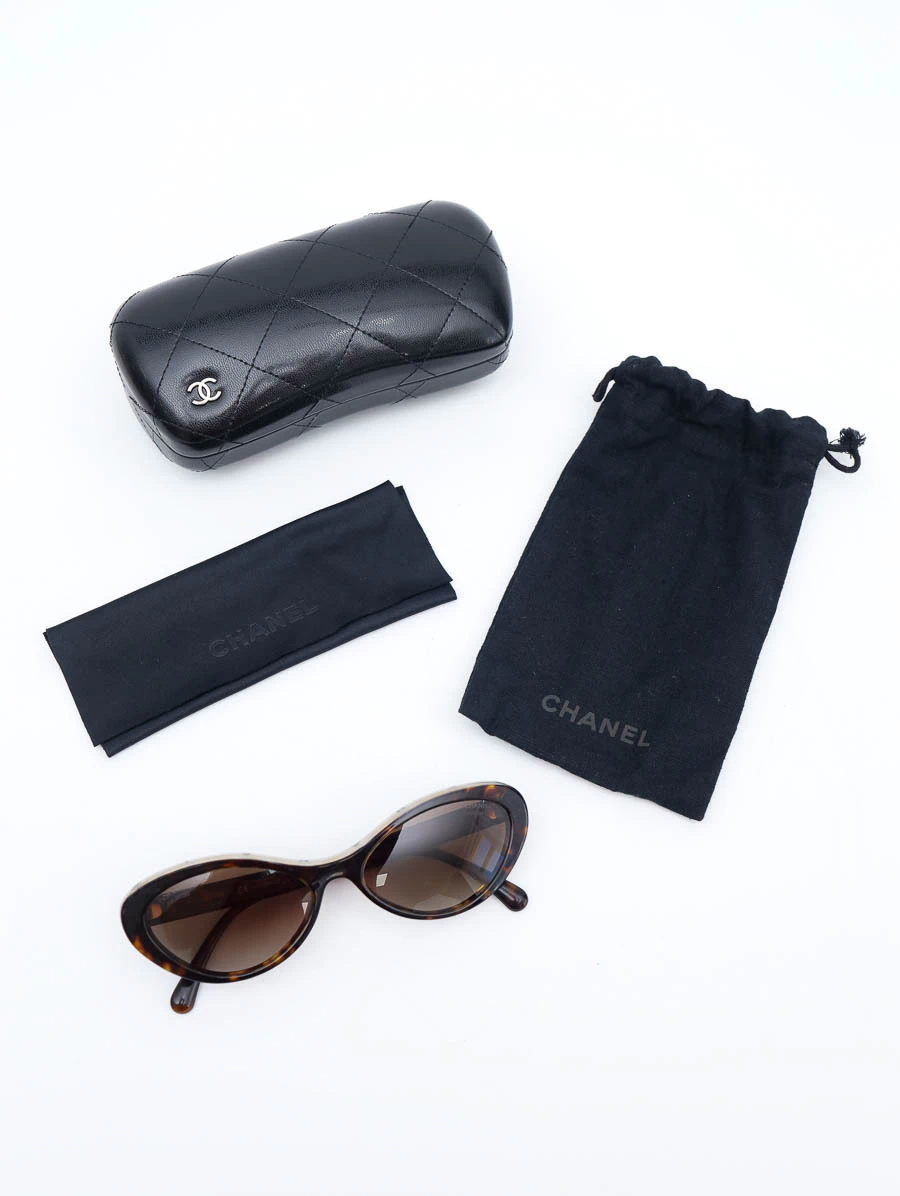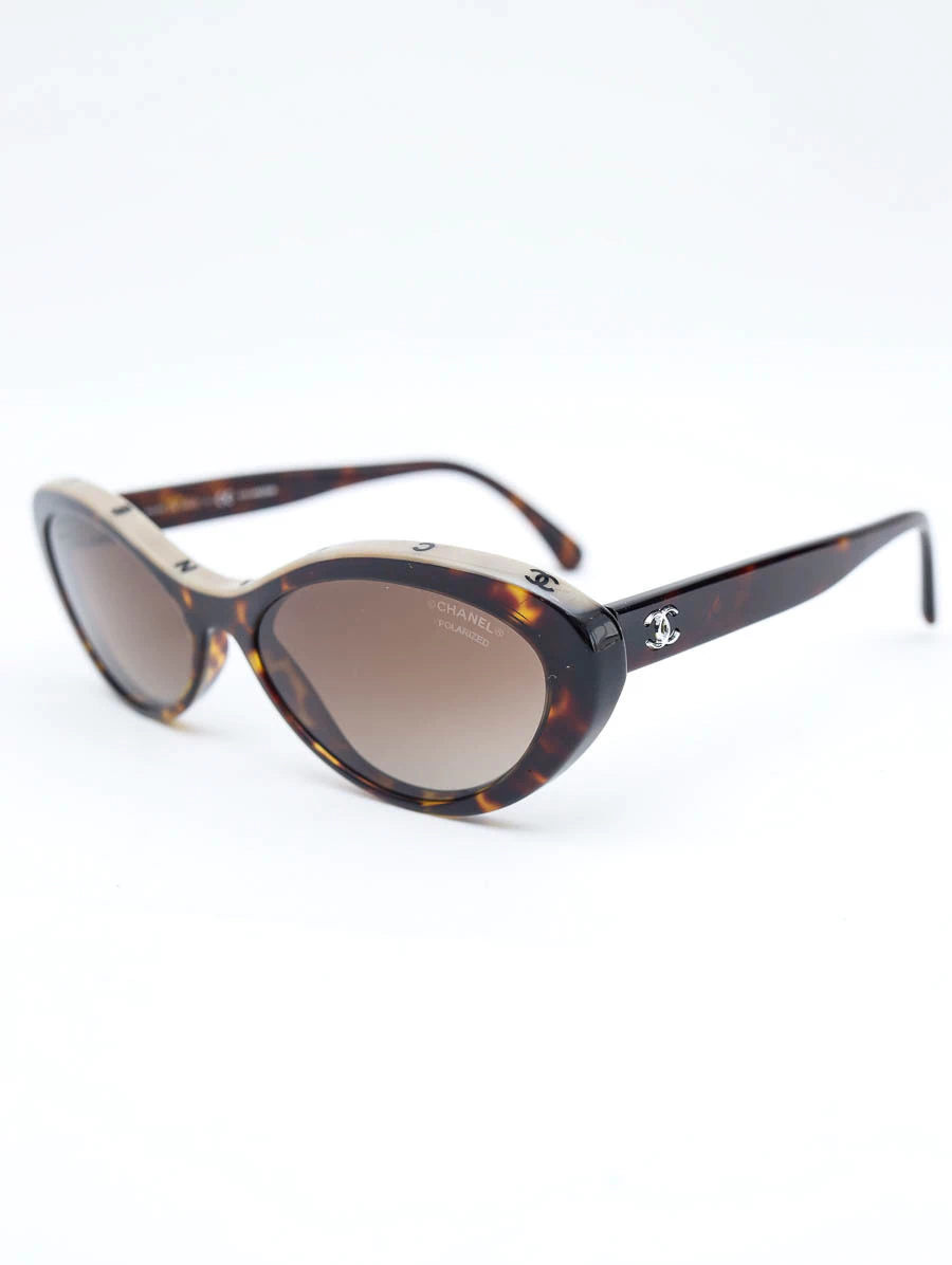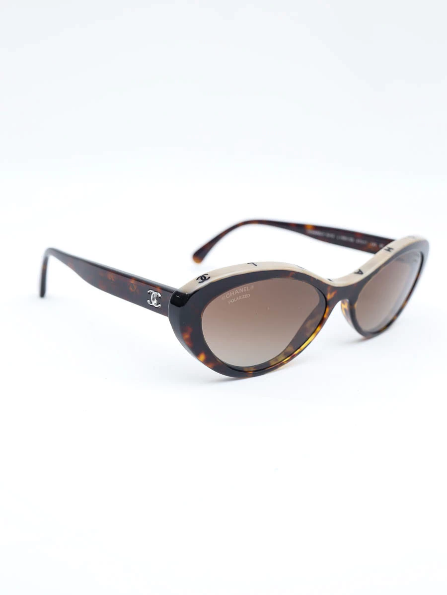 Óculos de Sol Chanel 5416 armação em acetato na cor marrom com estampa tortuga. Apresenta lentes polarizadas em degradê marrom e detalhes na parte superior com inscrição Chanel.