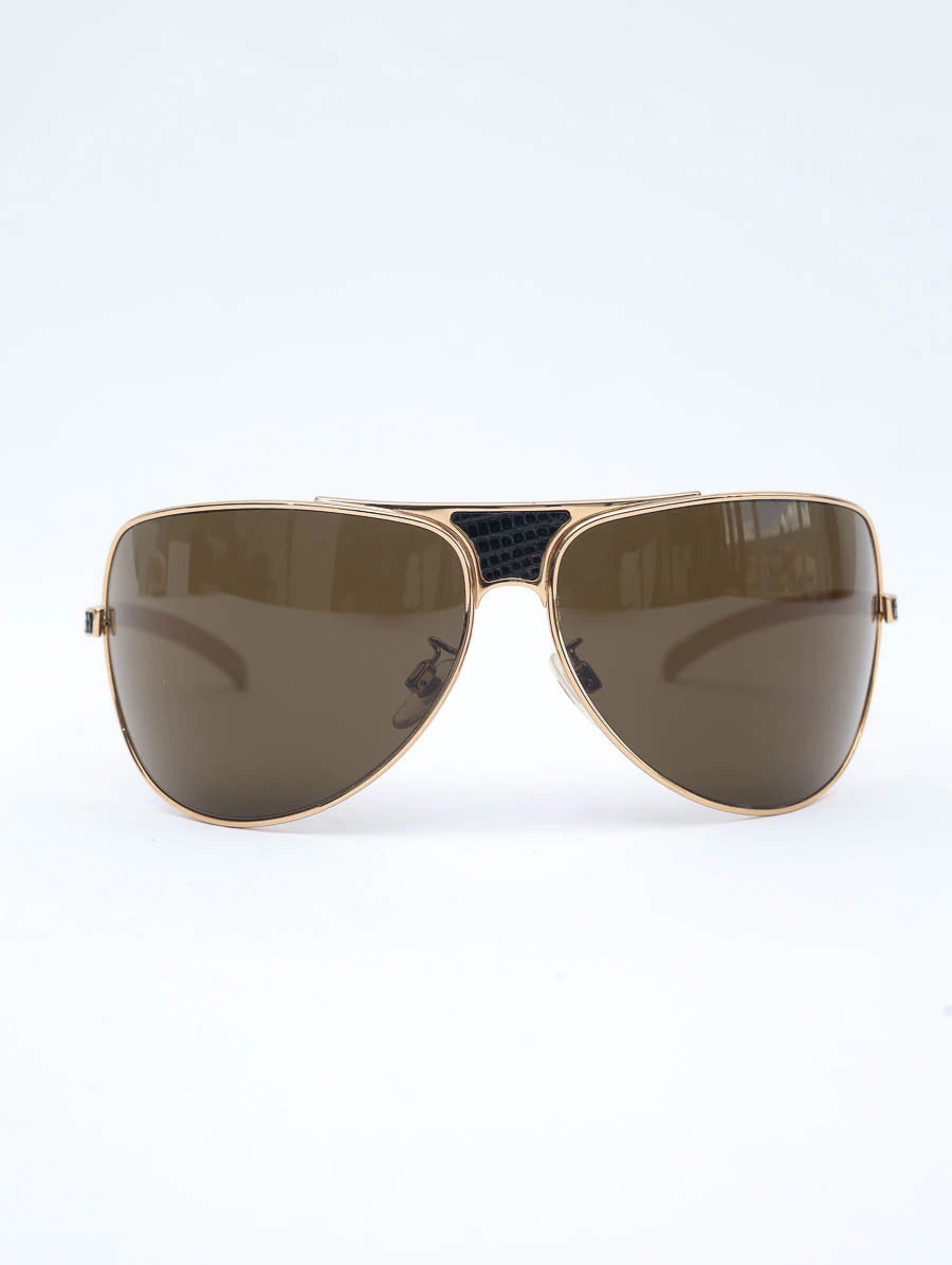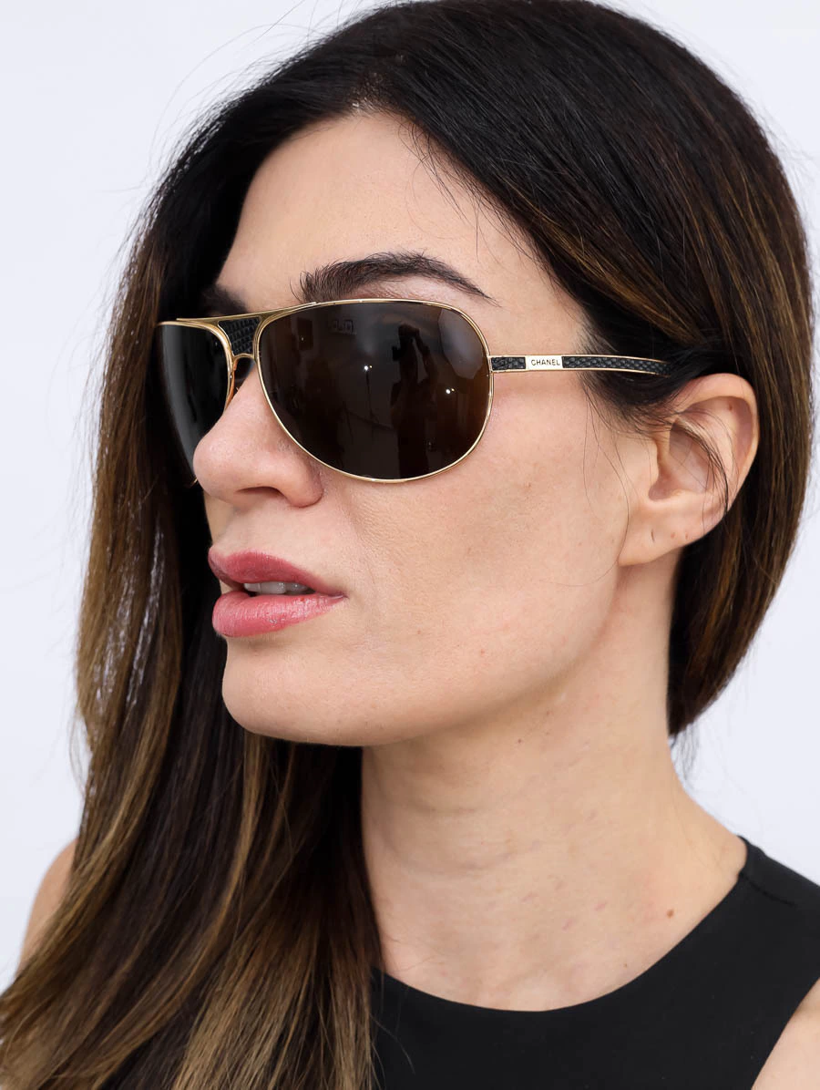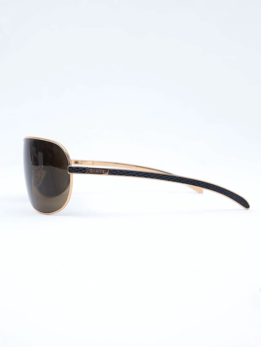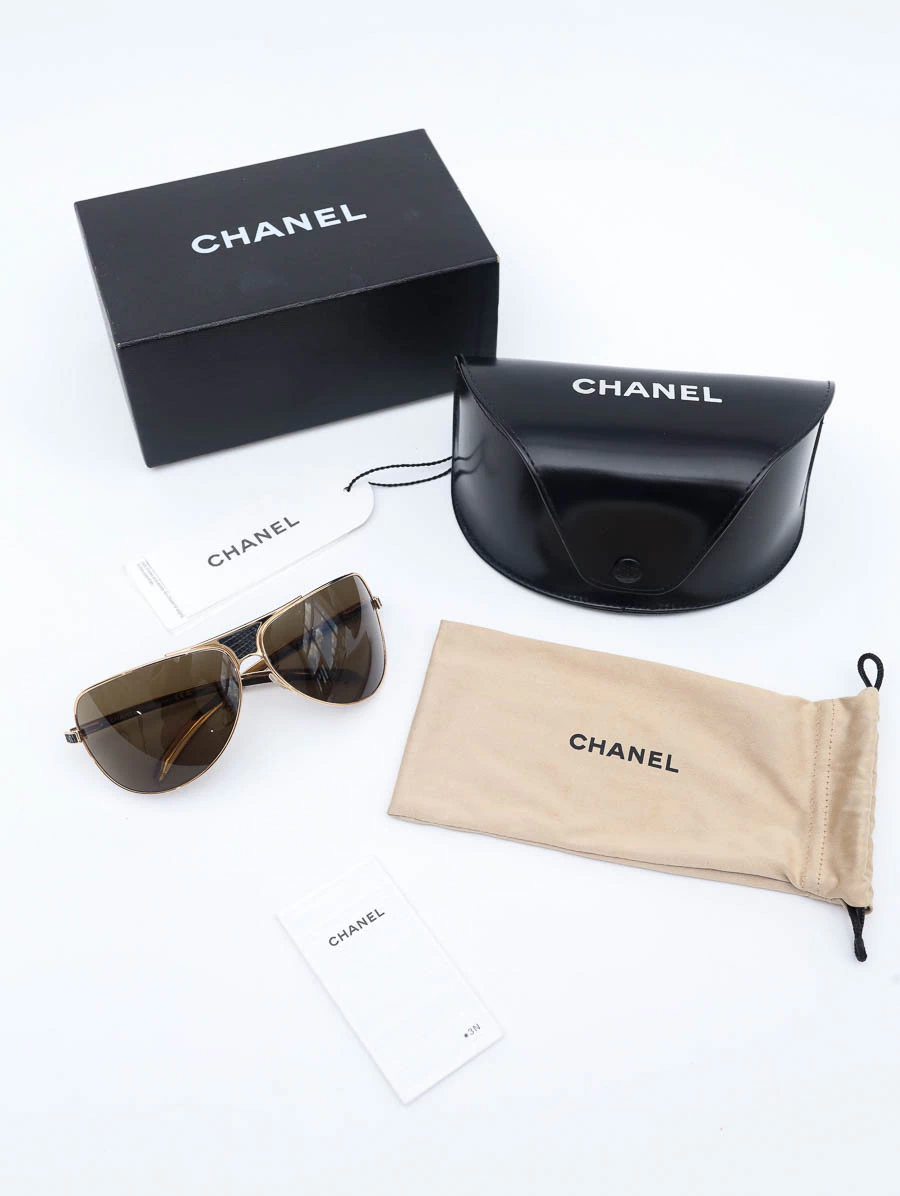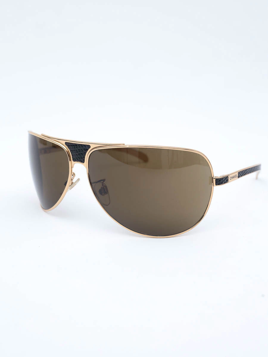 Óculos de Sol Chanel Vintage 4140-Q confeccionado em metal dourado com detalhes texturizados na parte frontal e nas hastes, que também contam com o logo da marca.