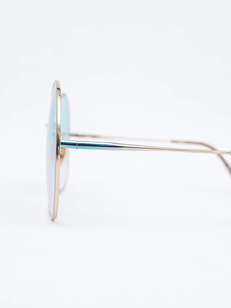 Óculos de Sol Original Chloé CH0014S com armação em metal degradê do prata ao azul e lentes em degradê nas cores verde e rosa. Apresenta detalhes em acetato na ponta das hastes. Está em perfeito estado de conservação, não apresenta sinais de uso.