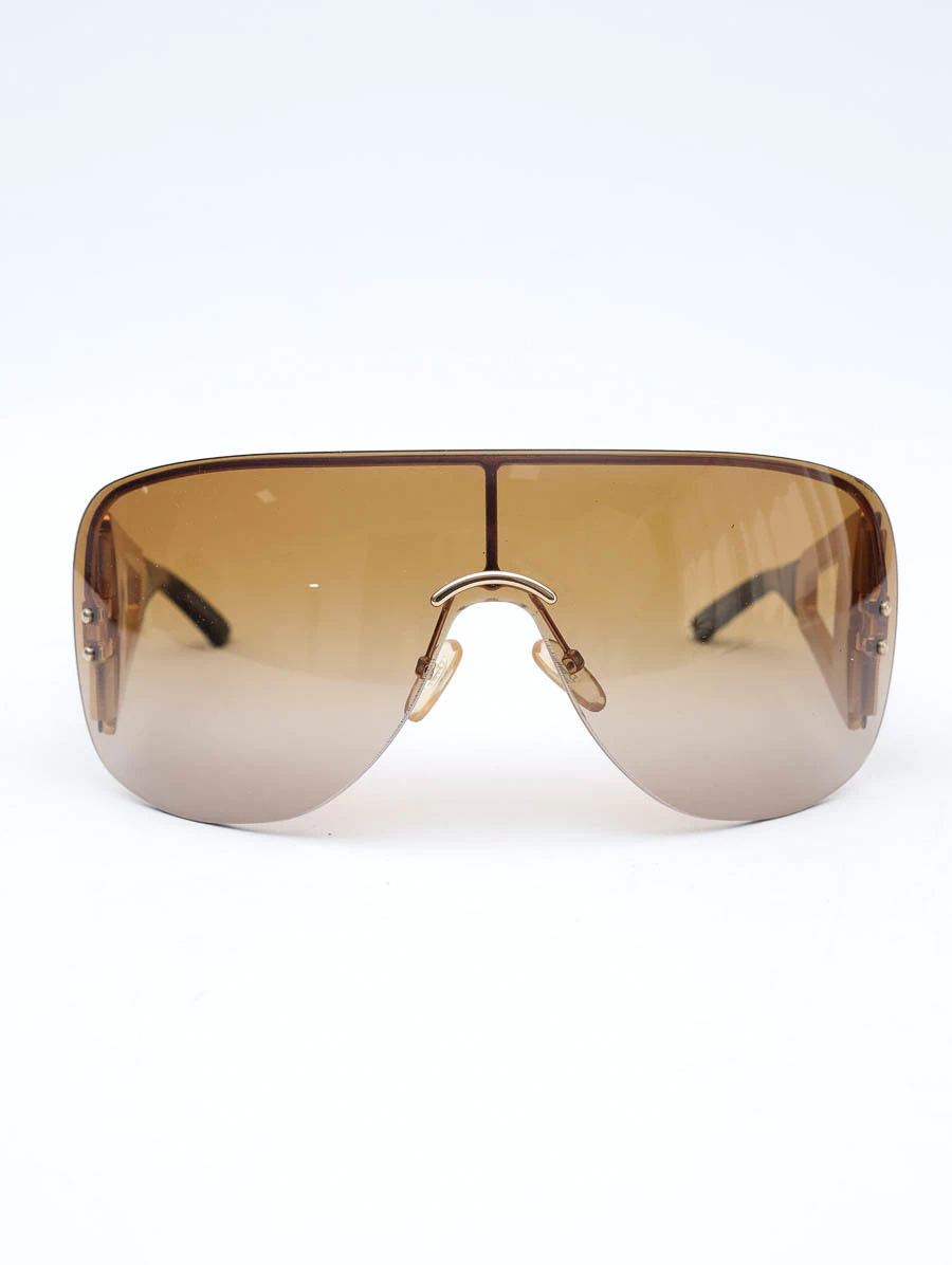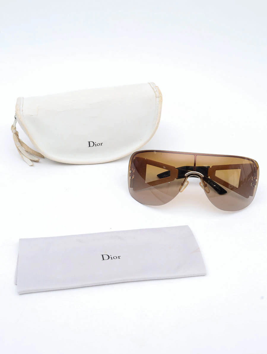 Óculos de Sol Seminovo Original Dior Escrime com armação em metais dourados, lentes em degradê na cor marrom e hastes com detalhe vazado em acetato tortuga e logotipo da marca em dourado.