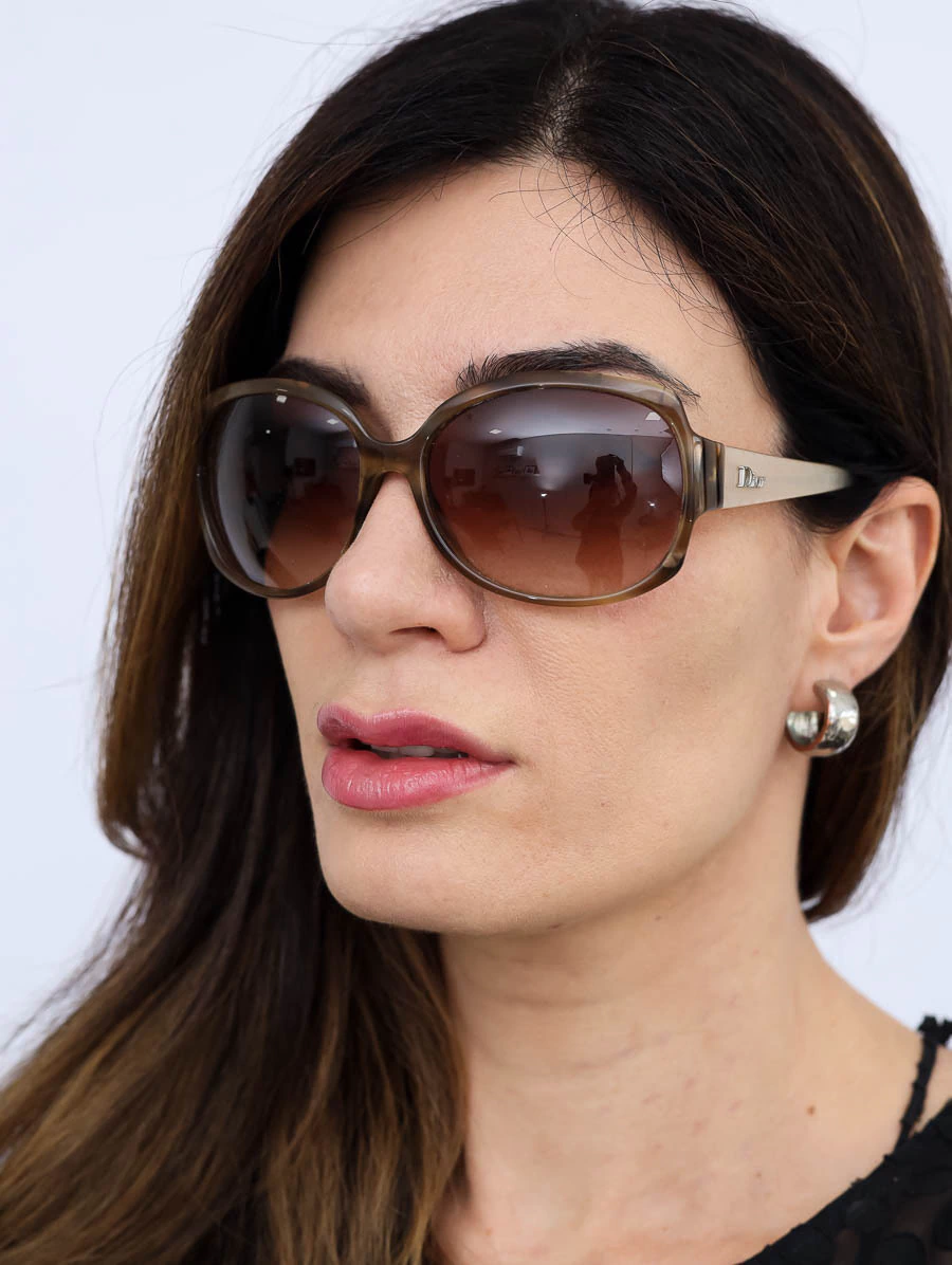 Óculos de Sol Seminovo Original Dior Granville com armação em acetato tortuga e lentes marrom em degradê, detalhes prateados/beges nas hastes e metais também prateados.