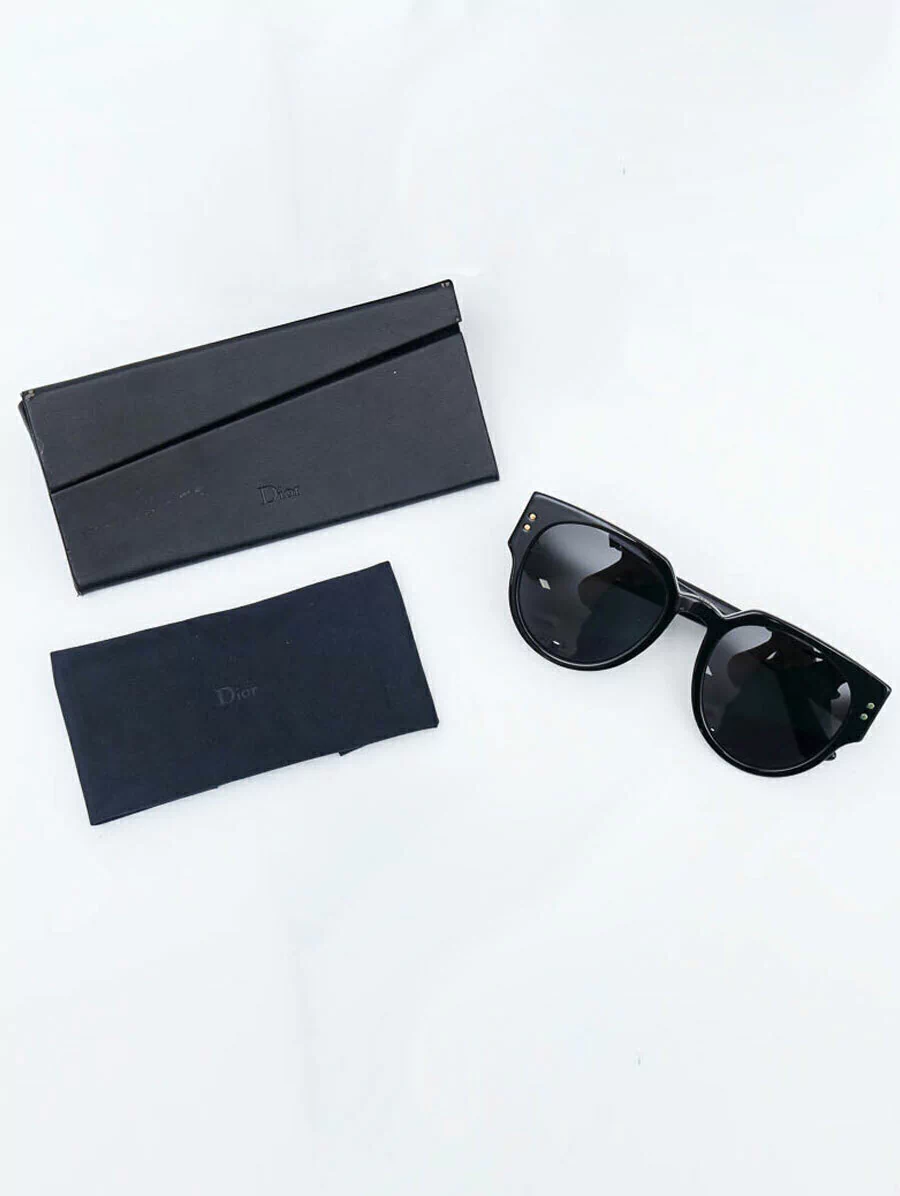 Óculos de Sol Original Dior Lady Dior Studs 3 com armação em acetato preto, hastes decoradas com taxas e logo DIOR em dourado e lentes pretas. Apresenta estado de conservação de um óculos com muito pouso uso, sem riscos nas lentes.