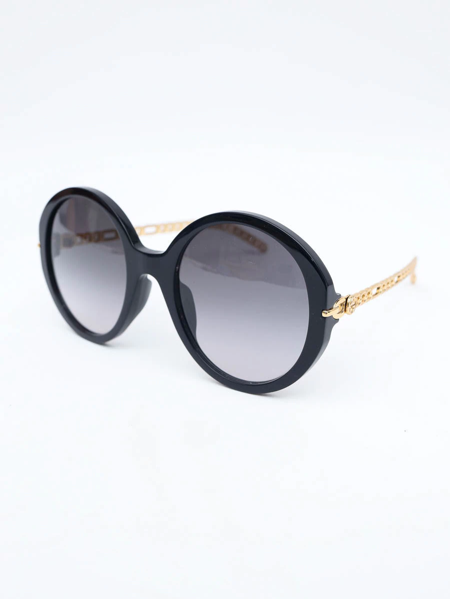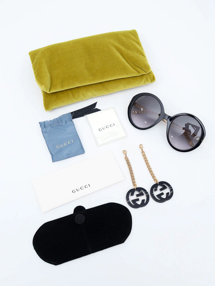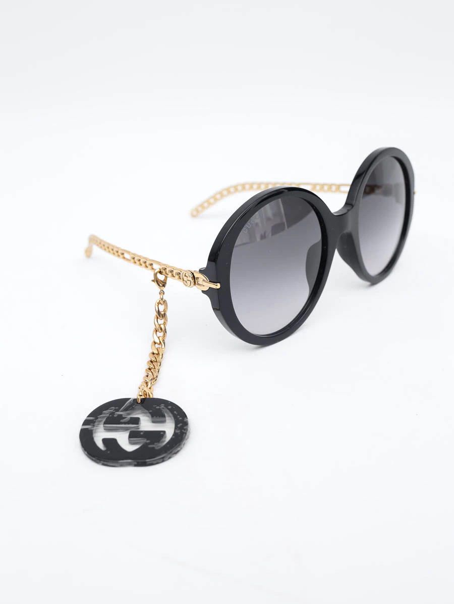 Óculos de Sol Gucci GG0726Scom armação em acetato na cor preta, detalhes em corrente nas hastes, lentes pretas em degradê e logo Gucci nas laterais. Possui pingente decorativo em acetato com correntes para pendurar nas hastes.