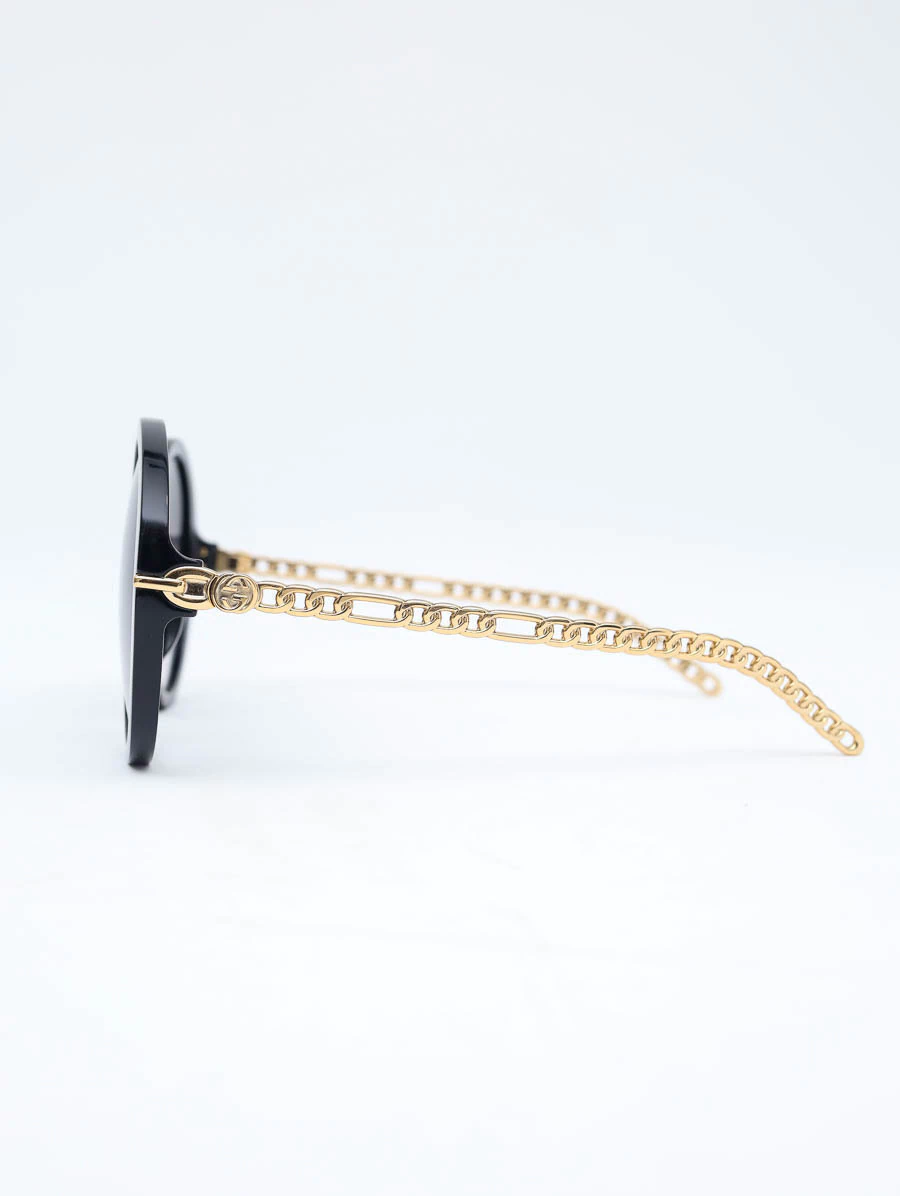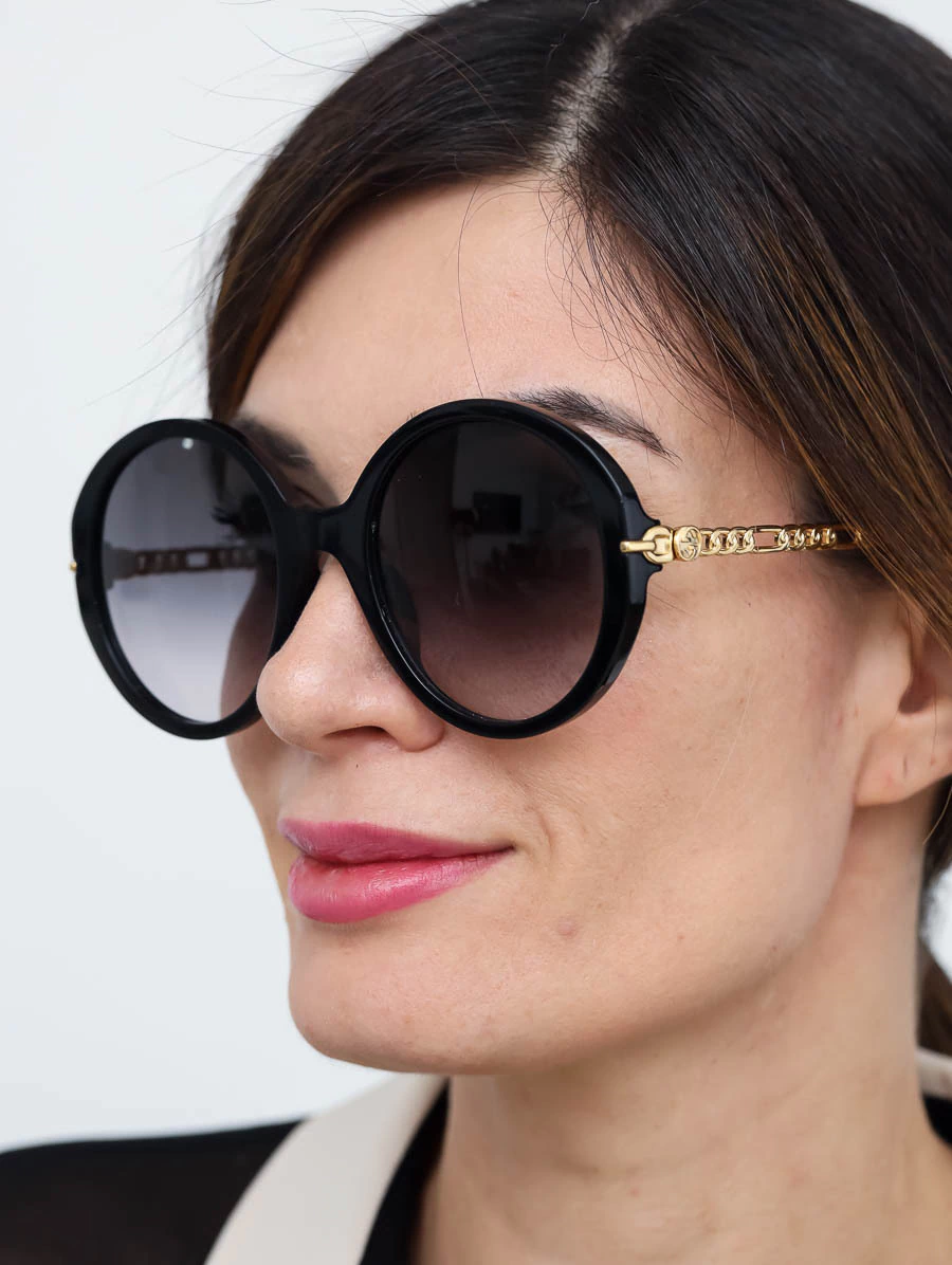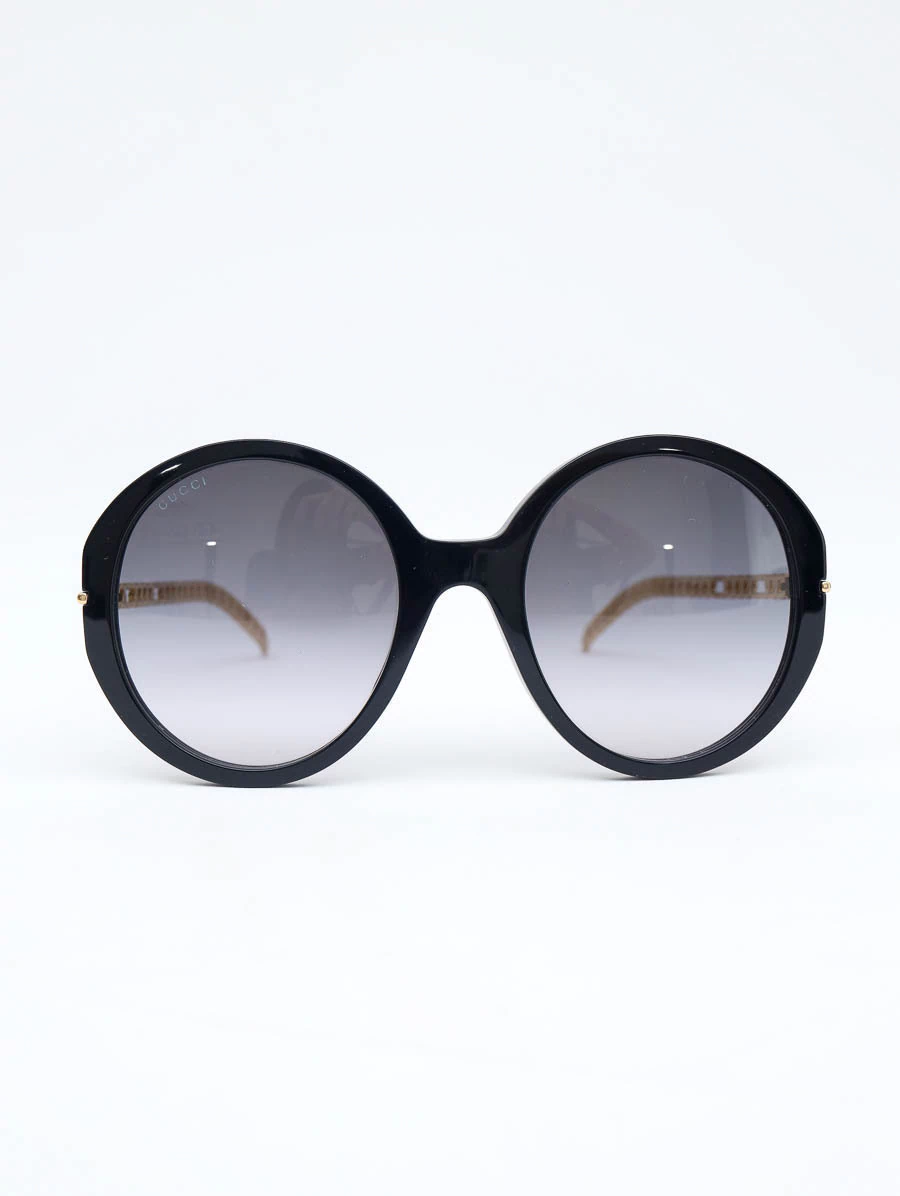 Óculos de Sol Gucci GG0726Scom armação em acetato na cor preta, detalhes em corrente nas hastes, lentes pretas em degradê e logo Gucci nas laterais. Possui pingente decorativo em acetato com correntes para pendurar nas hastes.