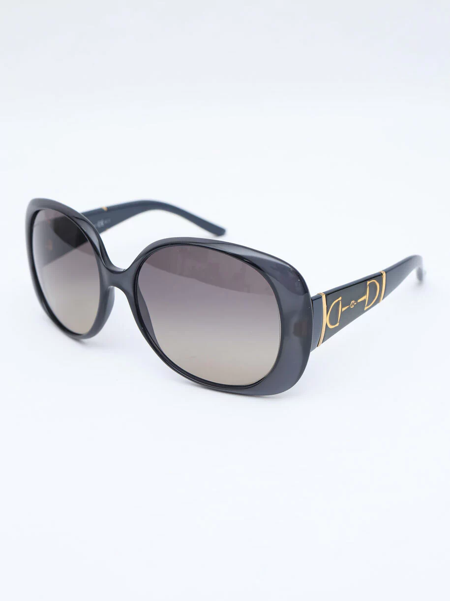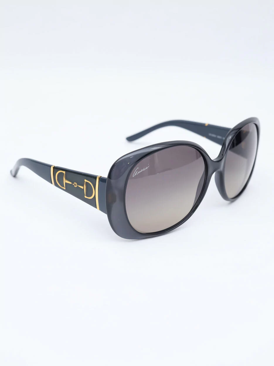 Óculos de Sol Original Gucci GG3536/S confeccionado com armação translúcida cinza e hastes em acetato na cor azul petróleo, detalhes em metal nas laterais e lentes degradês pretas. Apresenta estado de conservação de um óculos sem sinais de uso.