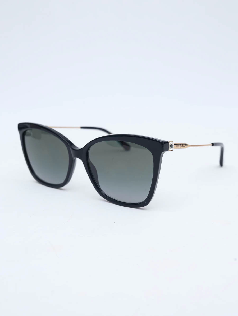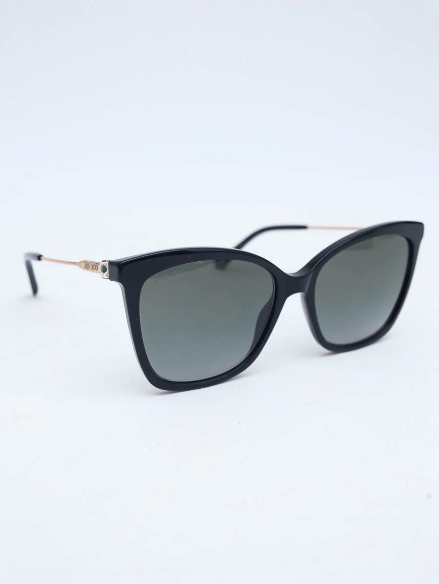 Óculos de Sol Seminovo Original Jimmy Choo 807IR com armação em acetato e lentes na cor preta, detalhes em metais dourados e cristais nas hastes.