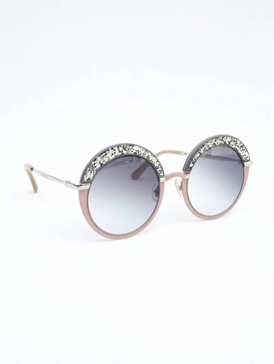 Óculos de Sol Jimmy Choo Gotha/S com armação arredondada em acetato rosa e detalhes metalizados em tom prata. Apresenta lentes pretas degradê, metais prateados e detalhe nas hastes para maior conforto.