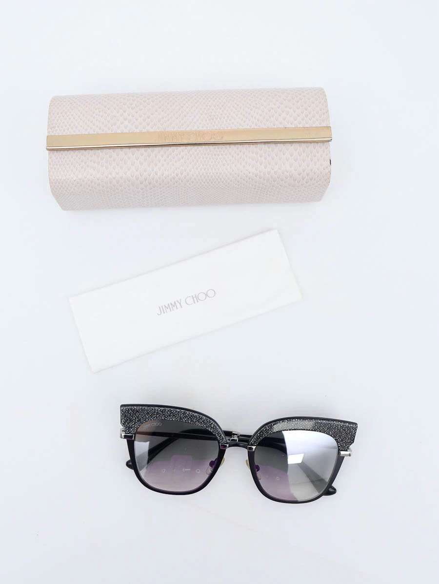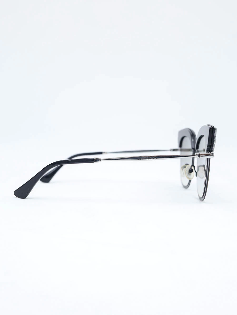 Óculos de Sol Jimmy Choo Rosy Scom armação em metal prata e detalhes em acetato na cor preta, lindas aplições em gliter na parte superior ao redor do óculos, lentes em degradê e logo Jimmy Choo nas laterais.