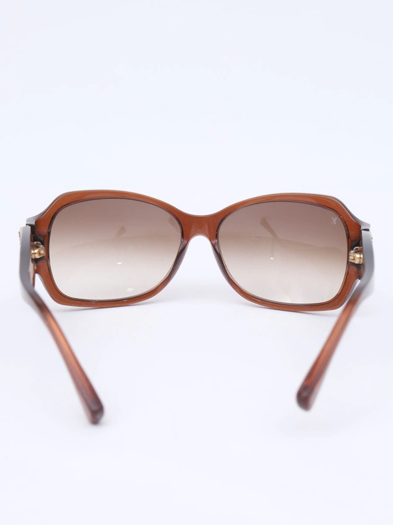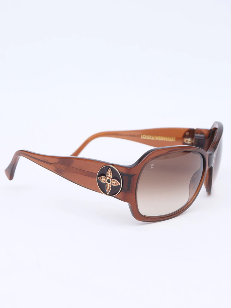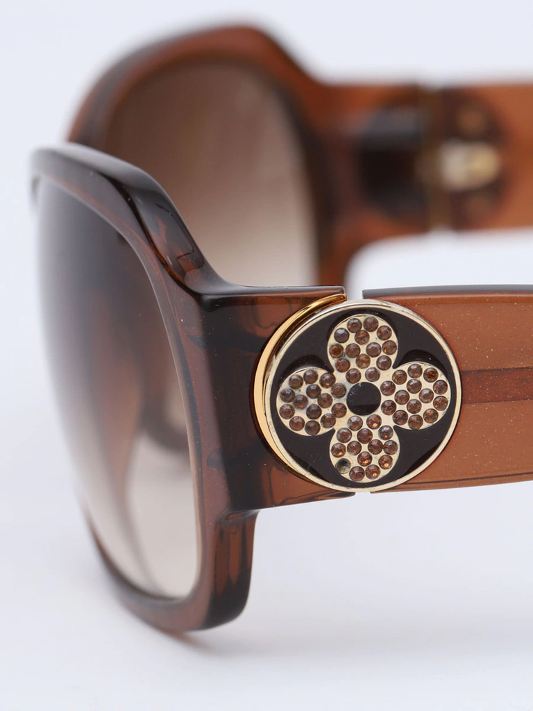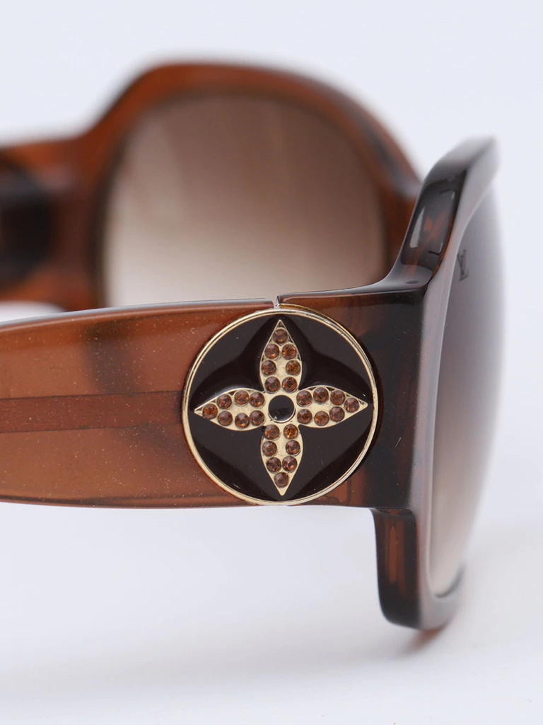 Óculos de Sol Autêntico Louis Vuitton Z0135W confeccionado em acetato com leve transparência na cor marrom com detalhes no interior em glitter. Apresenta nas laterais uma estrela e uma flor de quatro pontas, símbolos presentes na estampa monograma clássica da marca Louis Vuitton e confortáveis lentes degradê na cor marrom.