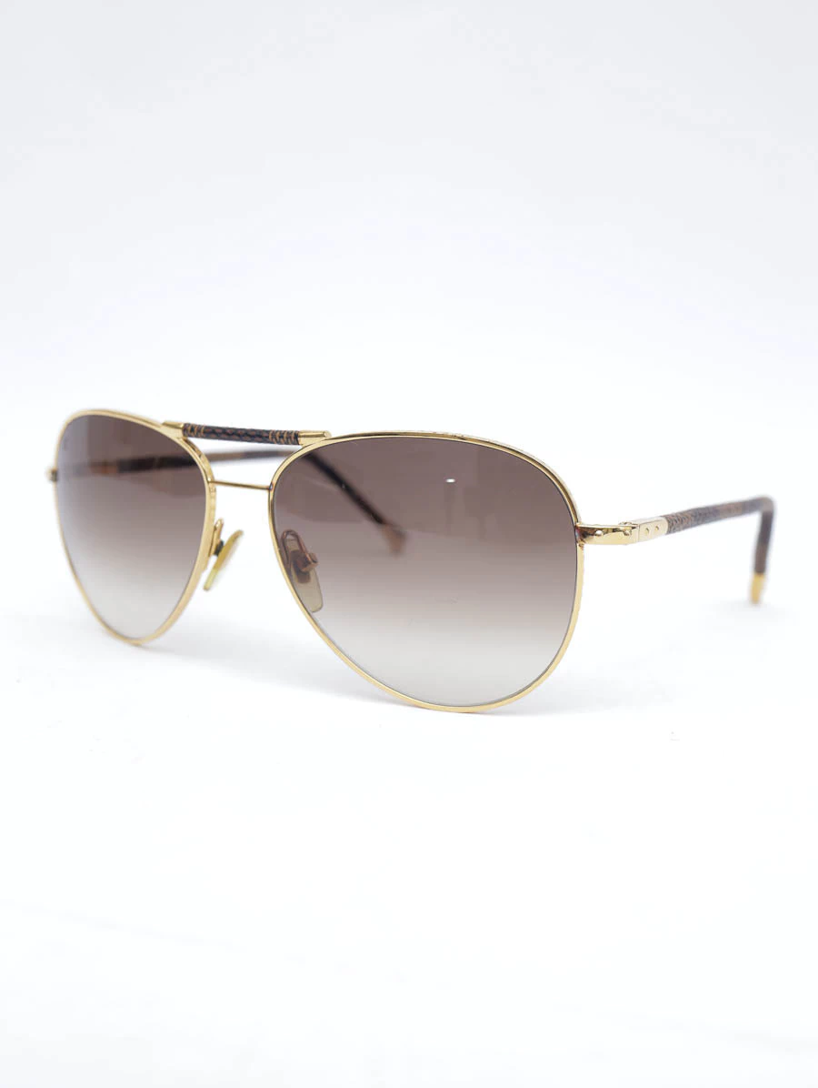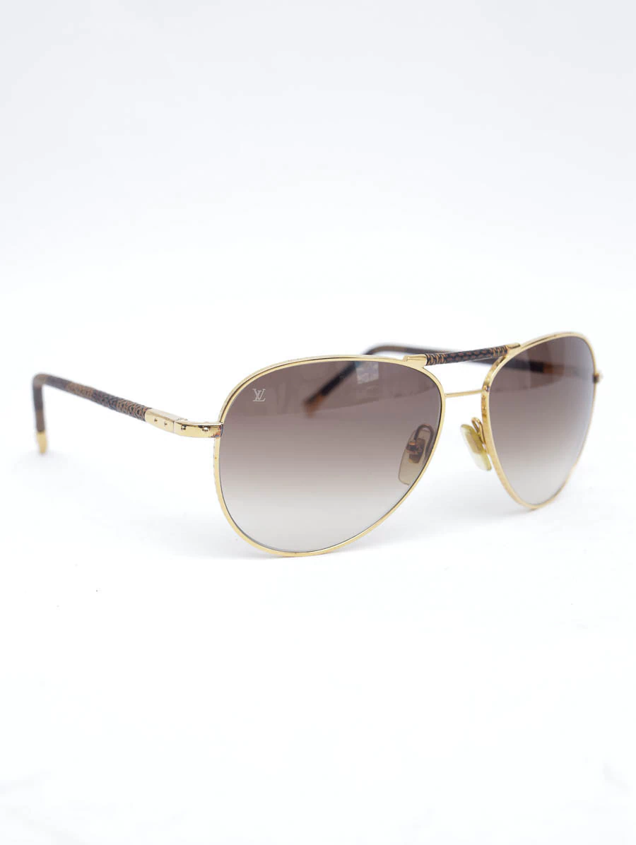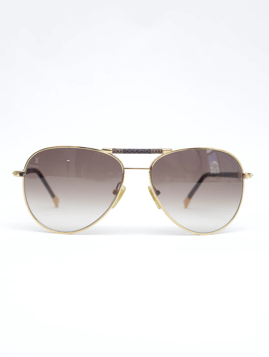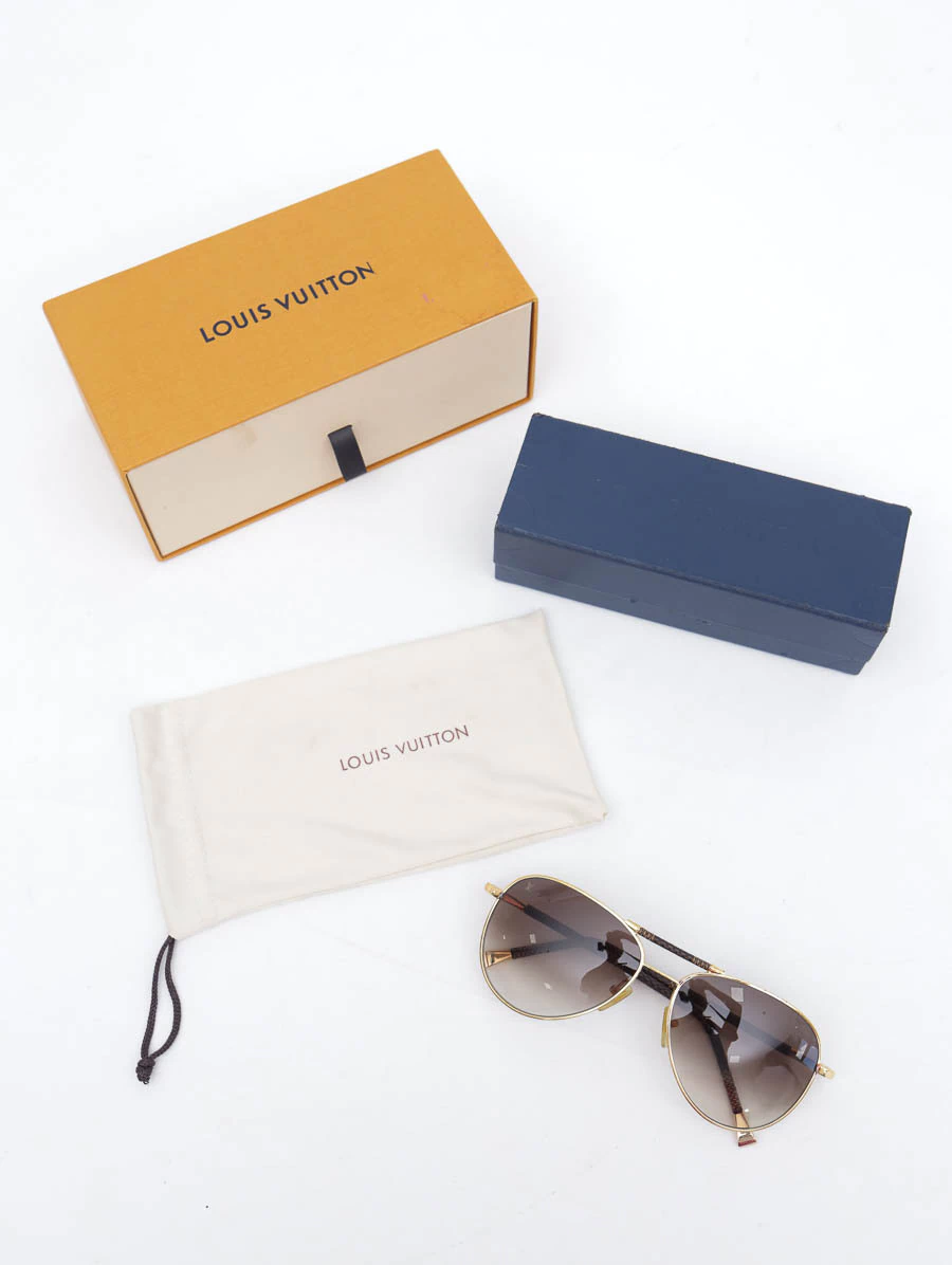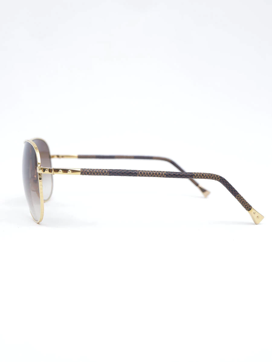 Óculos de Sol Louis Vuitton Z0202U com armação em metal dourado e detalhes em canvas damier, lentes em degrade e hastes em canvas damier. Em perfeito estado de conservação, sem riscos nas lentes e sem marcas de uso.