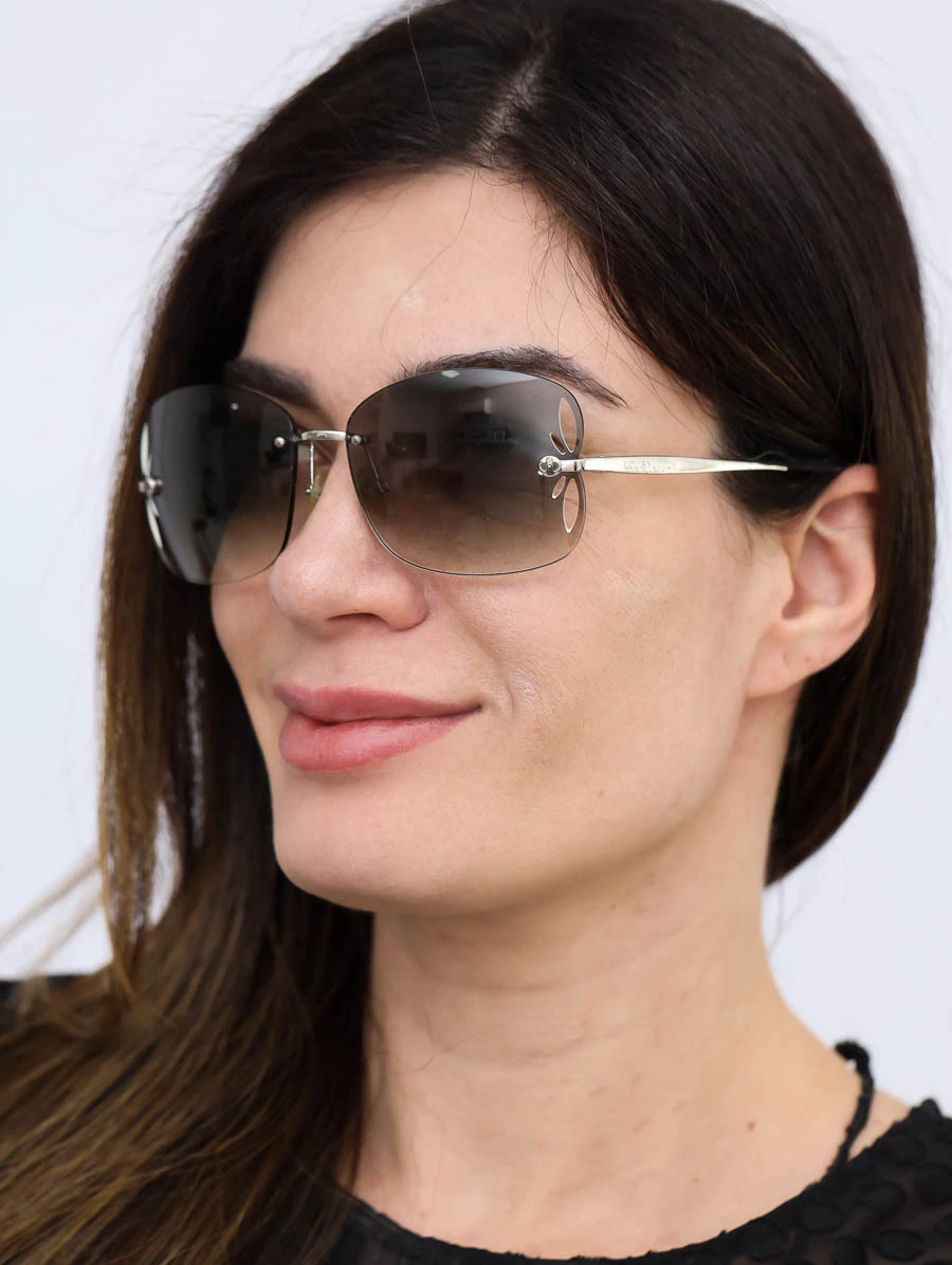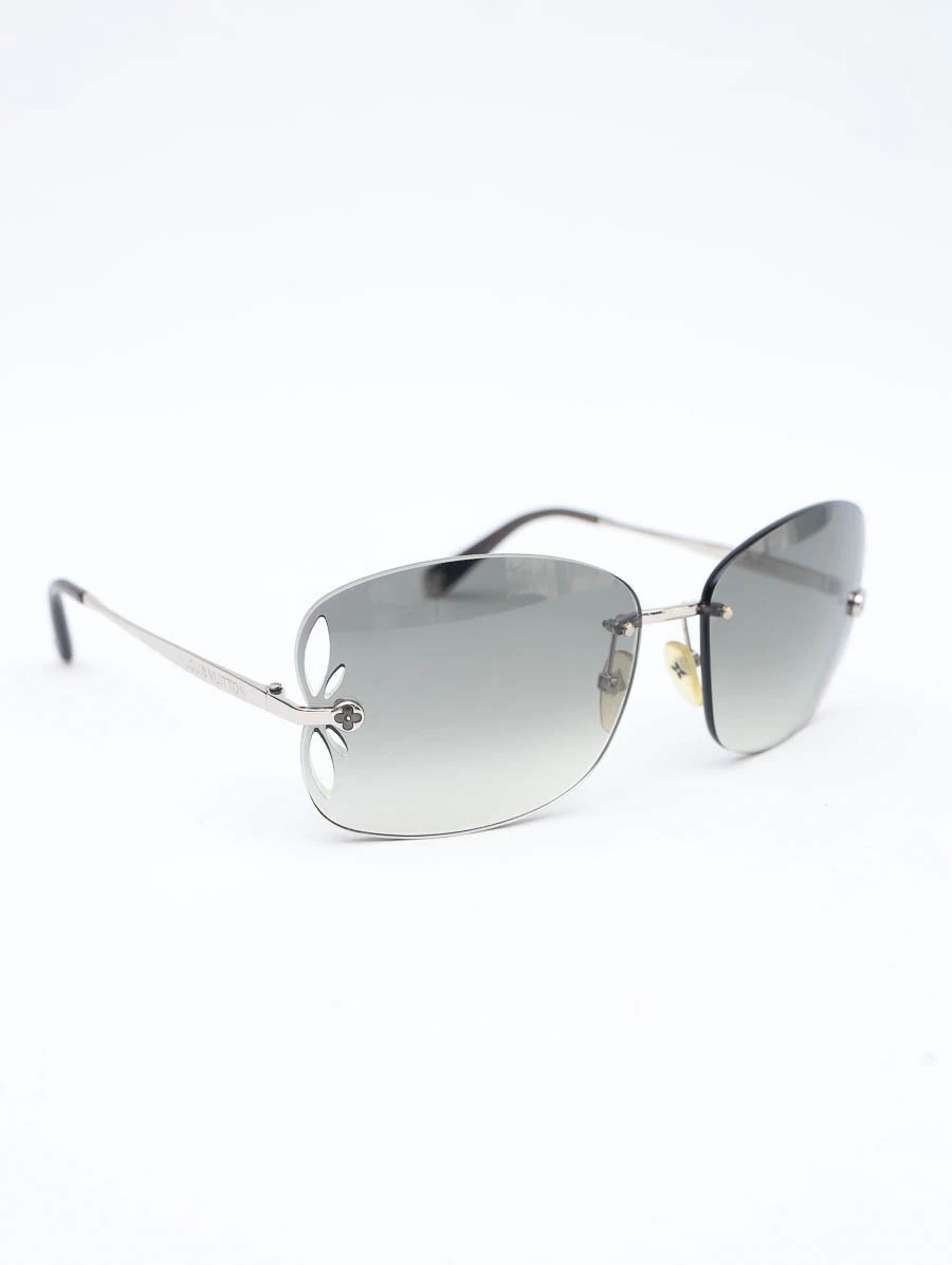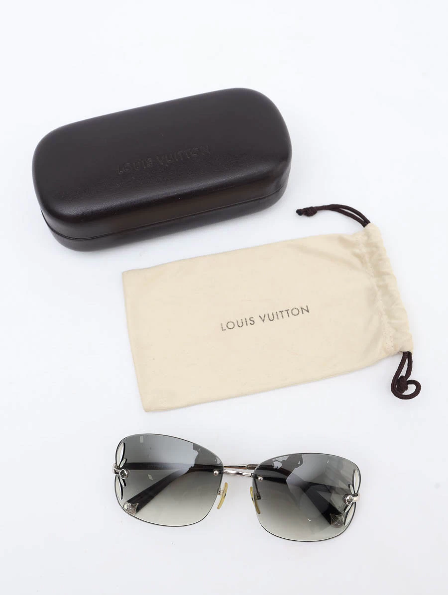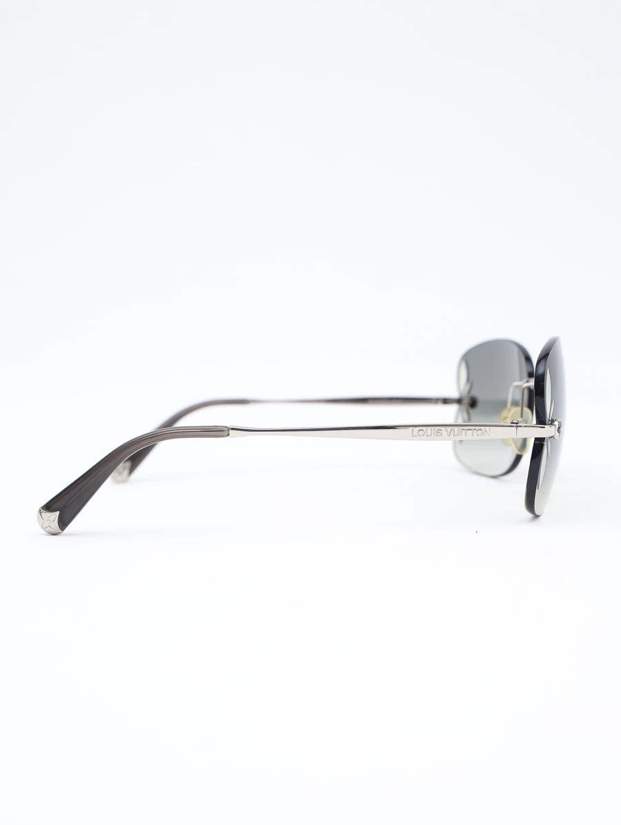 Óculos de Sol Seminovo Original Louis Vuitton Z0308U com armação em metais prateados e acetato cinza, lentes em degradê preto e detalhes vazados nas laterais.