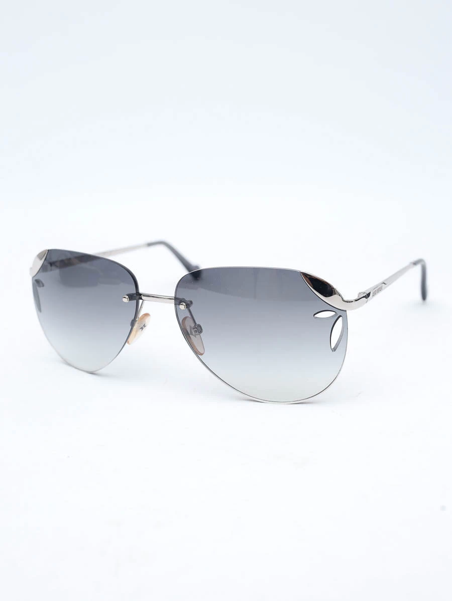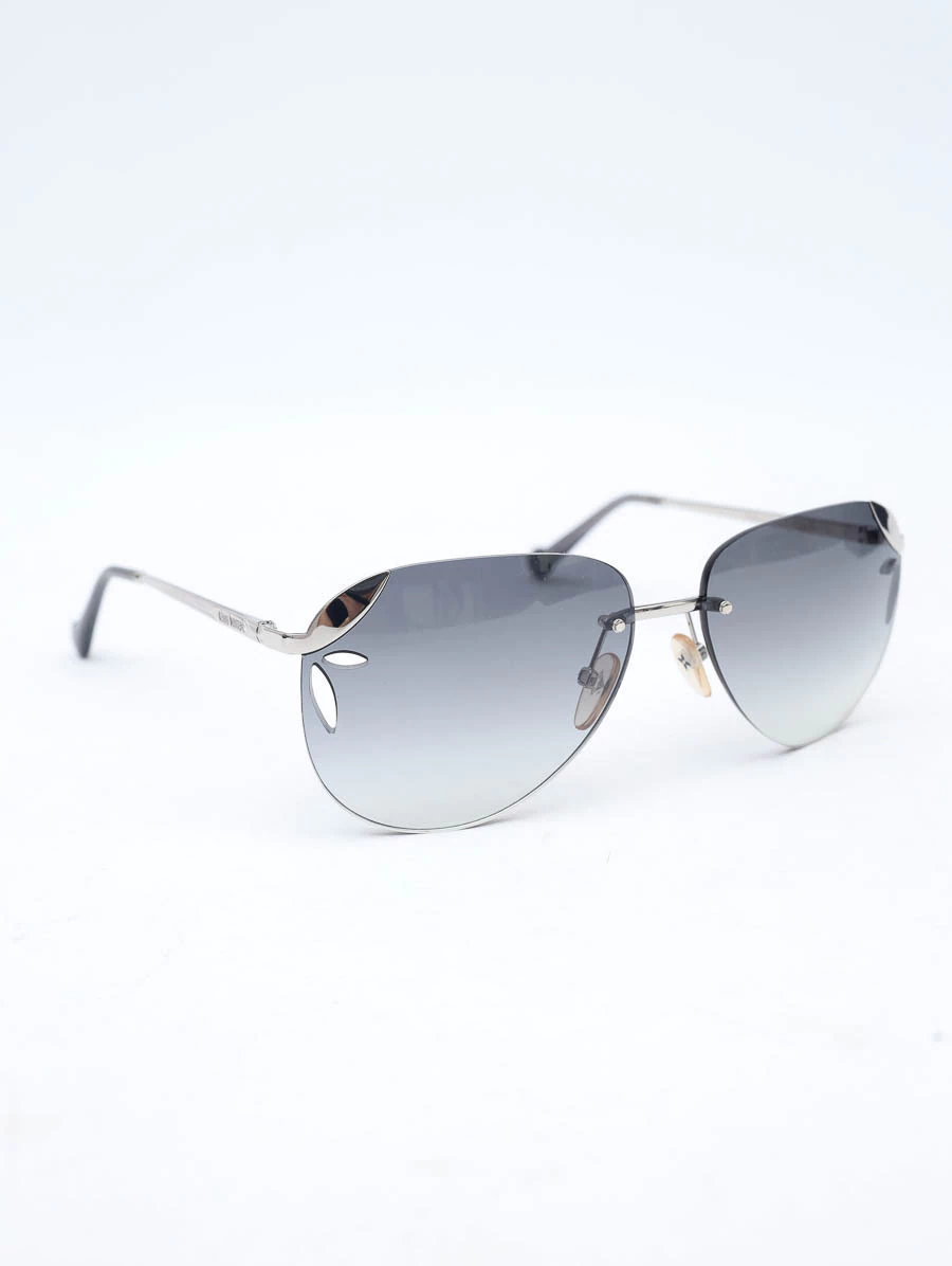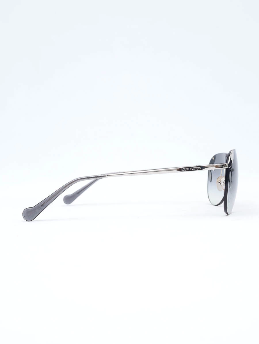 Óculos de Sol Seminovo Original Louis Vuitton Z0762U com armação em metais prateados e acetato cinza, lentes em degradê preto e detalhes vazados nas laterais.