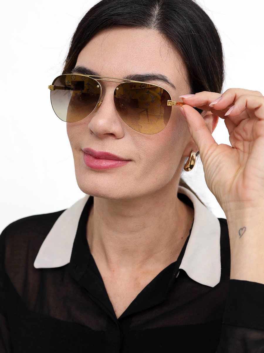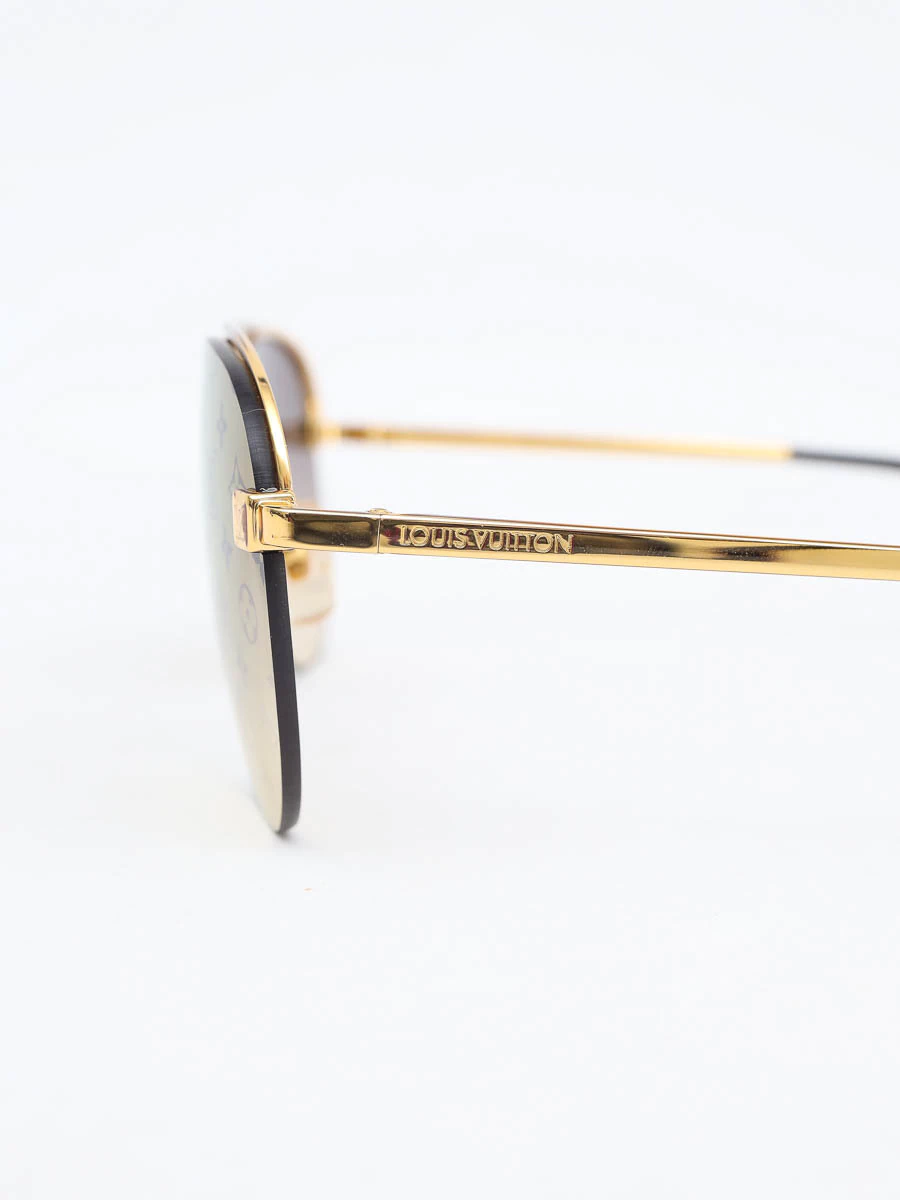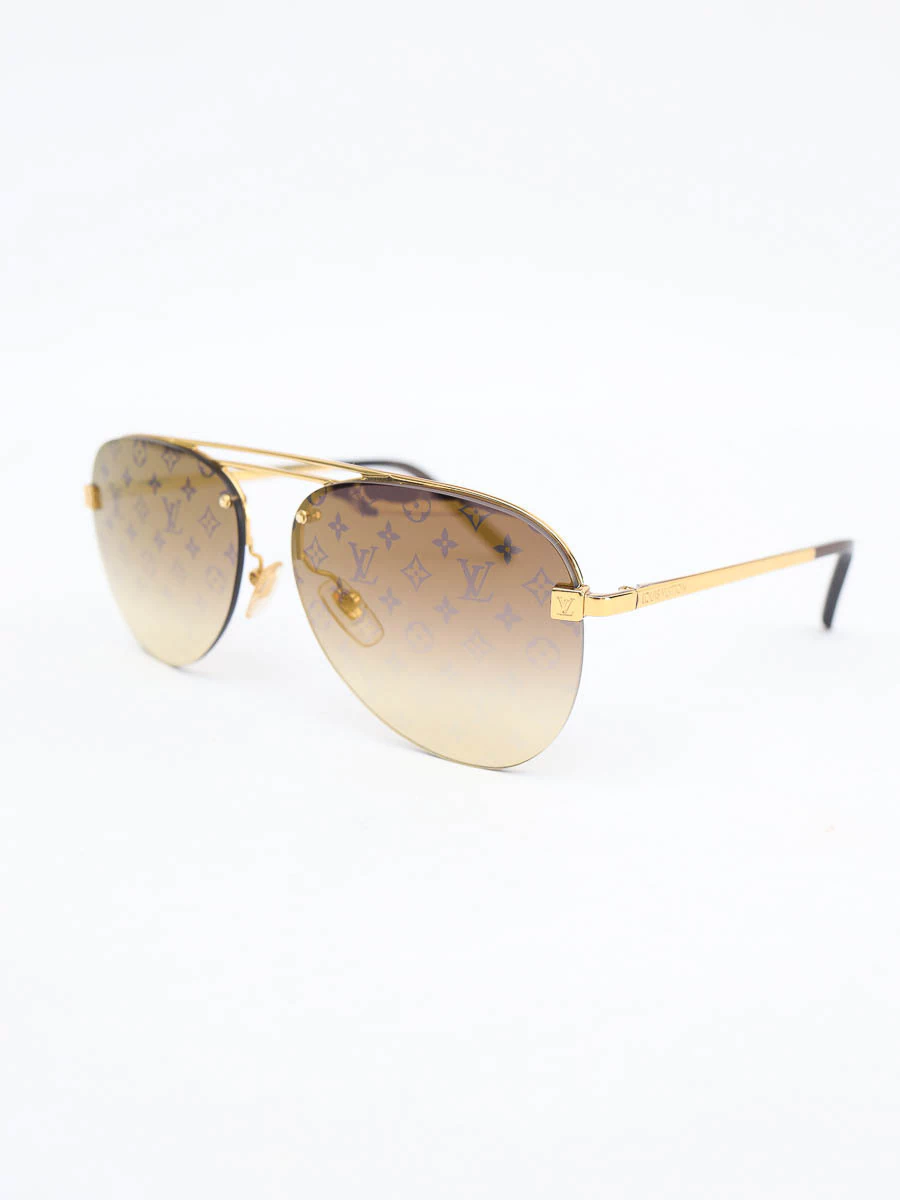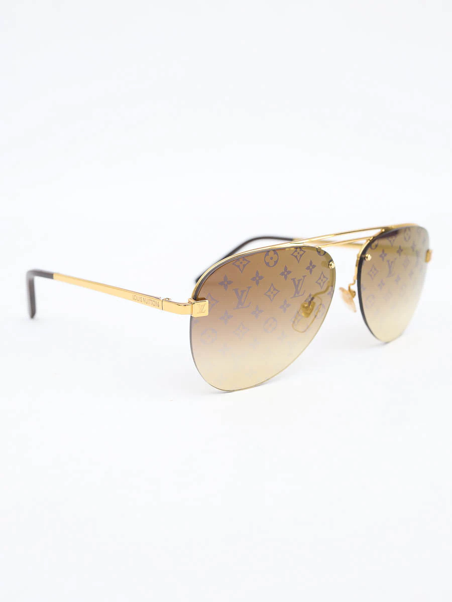 Óculos de Sol Original Louis Vuitton Z1020W com armação em metal dourada, hastes com pontas em acetato para maior conforto, lentes marrom degradê com monograma externo.