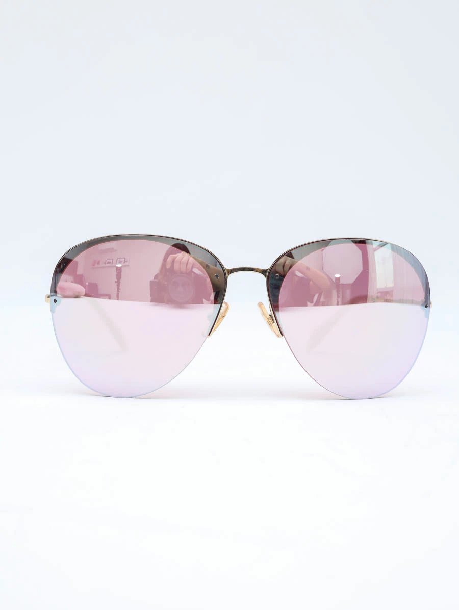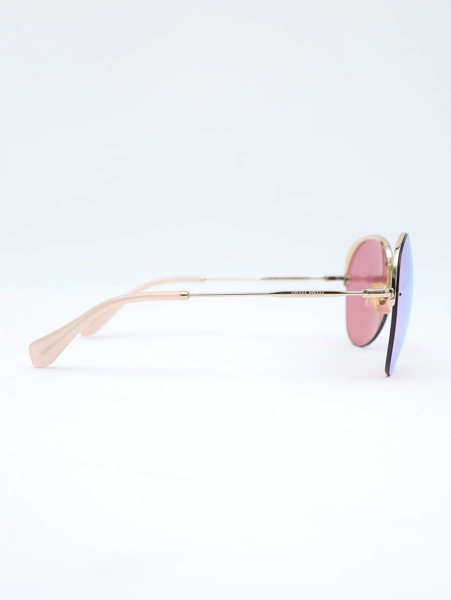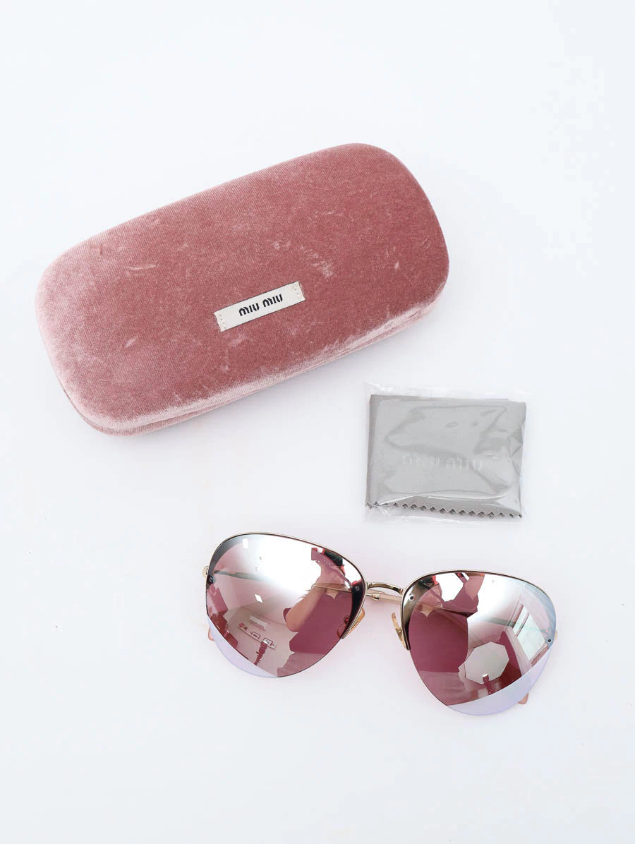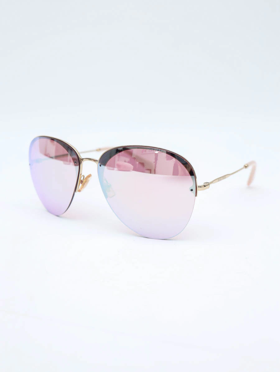 Óculos de Sol Original Miu Miu SMU 53Pcom armação em metal levemente douradas, hastes com pontas em acetato para maior conforto e lentes espelhadas. Seminovo em excelente estado de conservação, sem riscos na lente, armação sem sinais de uso visíveis, case com marquinhas de uso.