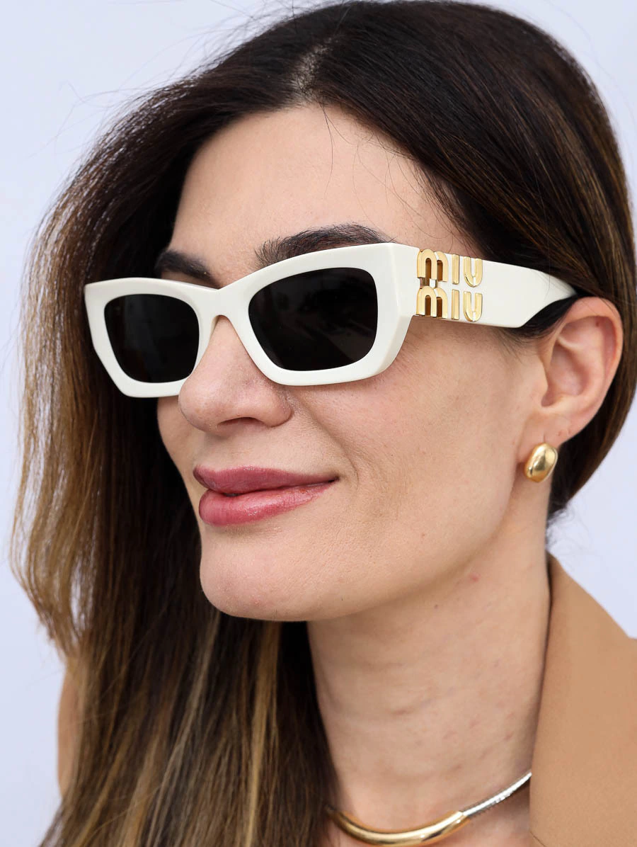 O Óculos de Sol Original Miu Miu SMU09W destaca-se pelo design moderno e sofisticado. Com formato cat-eye geométrico e armação branca, é perfeito para compor looks elegantes. As lentes escuras oferecem proteção UV e reforçam o contraste estiloso, enquanto o detalhe do logo Miu Miu dourado nas hastes completa o visual com exclusividade.