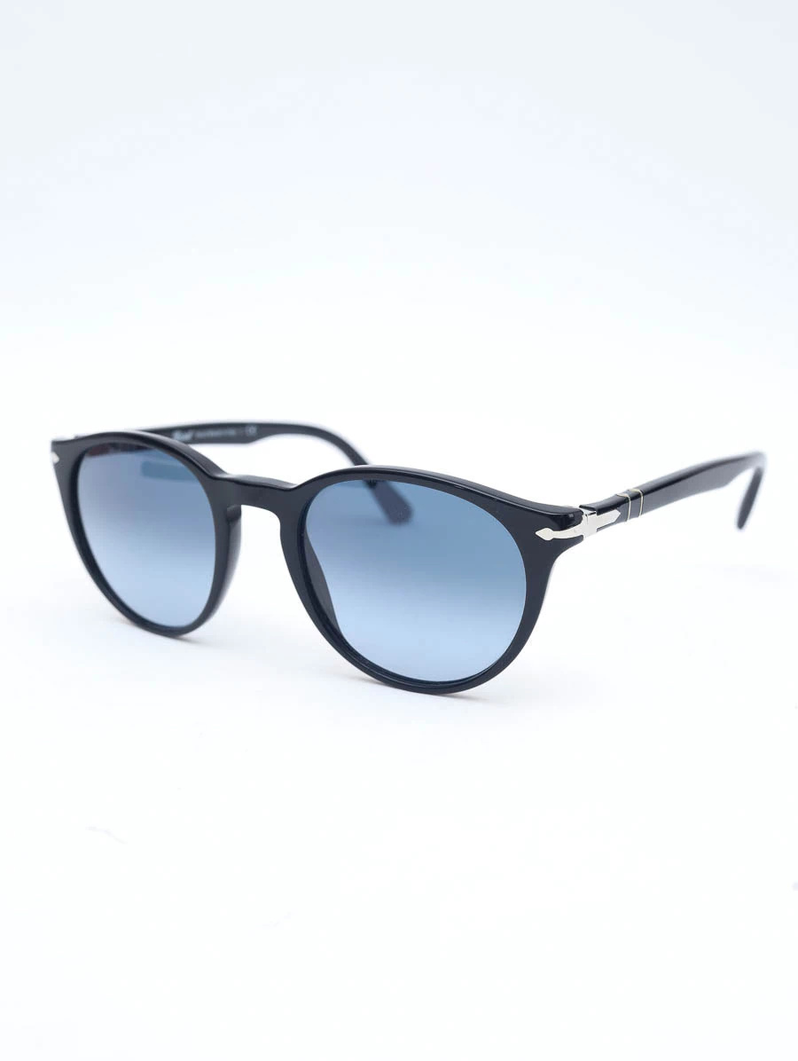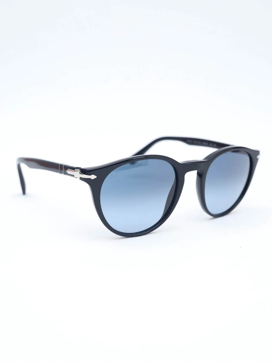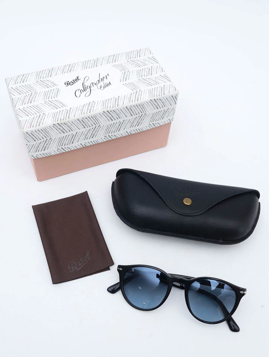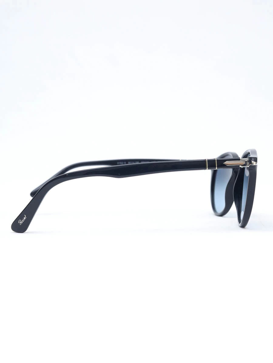 Óculos de Sol Seminovo Original Persol 3152S com armação em acetato na cor preta e lentes na cor azul que se sobressaem. Apresenta logotipo da marca e detalhes em metais prateados nas hastes.