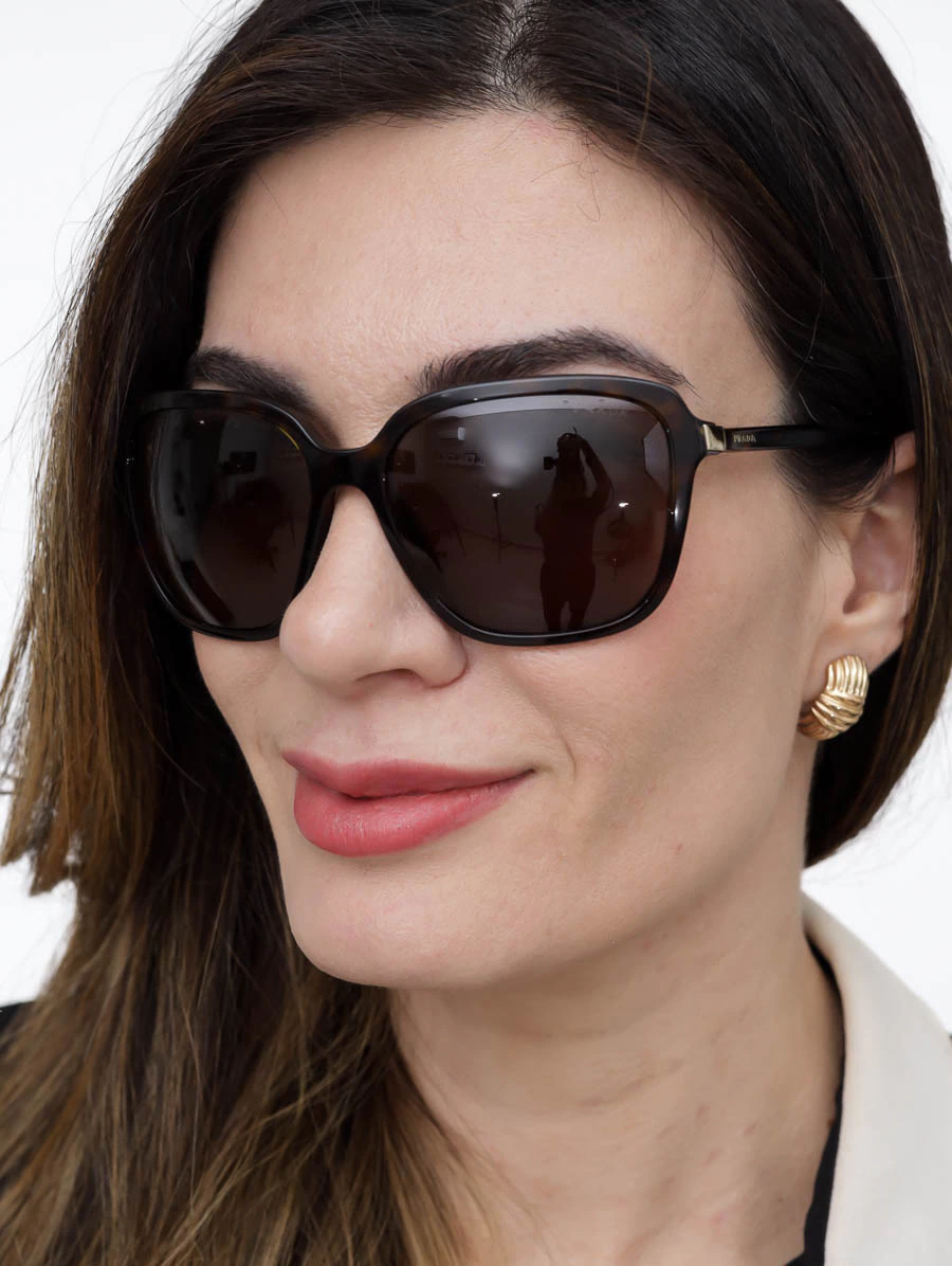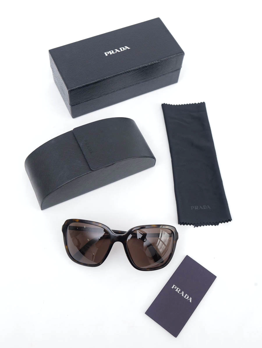 Óculos de Sol Seminovo Original Prada SPR 10V com armação em acetato marrom tortuga, detalhes em metal nas laterais, lentes marrom e hastes com logo Prada. Em excelente estado de conservação, sem riscos nas lentes.