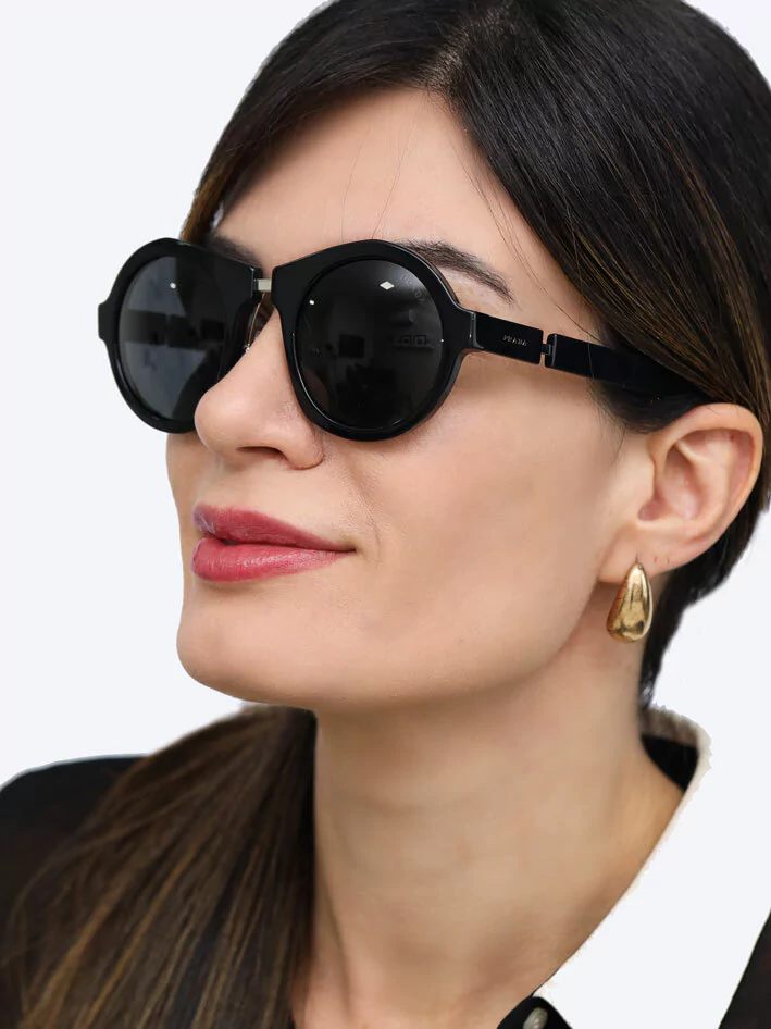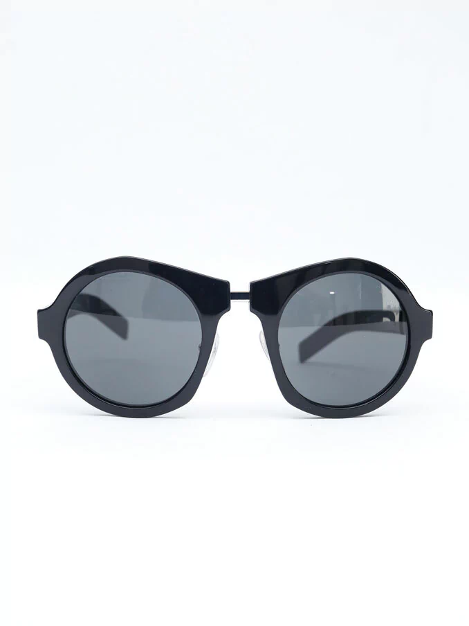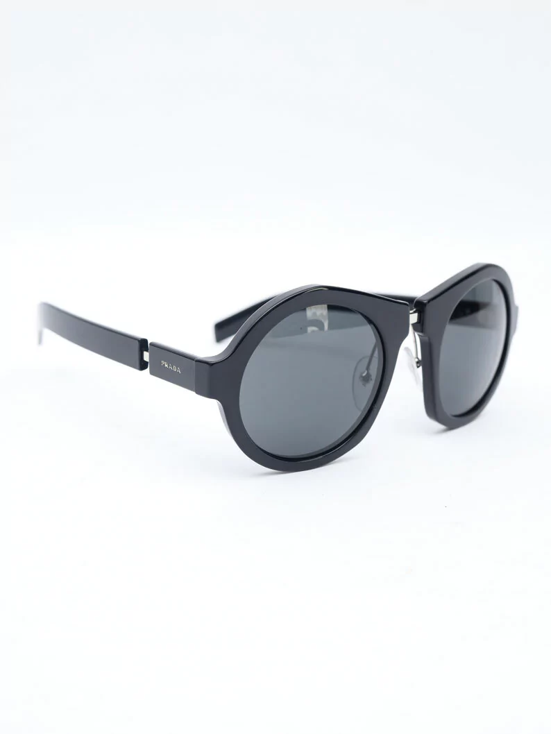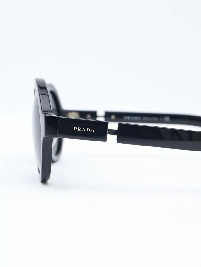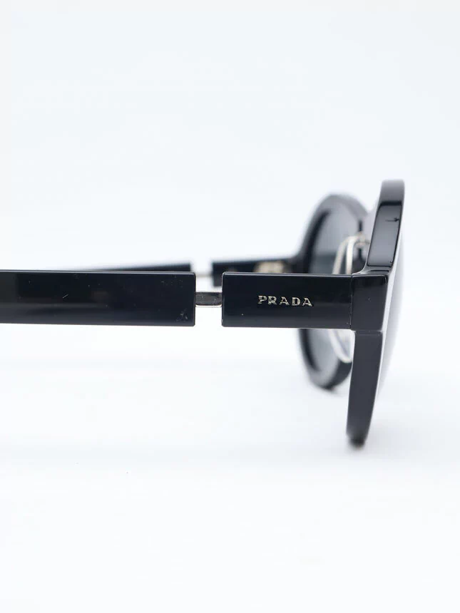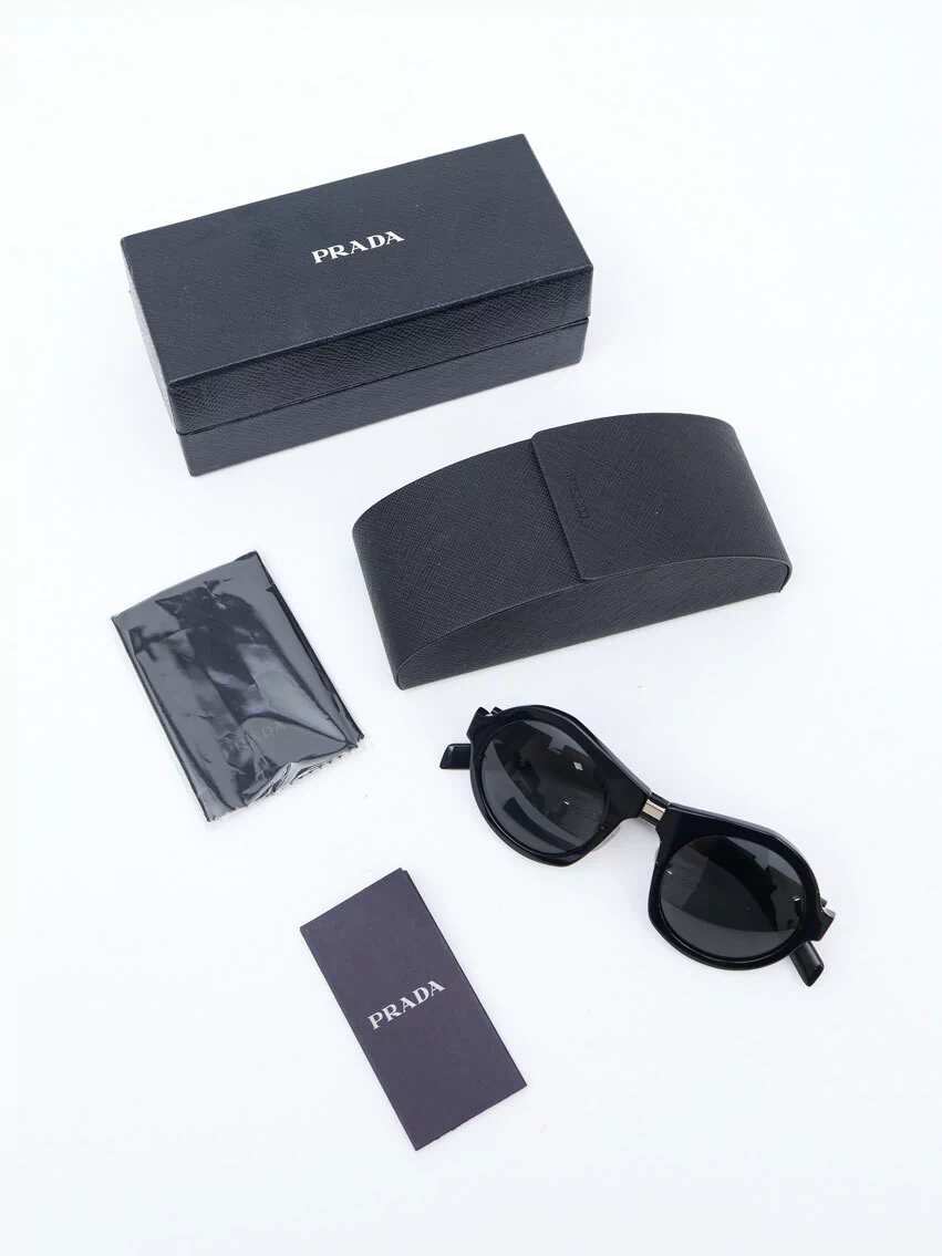 Óculos de Sol Prada SPR 10X com armação em acetato e lentes na cor preta, o item apresenta alguns detalhes em metal nas hastes e na frente do óculos. Em excelente estado de conservação, não apresenta riscos nas lentes.