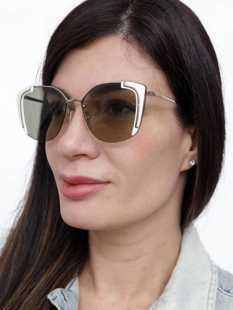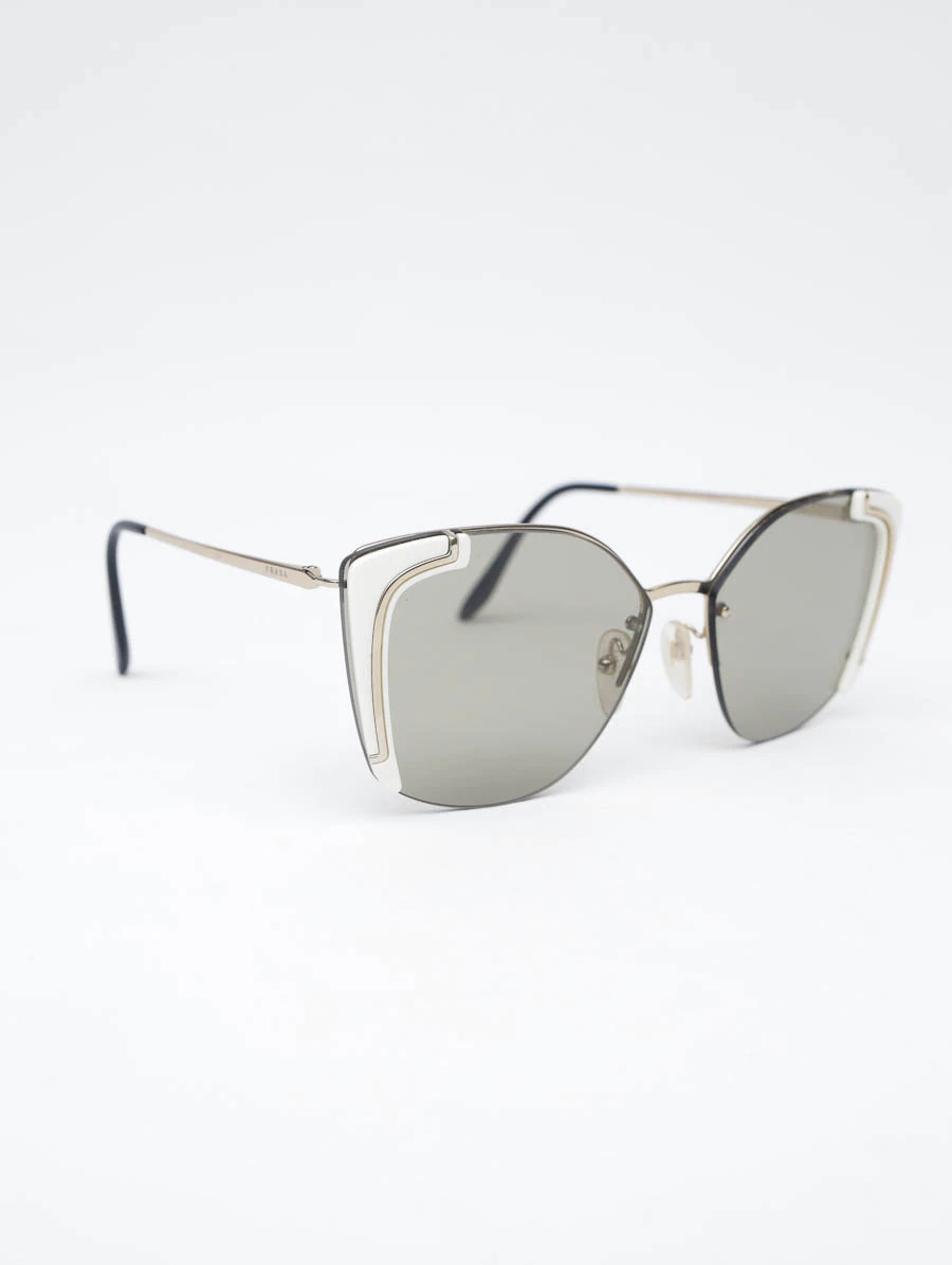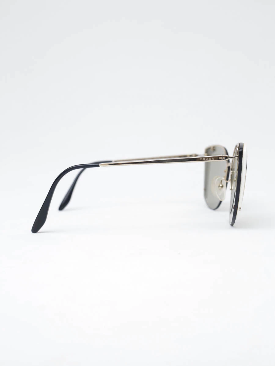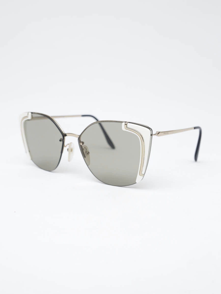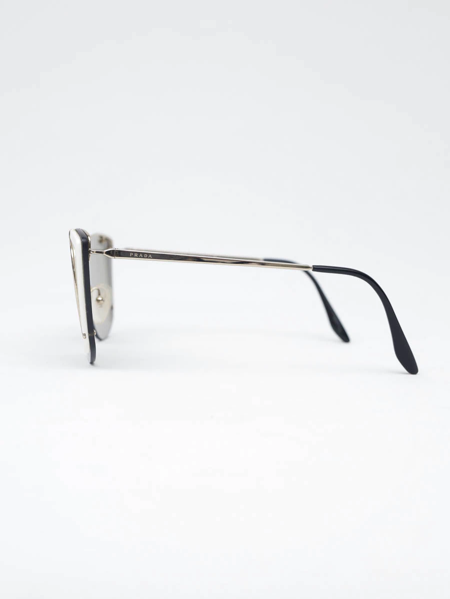 Óculos de Sol Prada SPR 59Vcom armação em metal dourado e lentes com um tom levemente escuro. Apresenta detalhes em acetato na cor branca nas laterais. Está em ótimo estado de conservação, apresenta mínimos risquinhos na armação.