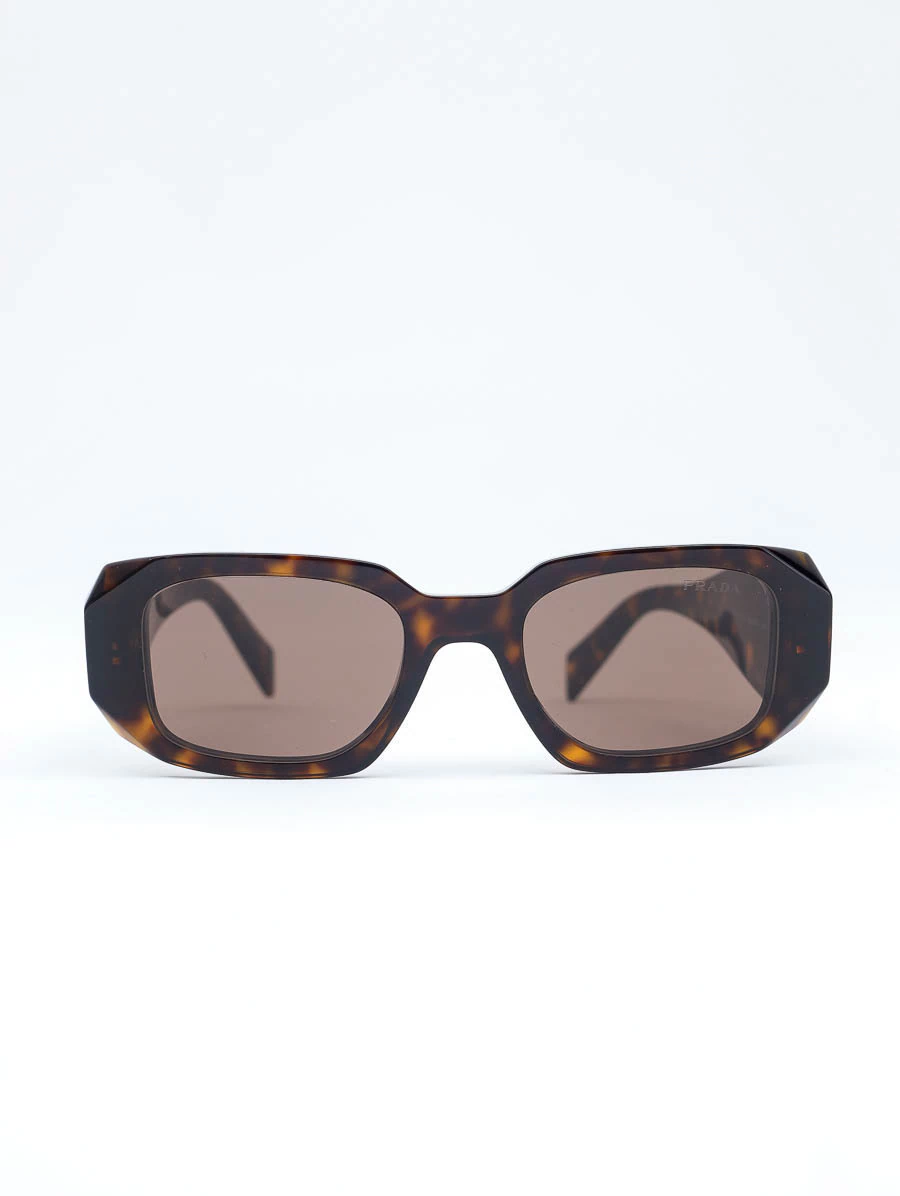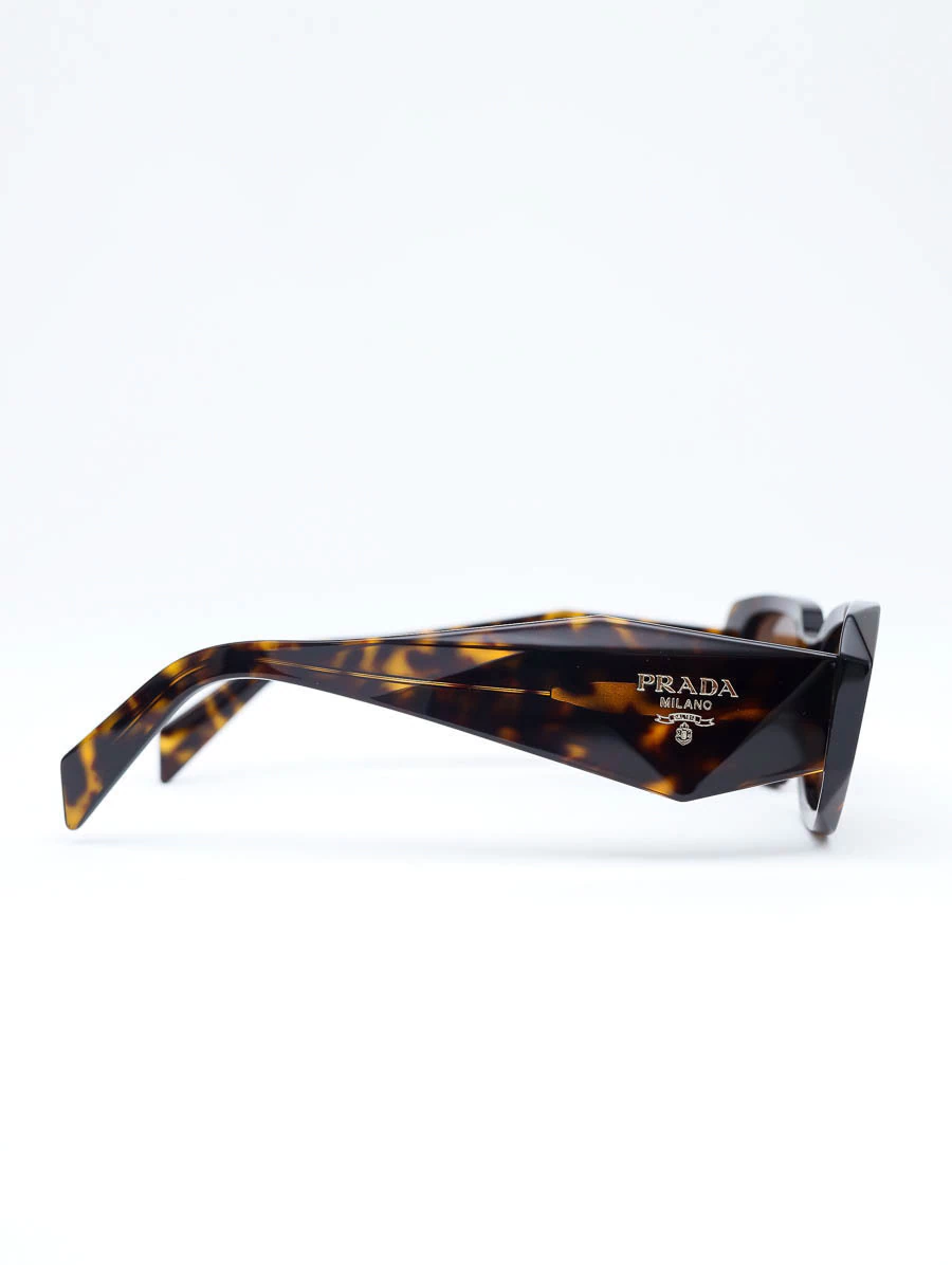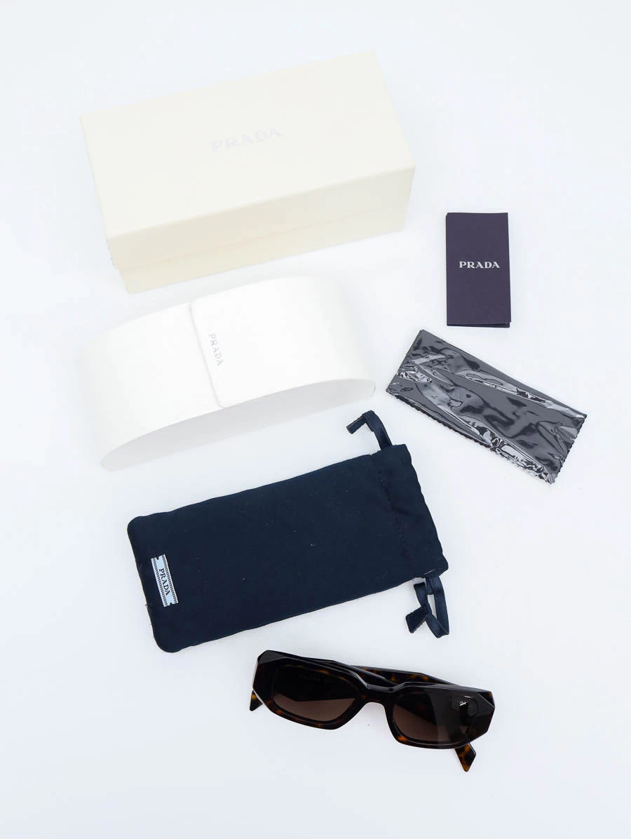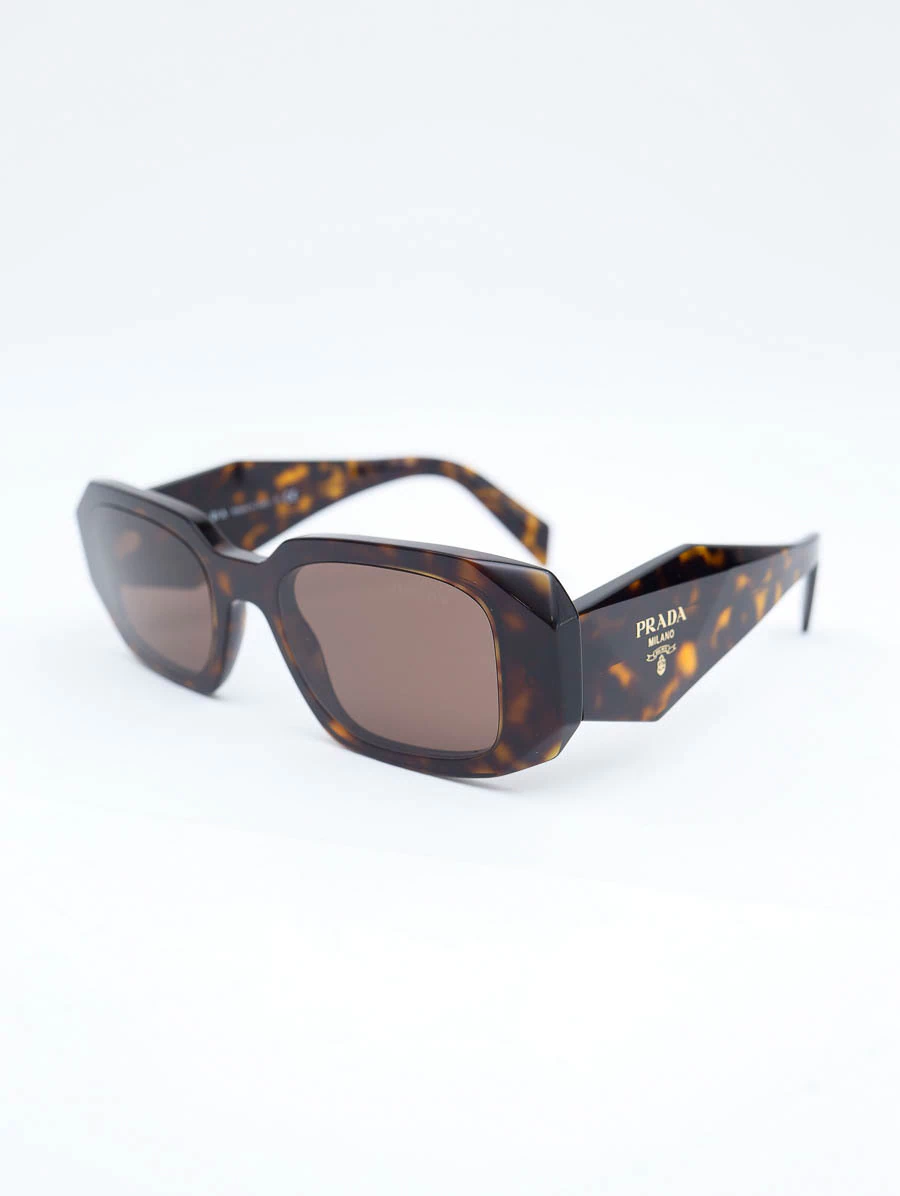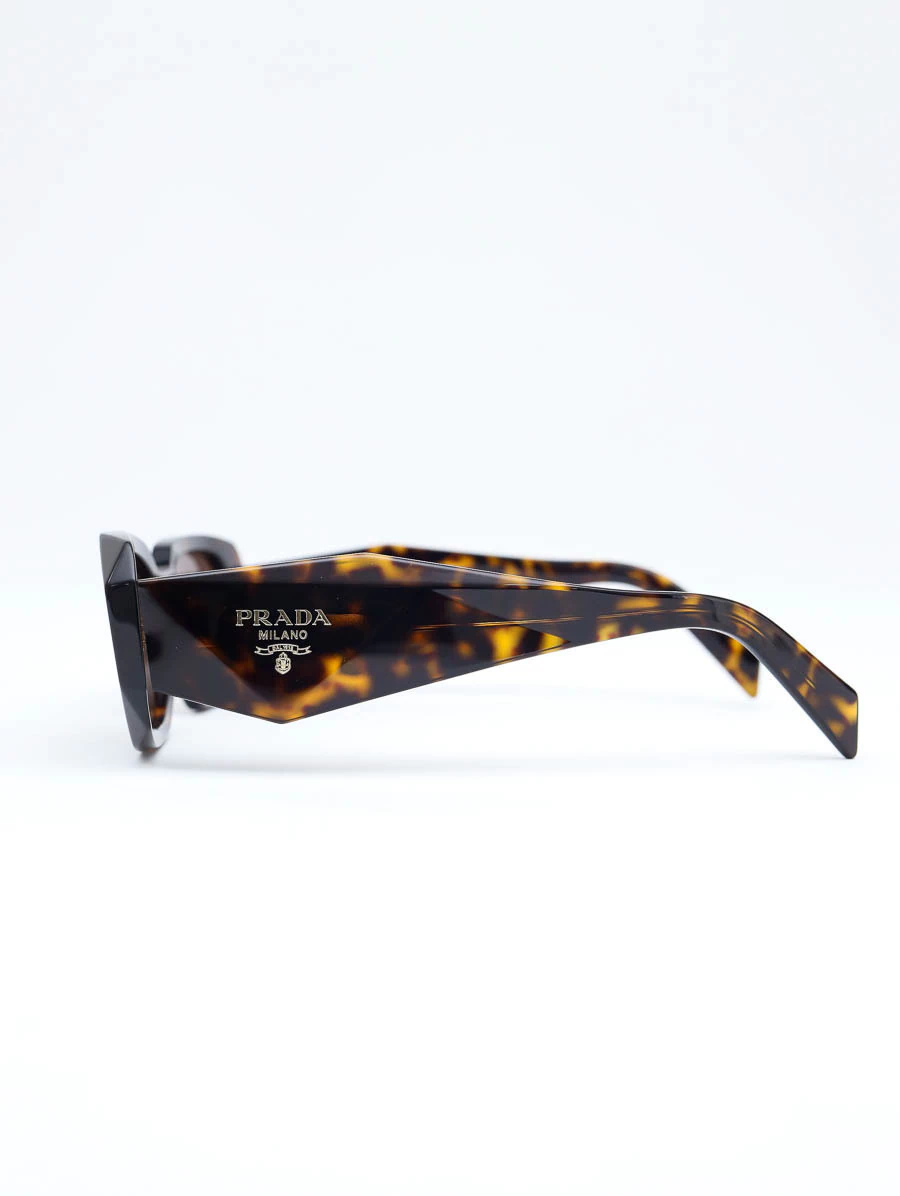 Óculos de Sol Prada SPR17W com armação em acetato na cor marrom com estampa tortuga. Apresenta lentes marrom e detalhe nas hastes com logo Prada.
