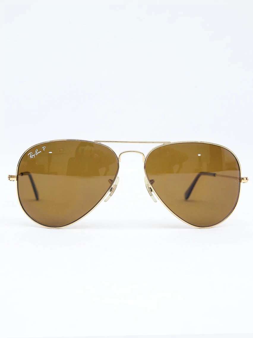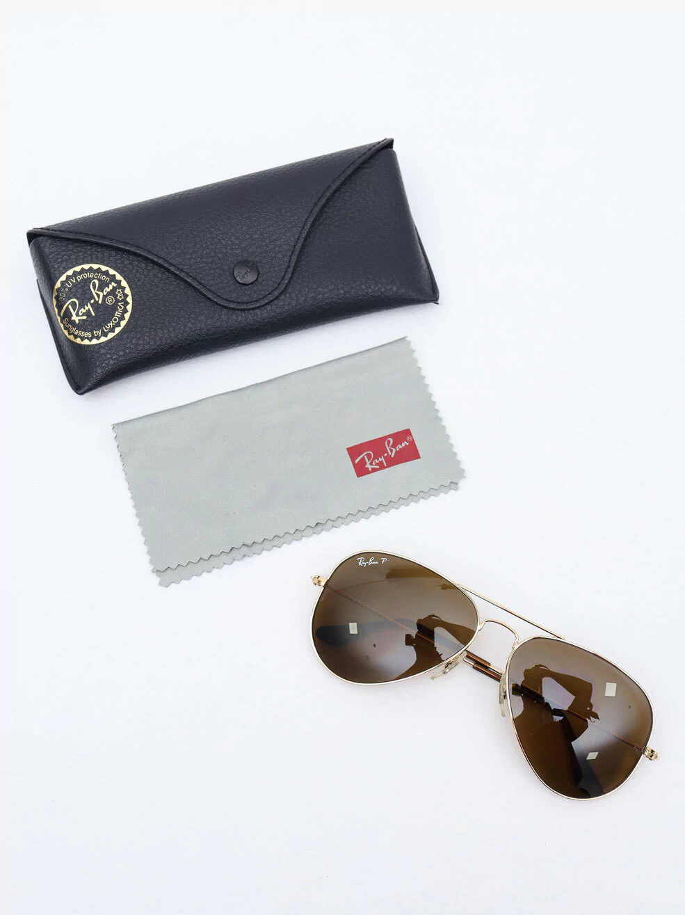 Óculos de Sol Original Ray-Ban Aviador com armação em metal na cor dourada e lentes na cor marrom, detalhe na ponta das hastes em acetato e logo Ray-Ban nas laterais das lentes.