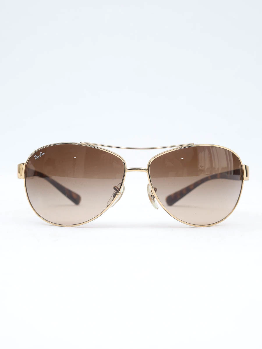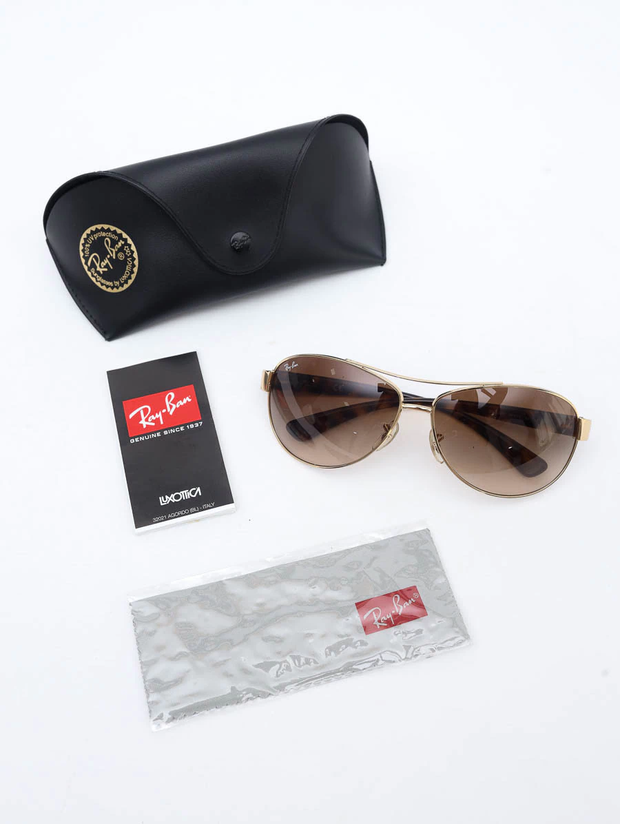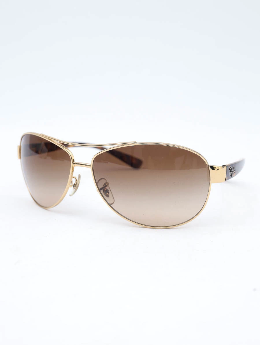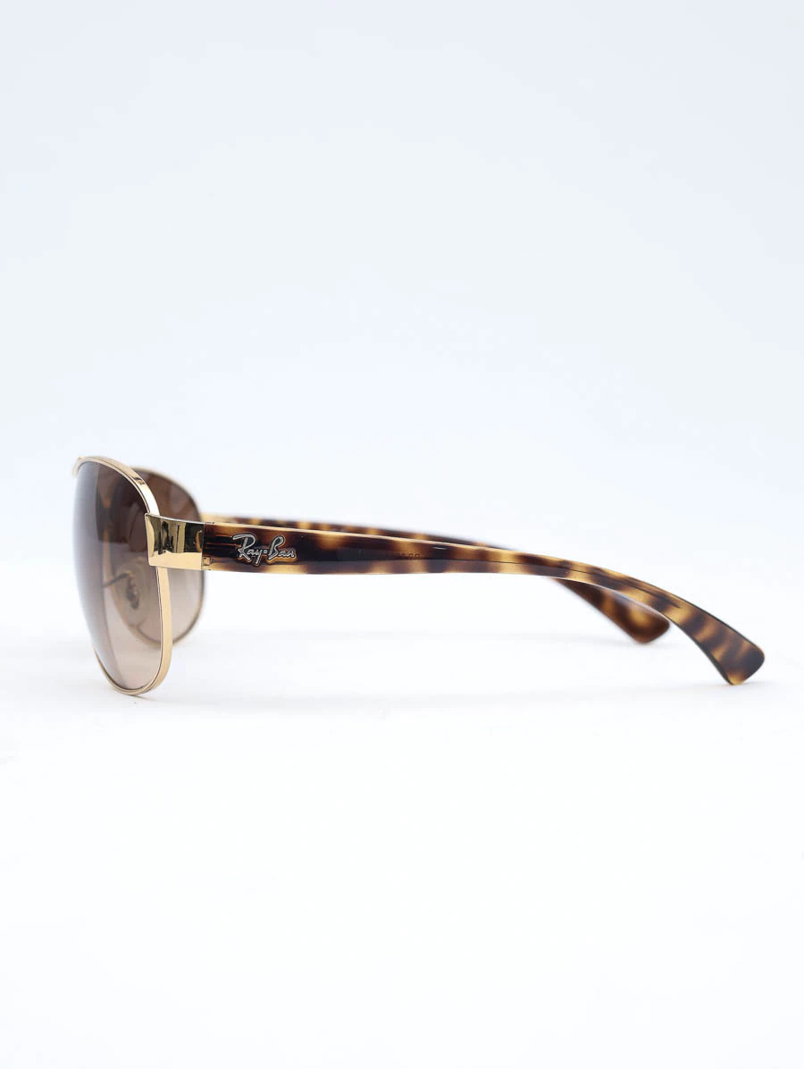 Óculos de Sol Seminovo Original Ray-Ban RB 3386 com armação em metais dourados, lentes em degradê na cor marrom e hastes em acetato tortuga.