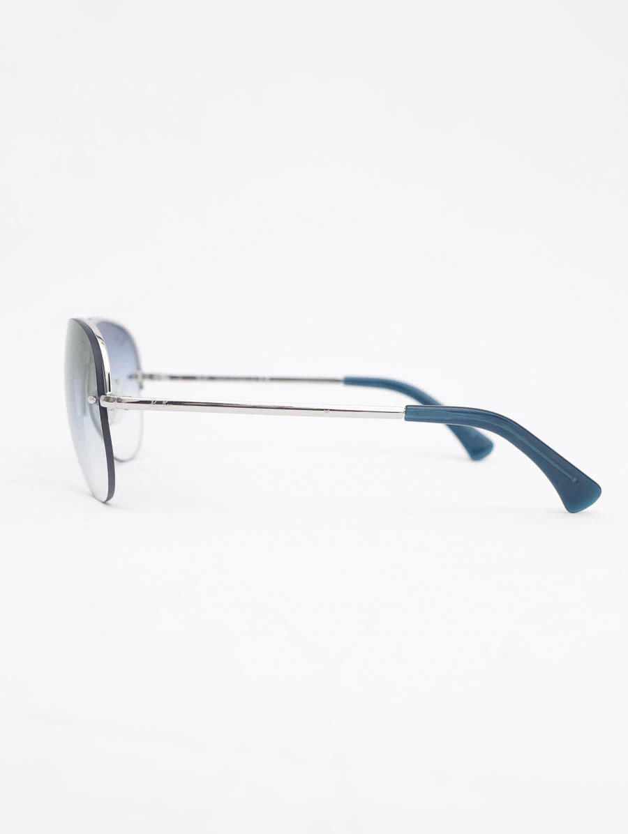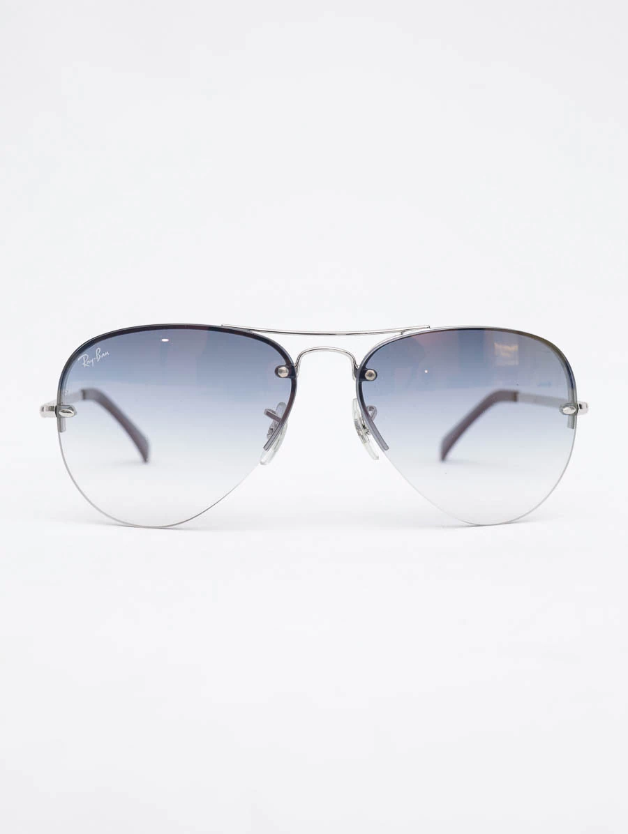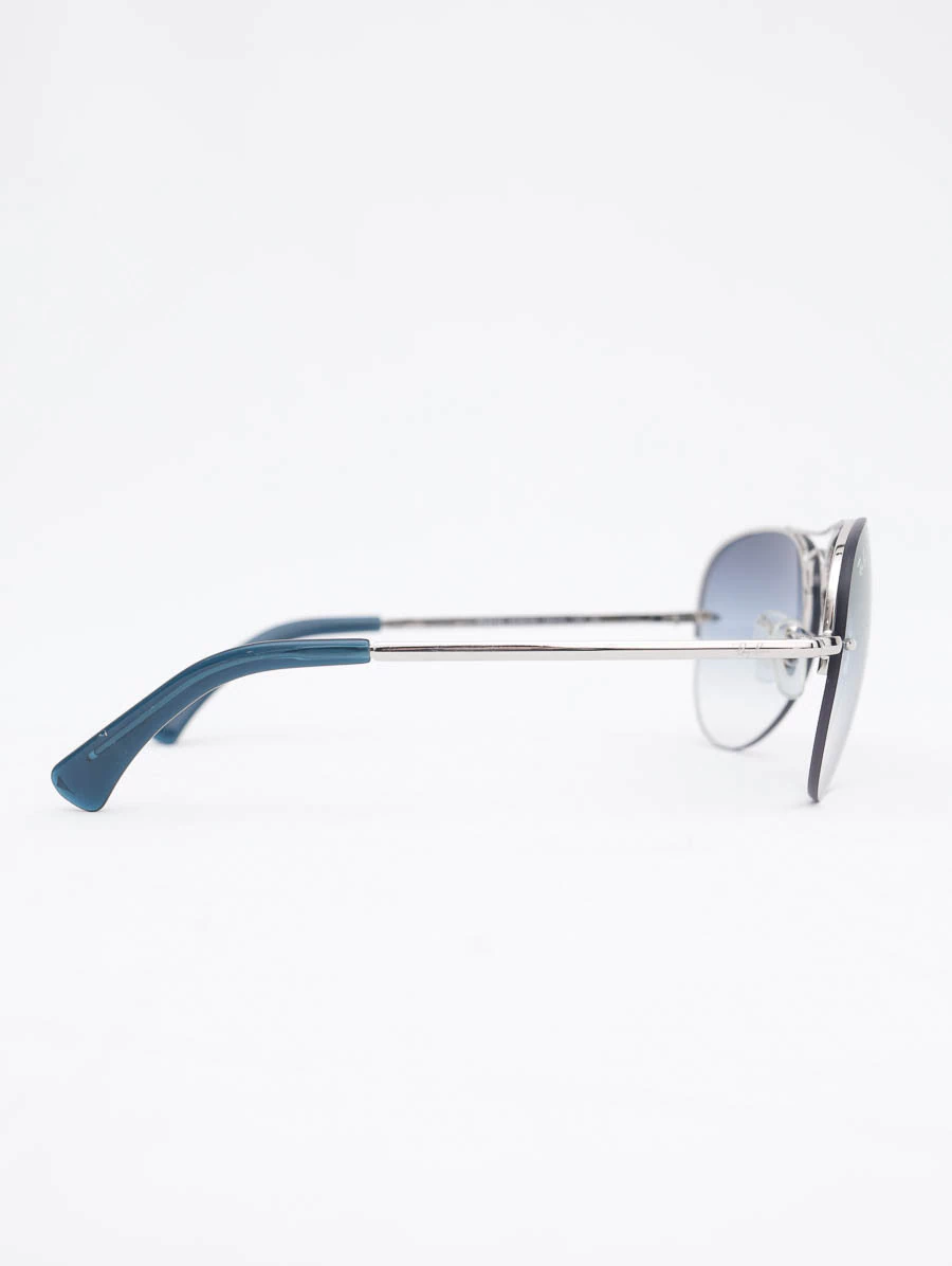 Óculos de Sol Ray-Ban RB 3449com armação em metal prata. Apresenta lentes em degradê azuladas e detalhe na ponta das hastes em acetato.